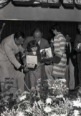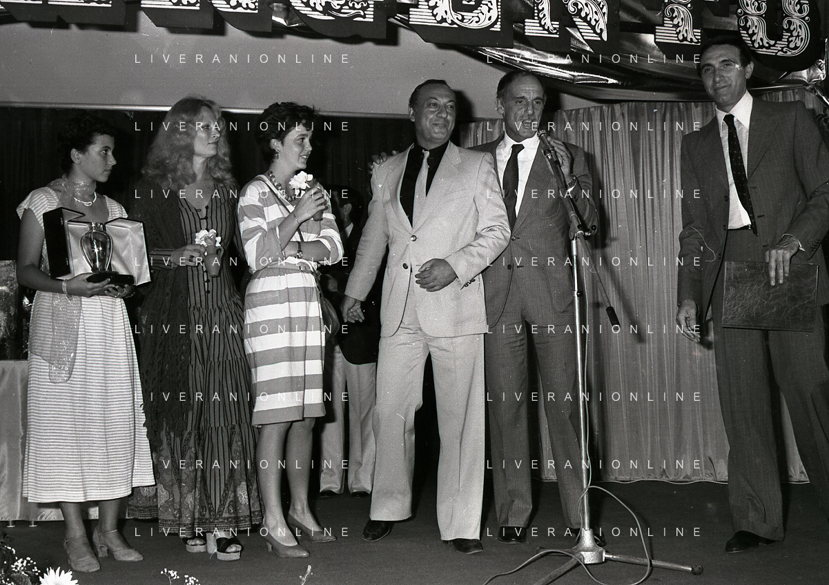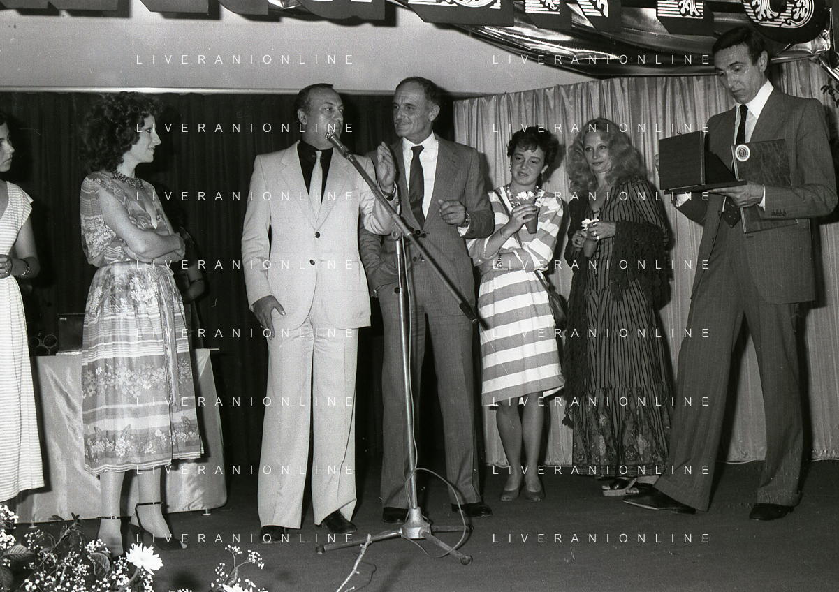 RETROSPETTIVA PHILIPPE LEROY ATTORE NELLA FOTO PHILIPPE LEROY A TAORMINA NELL'ANNO 1980 AL PREMIO DAVID DI DONATELLO CON PIPPO BAUDO E IL REGISTA DE SILVESTRO RINO AG ALDO LIVERANI SAS