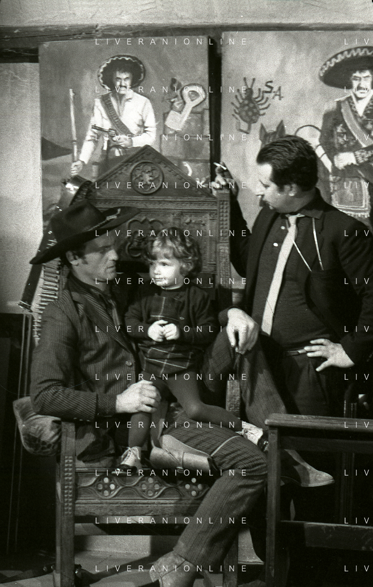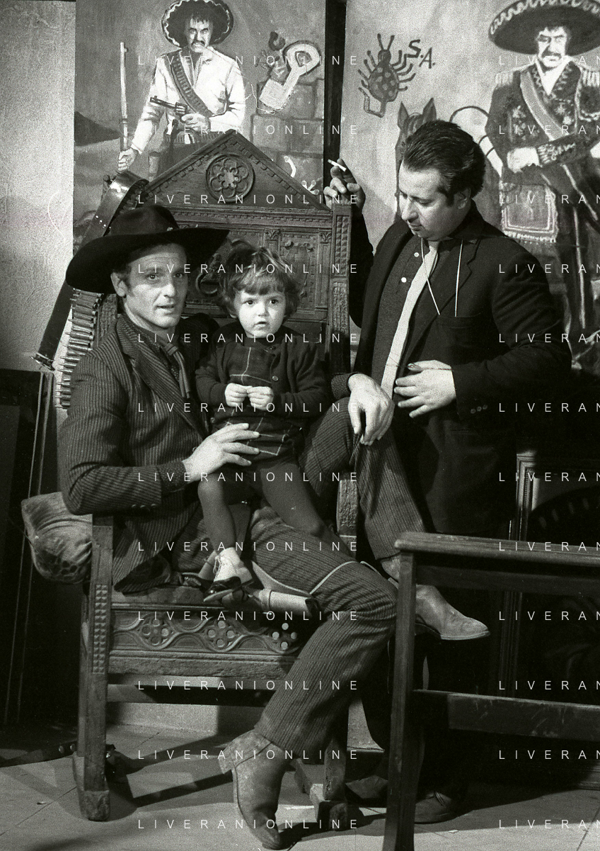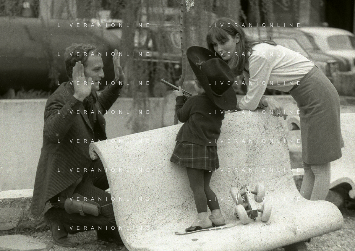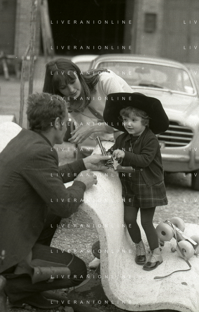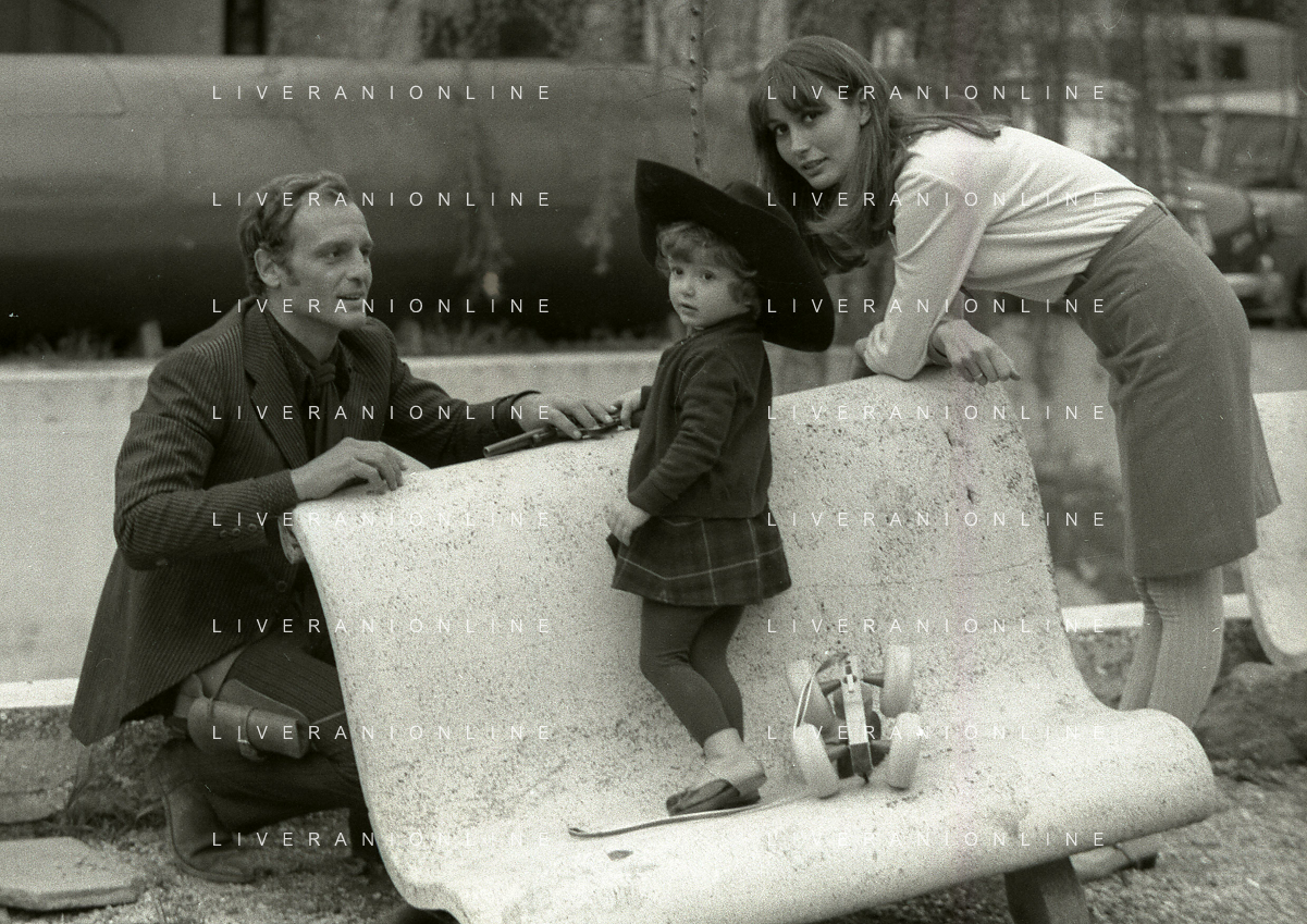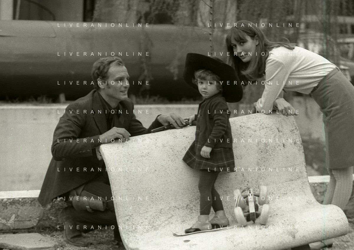 RETROSPETTIVA PHILIPPE LEROY ATTORE NELLA FOTO PHILIPPE LEROY CON LA FIGLIA PHILIPPINE E LA COMPAGNA FRANCOIS LAURENT SUL SET DEL FILM “YANKEE“ A ROMA NELL'ANNO 1967 AG ALDO LIVERANI SAS