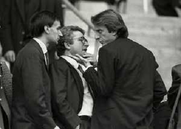 14-10-1989 BOLOGNA PARTITA AMICHEVOLE NAZIONALE ITALIANA -BRASILE 0-1 NELLA FOTO GIANNI PETRUCCI-ANTONIO MATARRESE E LUCA CORDERO DI MONTEZEMOLO IN TRIBUNA AG ALDO LIVERANI SAS