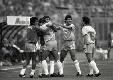 14-10-1989 BOLOGNA PARTITA AMICHEVOLE NAZIONALE ITALIANA -BRASILE 0-1 NELLA FOTO ABBRACCI GIOCATORI BRASILE DOPO IL GOAL AG ALDO LIVERANI SAS