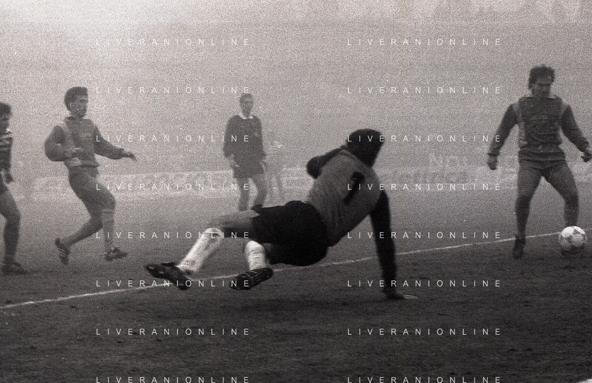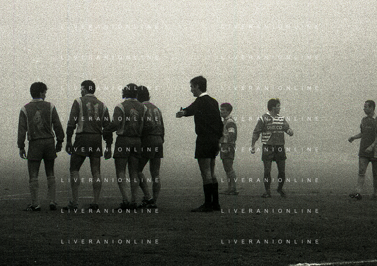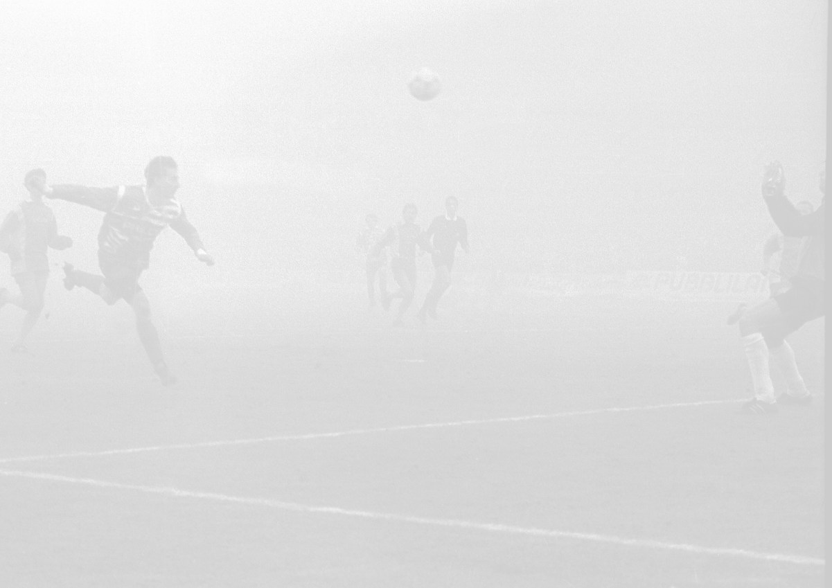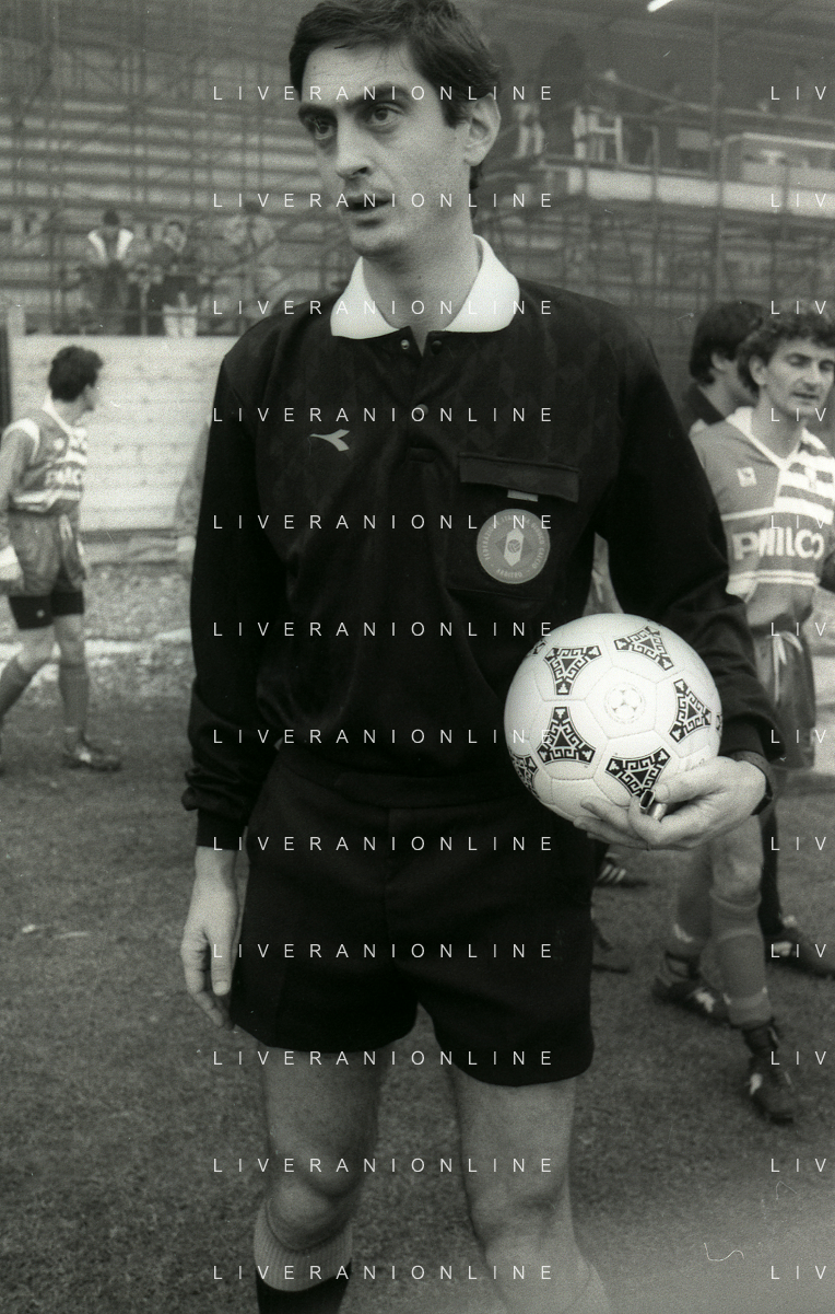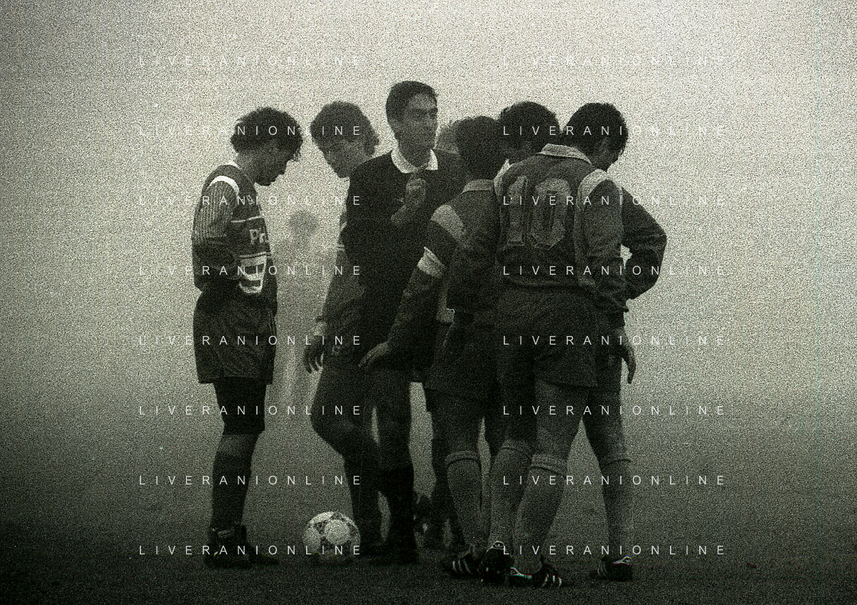 08-01-1989 MONZA CAMPIONATO DI CALCIO SERIE B MONZA-LICATA 4-0 NELLA FOTO L'ARBITRO ROBERT BOGGI CON GIUSEPPE ROMA IN MEZZO ALLA NEBBIA AG ALDO LIVERANI SAS