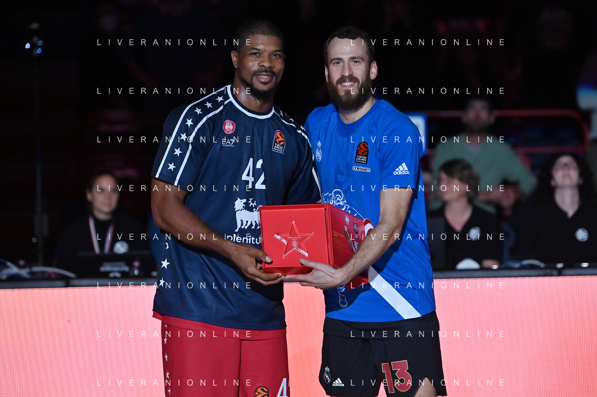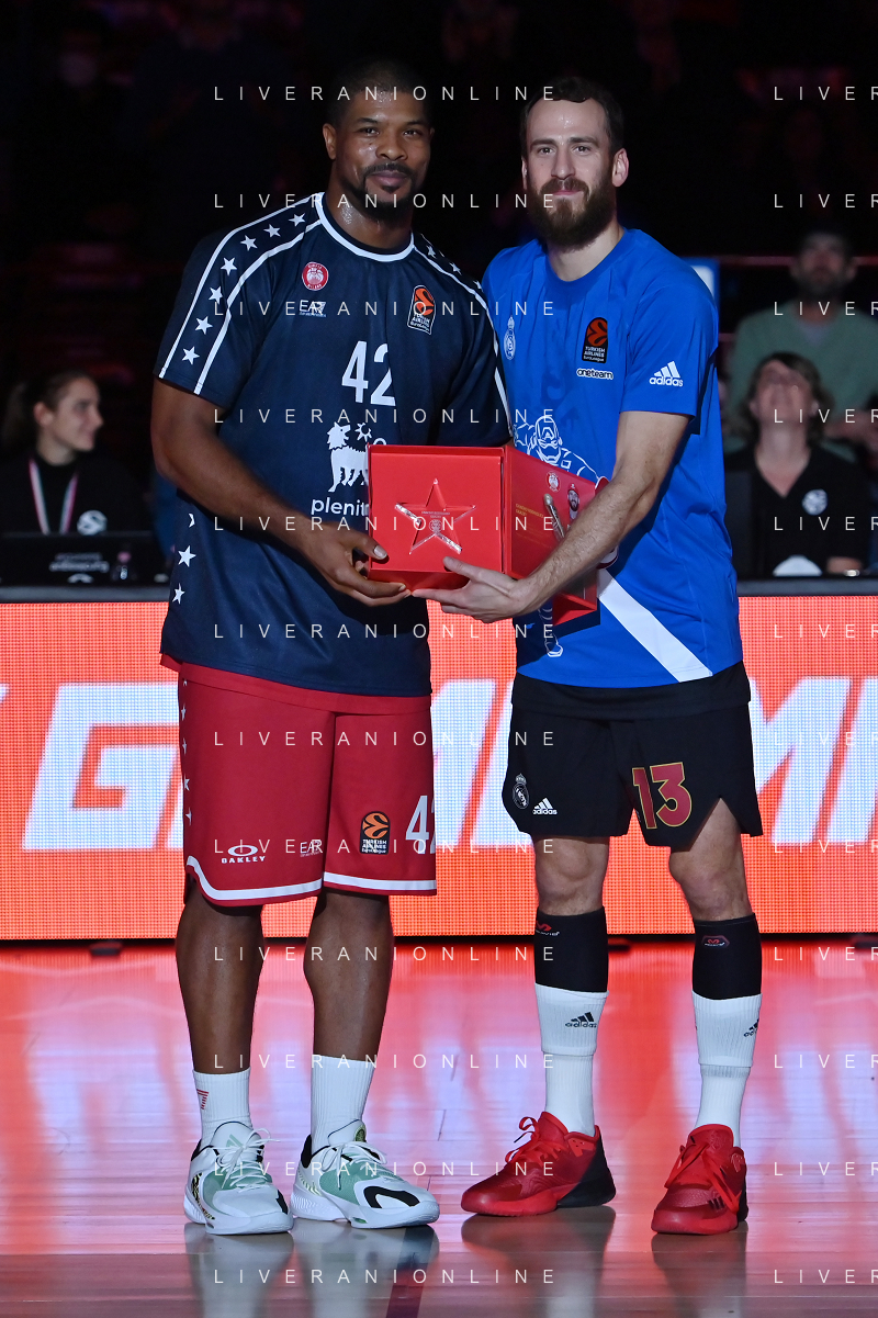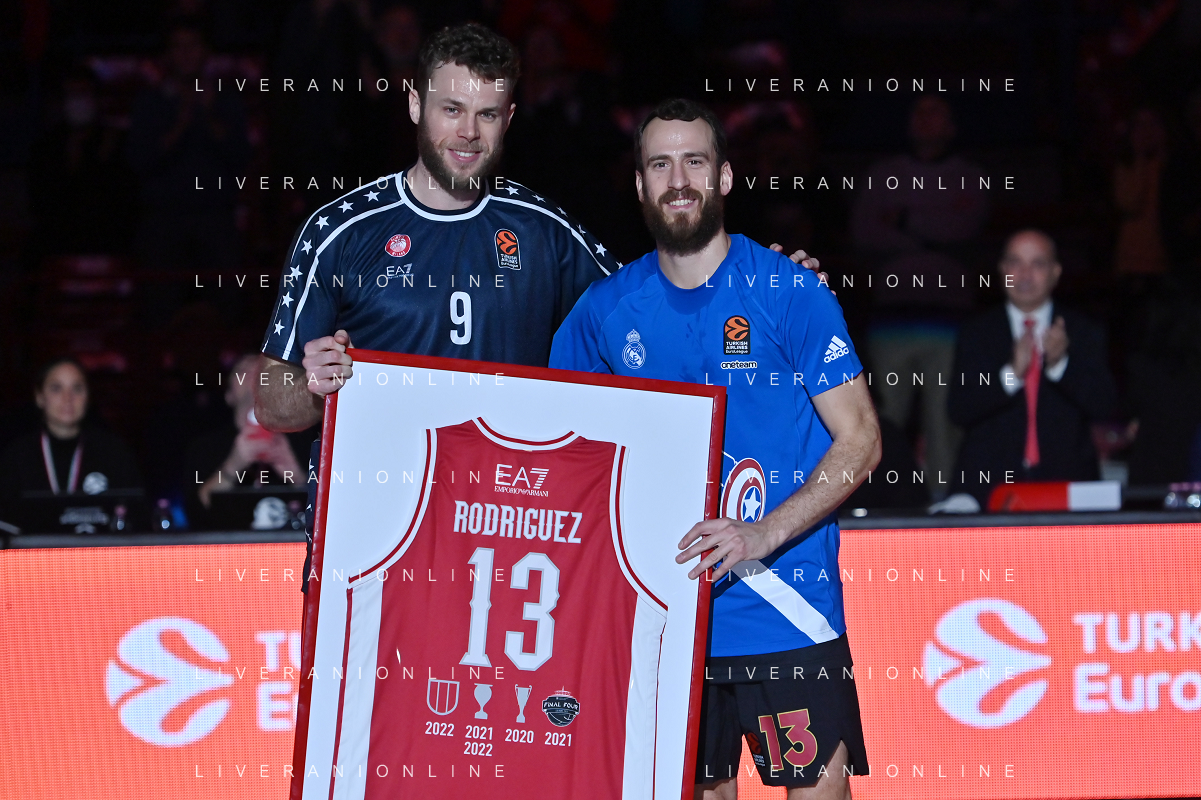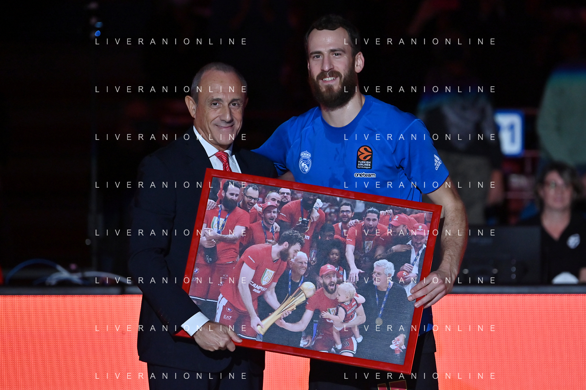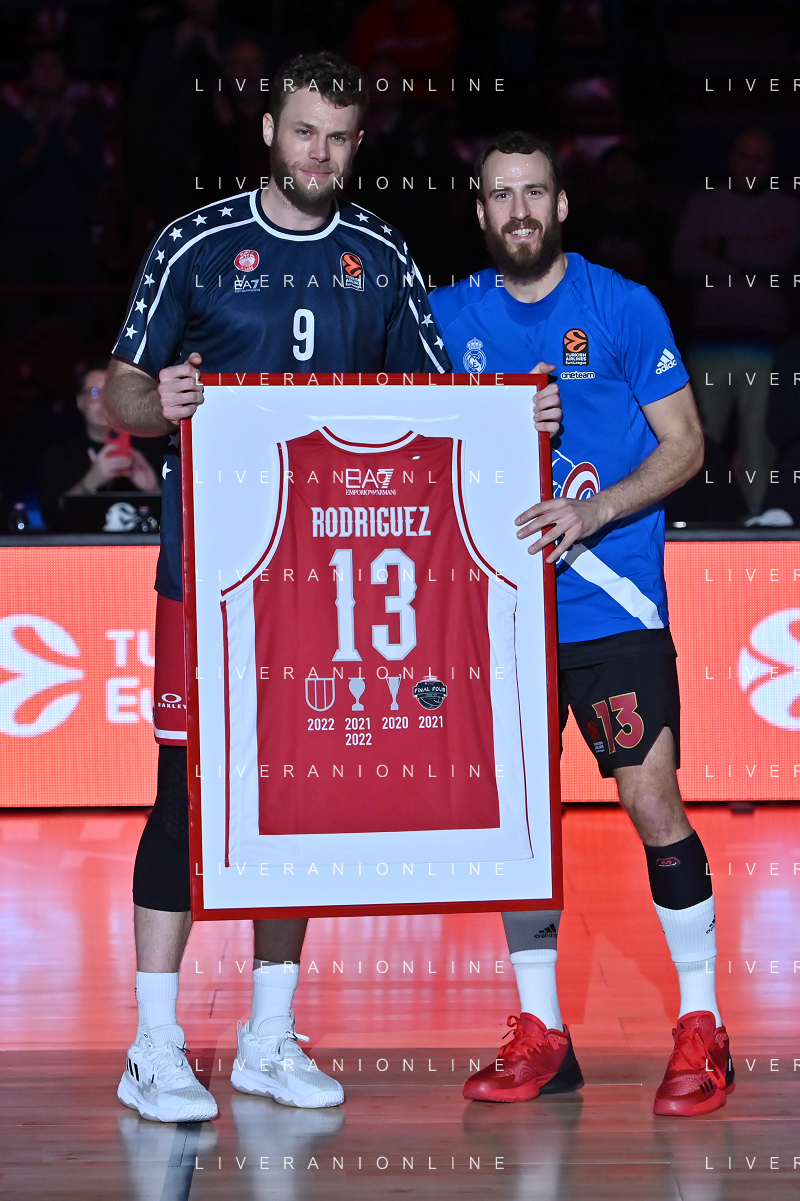 TVRG omaggio a Sergio Rodriguez (Real Madrid), da SX Nicolo' Melli (Olimpia Milano) e Sergio Rodriguez (Real Madrid) EA7 Emporio Armani Milano vs Real Madrid Assago (MI) 03-11-2022 Mediolanum Forum Turkish Airlines Euroleague 6a giornata regular season foto Roberto Garavaglia/ag. Aldo Liverani sas / AGENZIA ALDO LIVERANI SAS