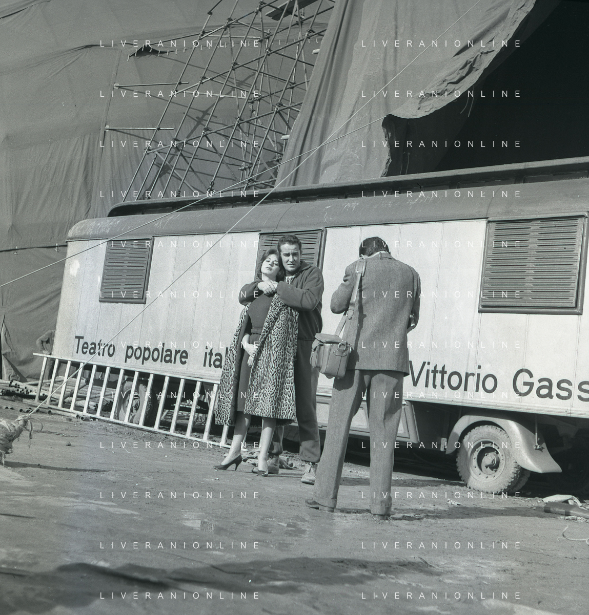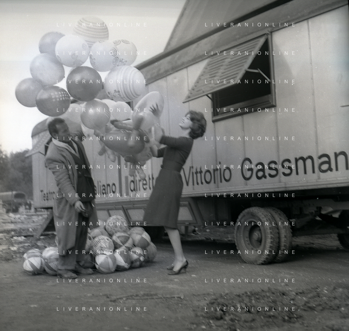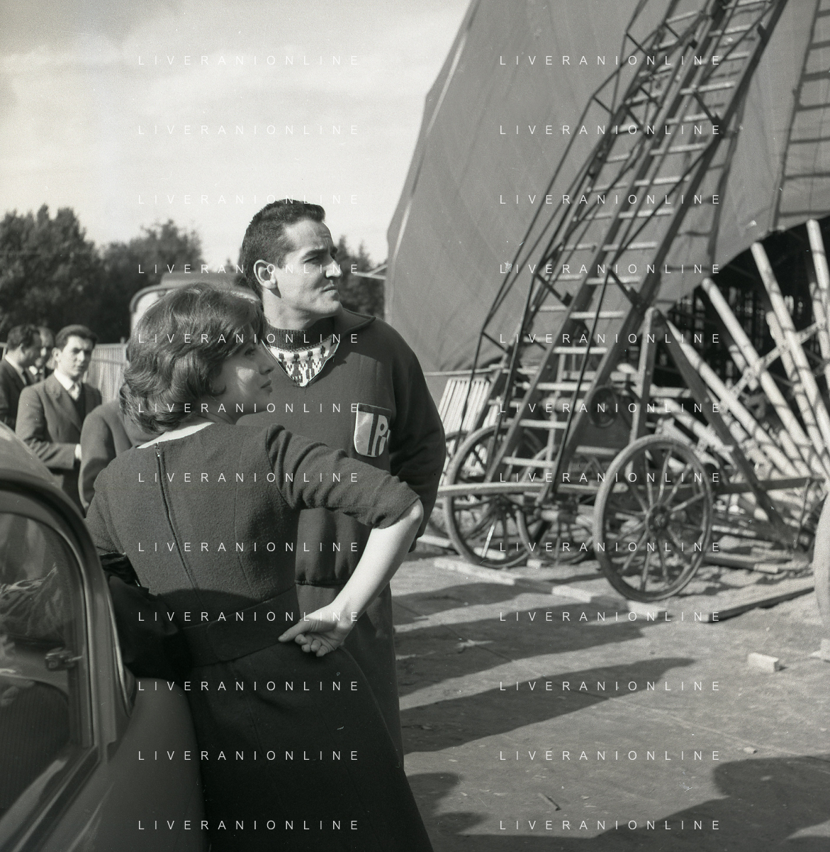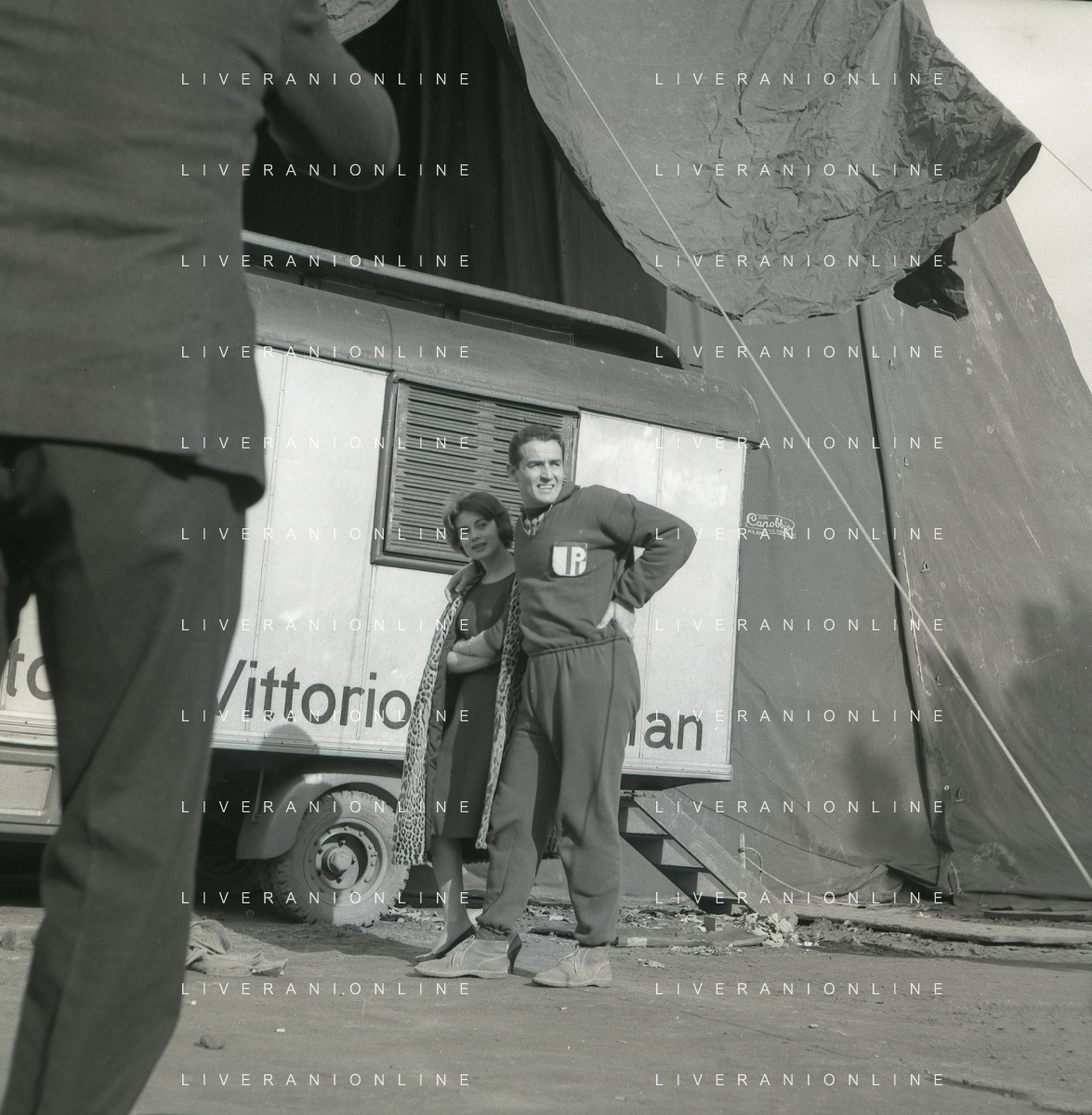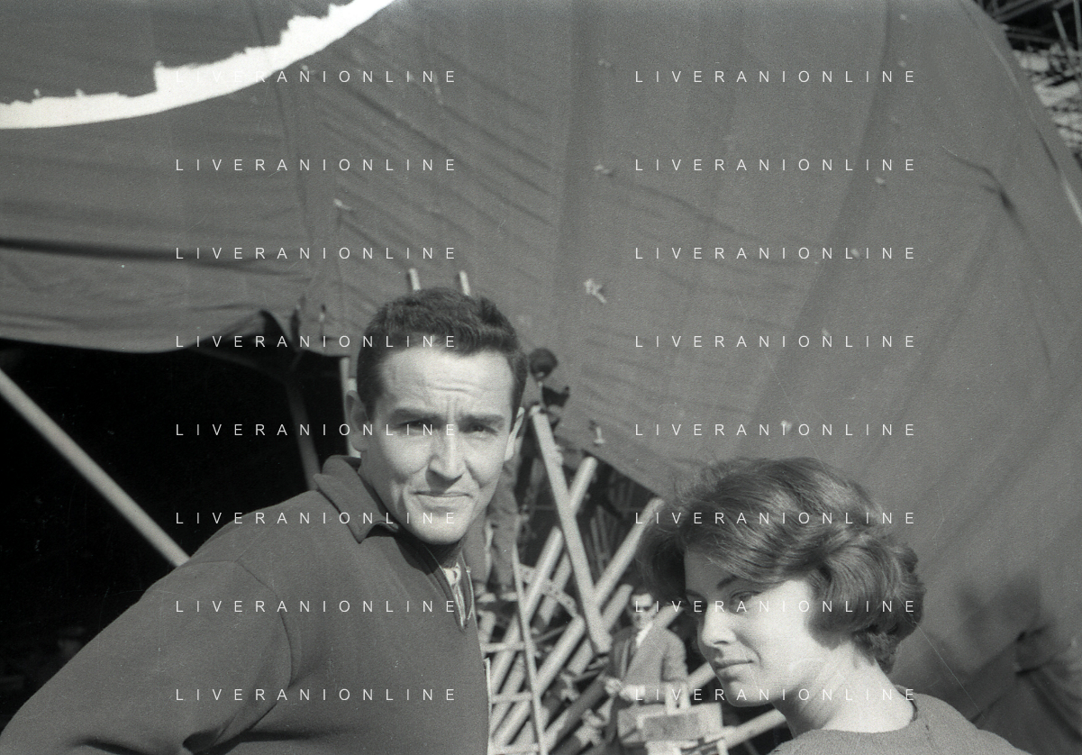 1960 ROMA -PARCO DEI DAINI IL TEATRO CIRCO POPOLARE DI VITTORIO GASSMAN NELLA FOTO ANNA MARIA FERRERO CON VITTORIO GASSMAN FOTO SANDRO VESPASIANI-AG ALDO LIVERANI SAS