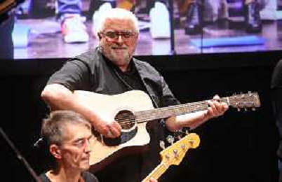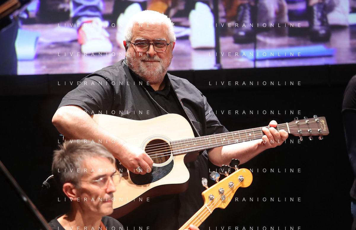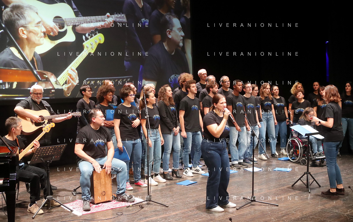 IMOLA 05 11 2022 TEATRO EBE STIGNANI "UNA DOMANDA A DON MATTEO"I GIOVANI DIALOGANO CON IL CARDINALE MATTEO ZUPPI NELLA FOTO CORO SAN GIACOMO CON OSPITE VESCOVO DI IMOLA GIOVANNI MOSCIATTI CON LA CHITARRA FOTO GIANNI SANNA-AG ALDO LIVERANI SAS