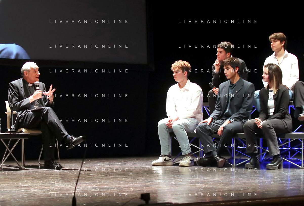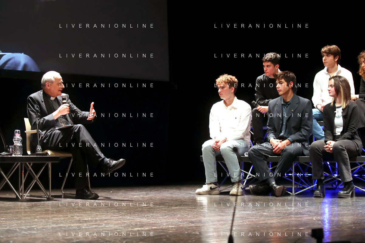 IMOLA 05 11 2022 TEATRO EBE STIGNANI "UNA DOMANDA A DON MATTEO"I GIOVANI DIALOGANO CON IL CARDINALE MATTEO ZUPPI NELLA FOTO CARDINALE MATTEO ZUPPI CON I GIOVANI FOTO GIANNI SANNA-AG ALDO LIVERANI SAS
