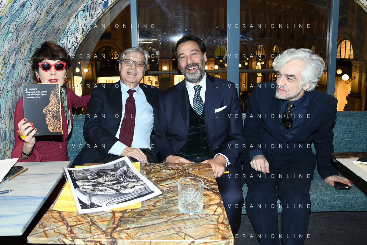 TVRG Mostra Jo Endoro nella foto da SX Elisabetta Sgarbi, Vittorio Sgarbi, Jo Endoro e Morgan Milano 16-11-2022 Inaugurazione presso la Galleria Vik di via Silvio Pellico della mostra Jo Endoro il miracolo della scultura ovvero being or nothingness foto Roberto Garavaglia/ag. Aldo Liverani sas / AGENZIA ALDO LIVERANI SAS