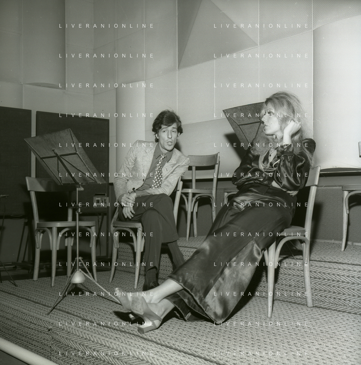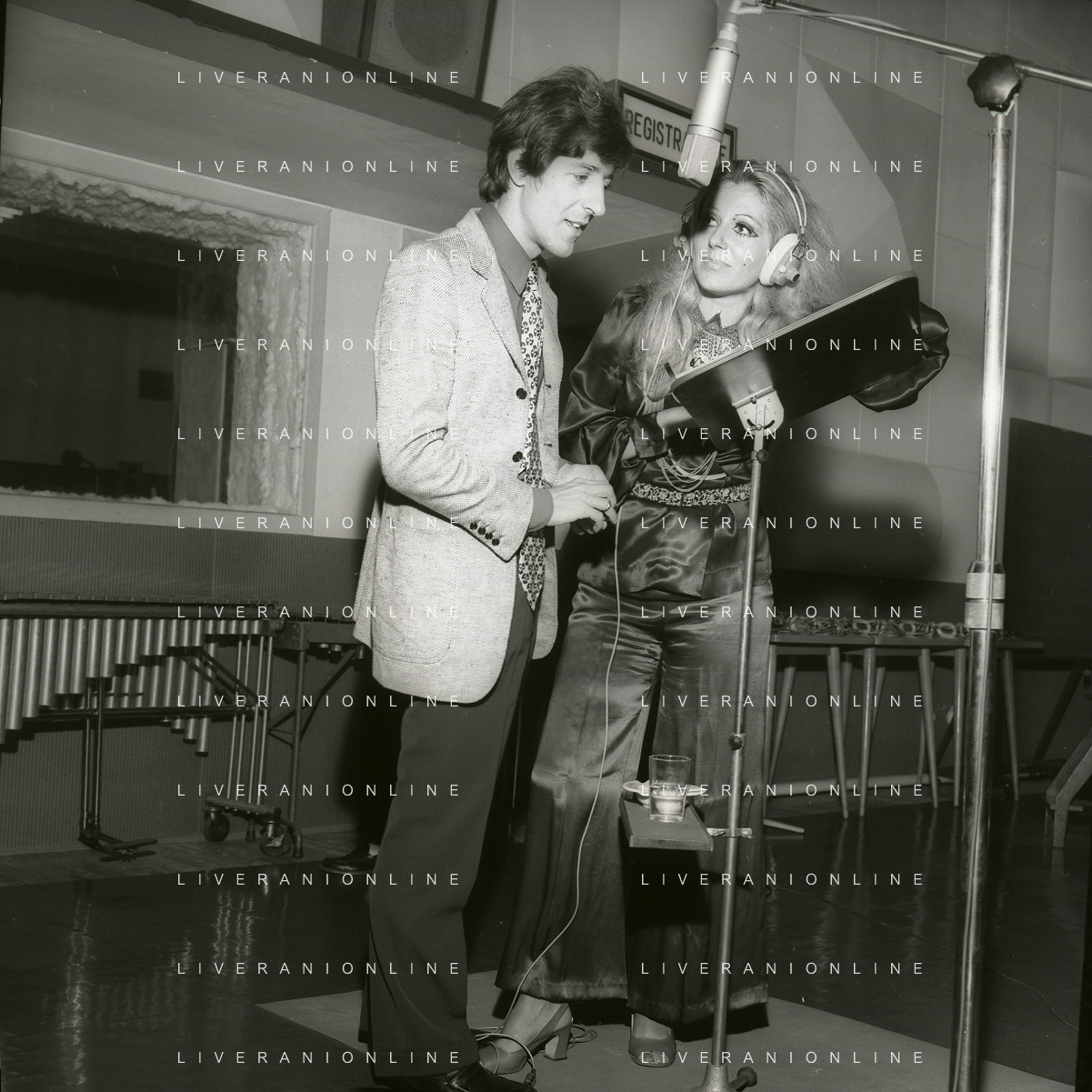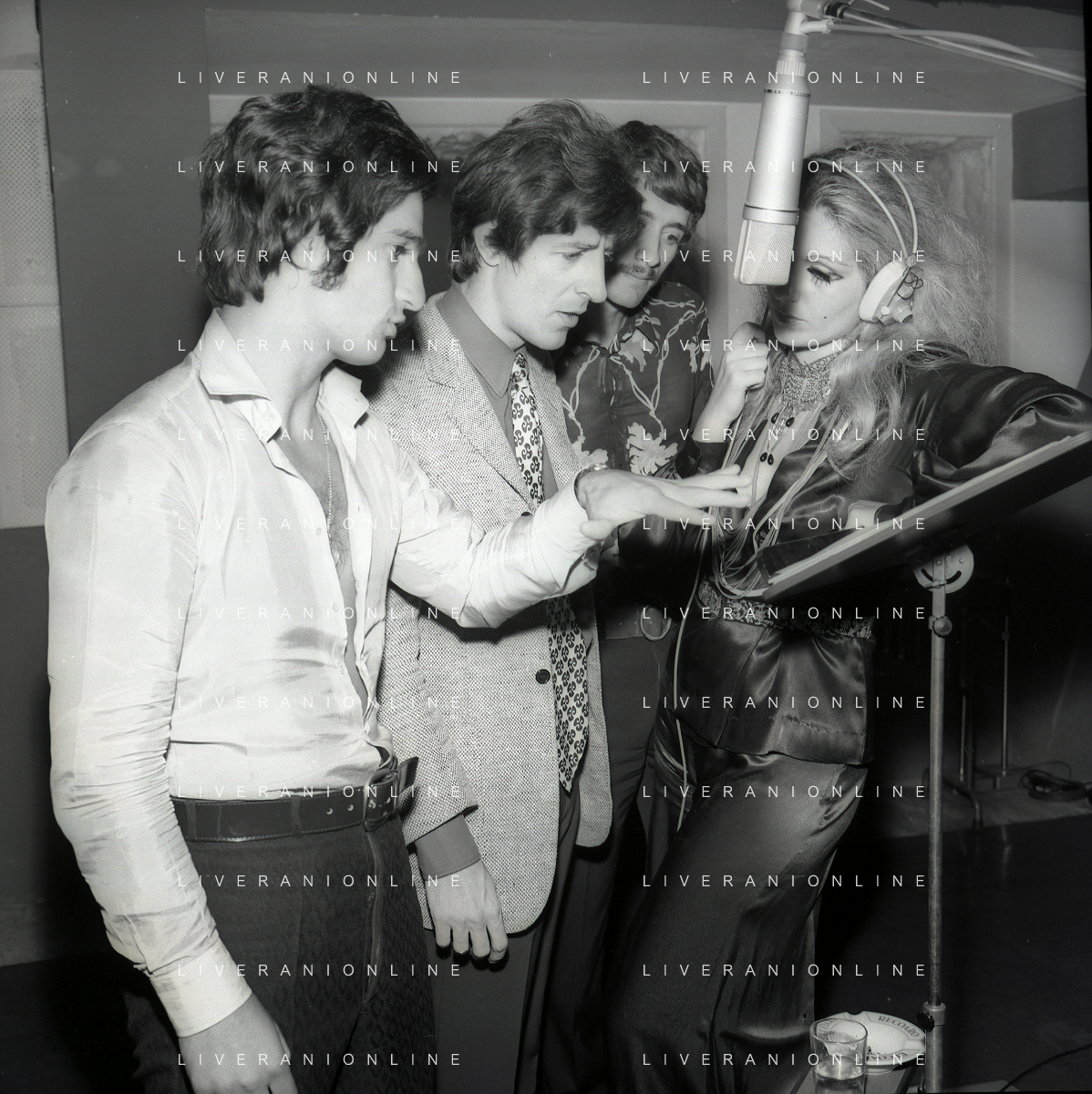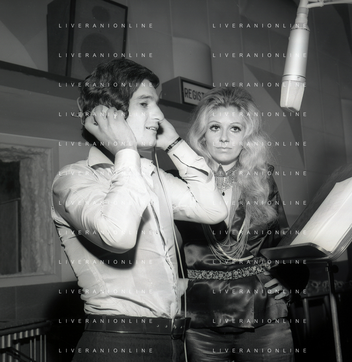RETROSPETTIVA OMBRETTA COLLI CANTANTE E ATTRICE NELLA FOTO OMBRETTA COLLI NELL'ANNO 1969 A MILANO IN SALA D'INCISIONE CON GIORGIO GABER AG ALDO LIVERANI SAS