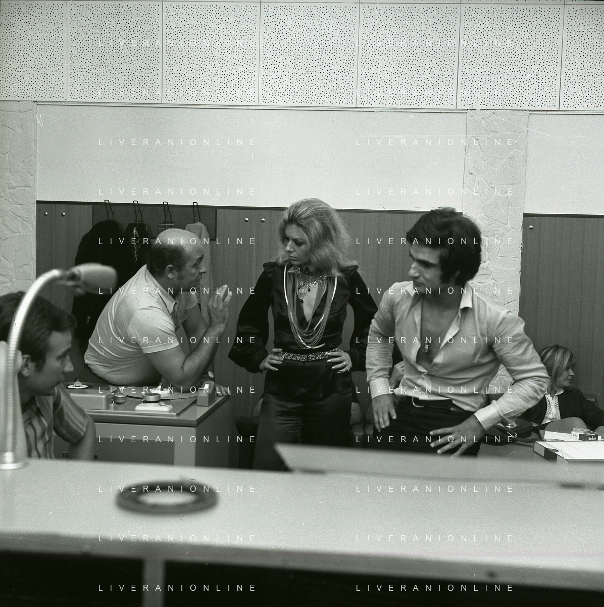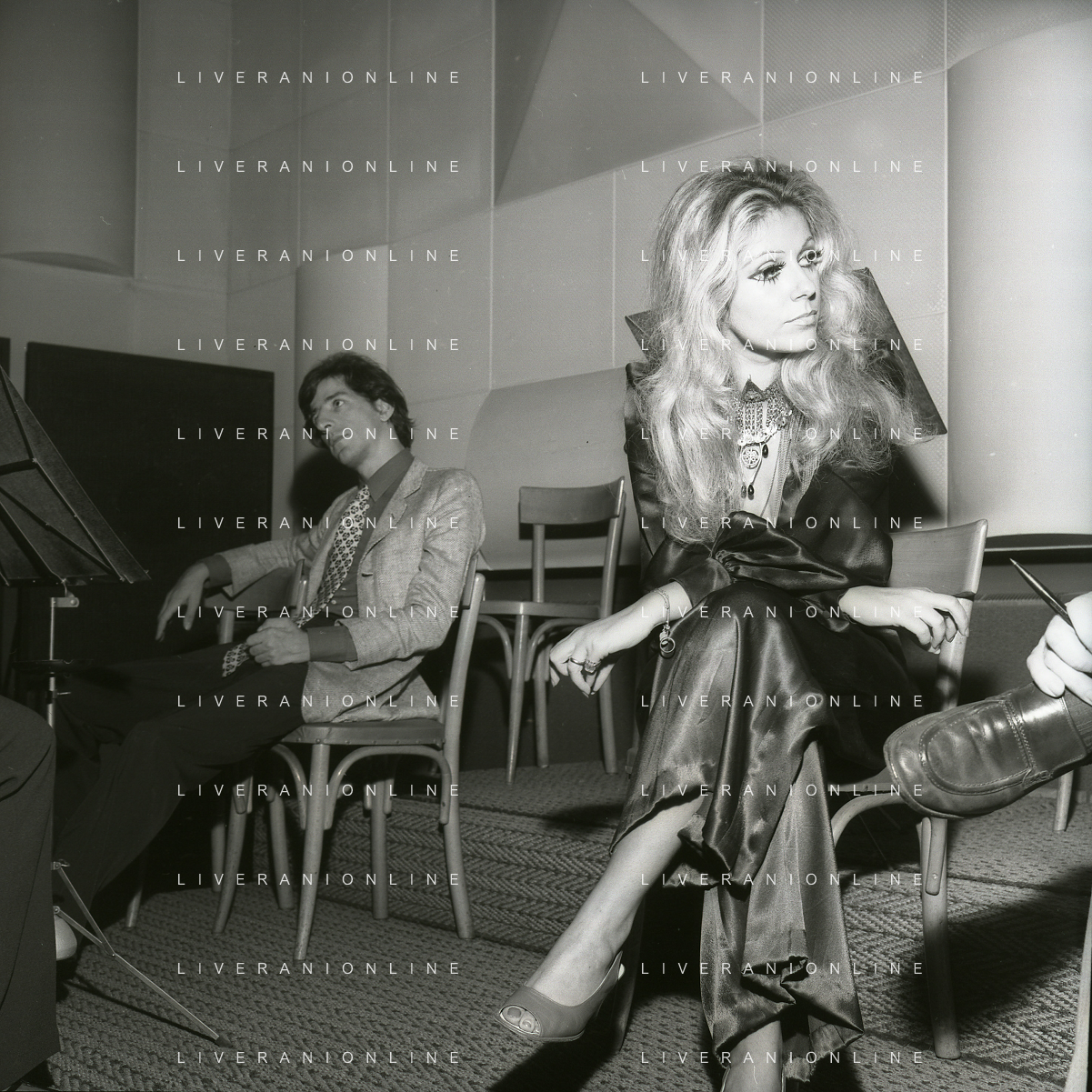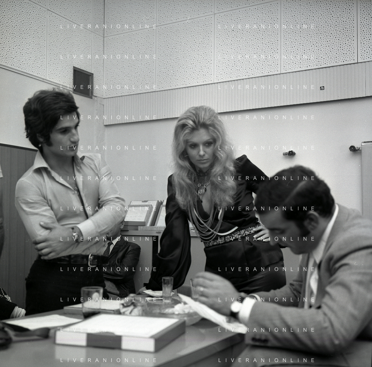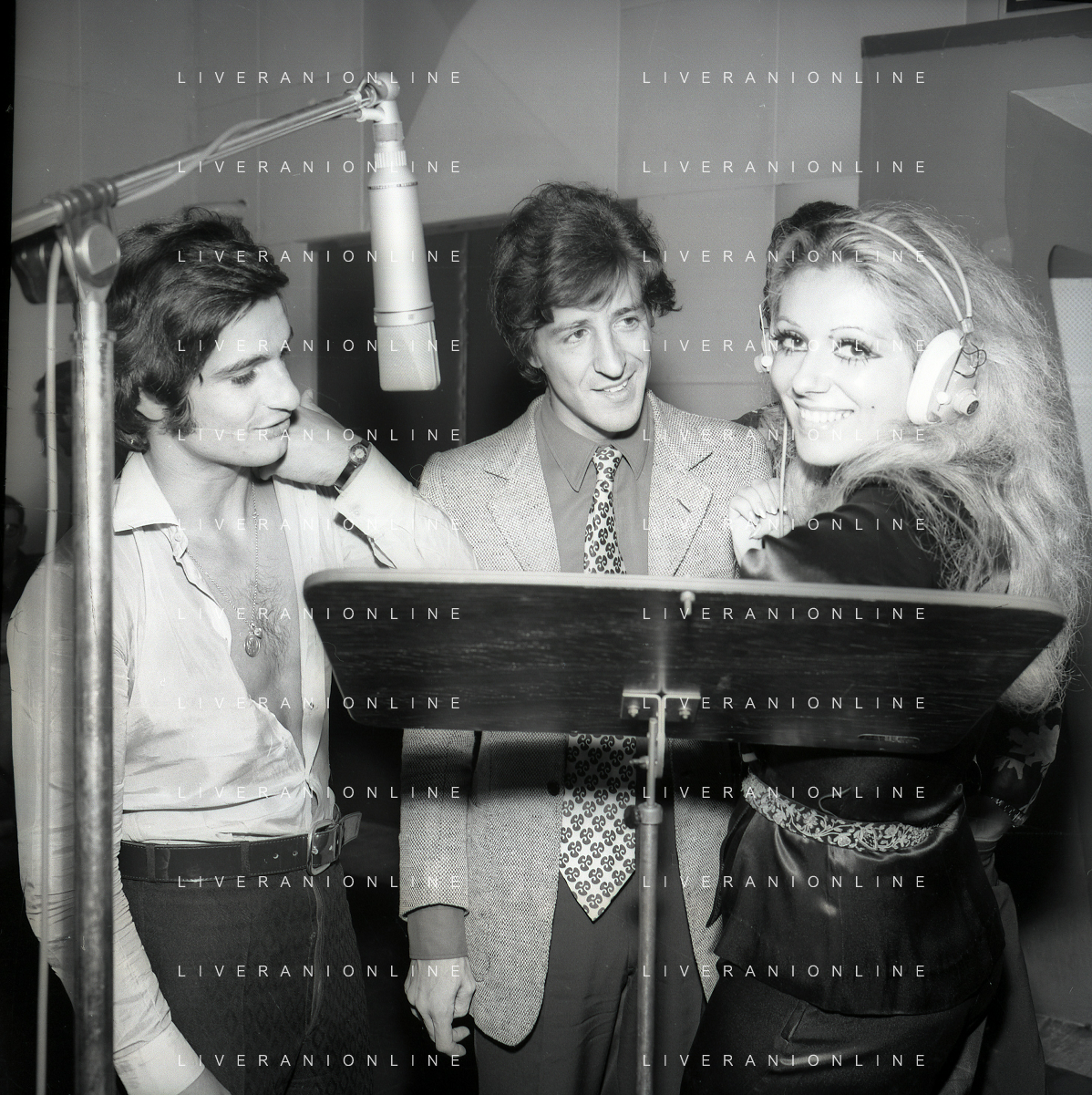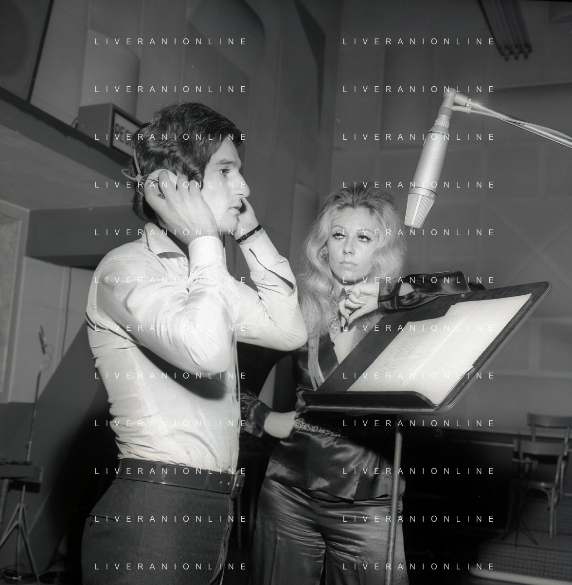 RETROSPETTIVA OMBRETTA COLLI CANTANTE E ATTRICE NELLA FOTO OMBRETTA COLLI NELL'ANNO 1969 A MILANO IN SALA D'INCISIONE CON GIORGIO GABER AG ALDO LIVERANI SAS