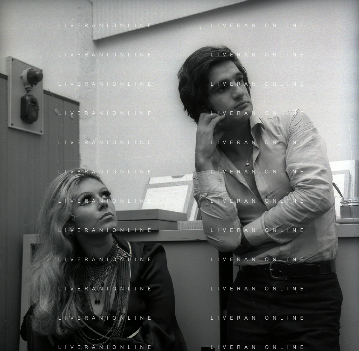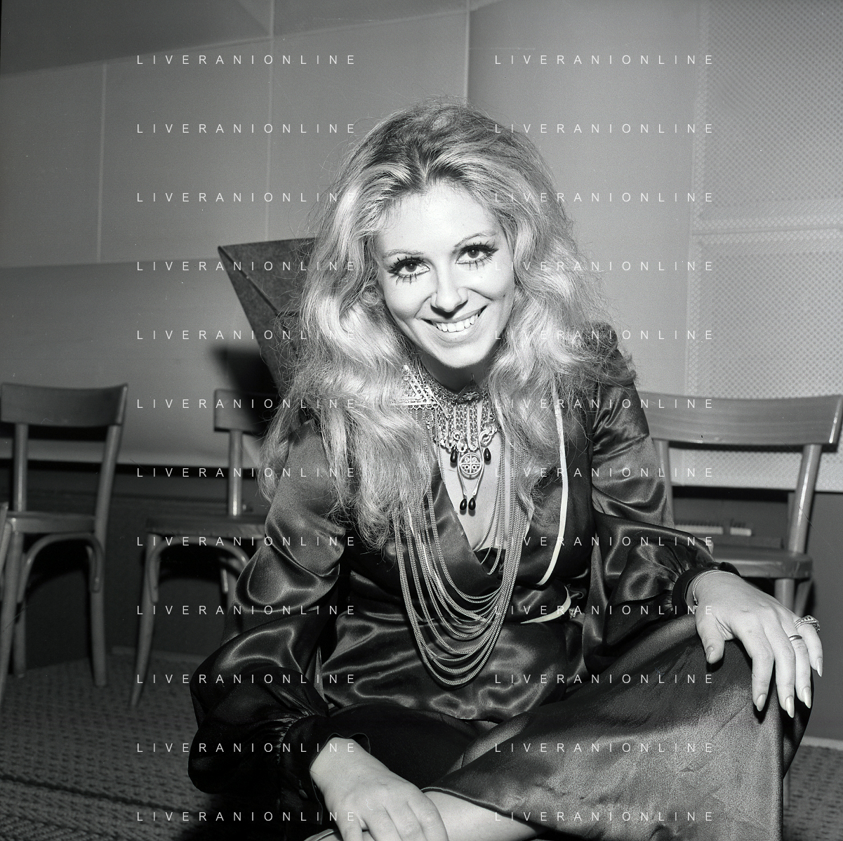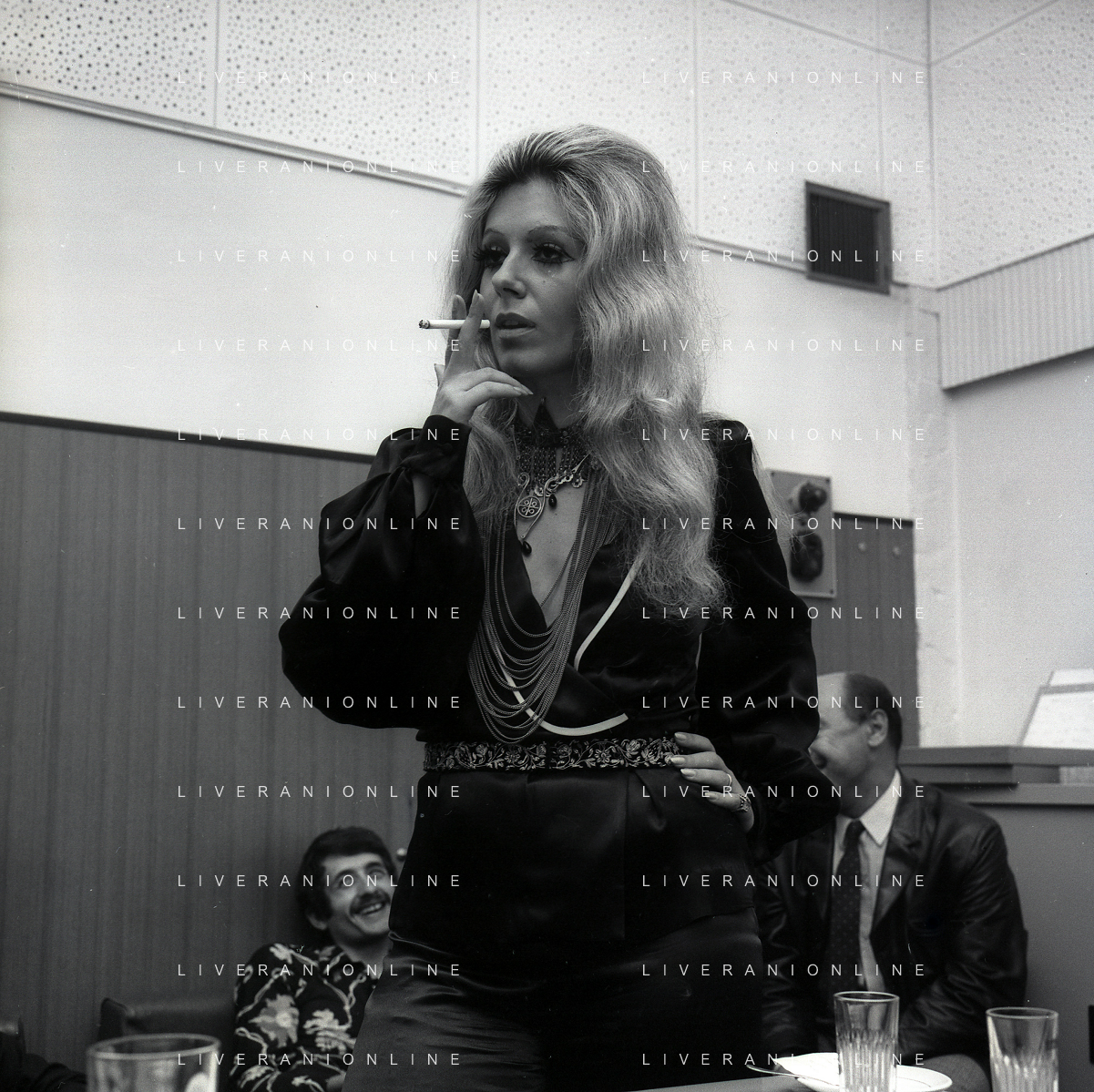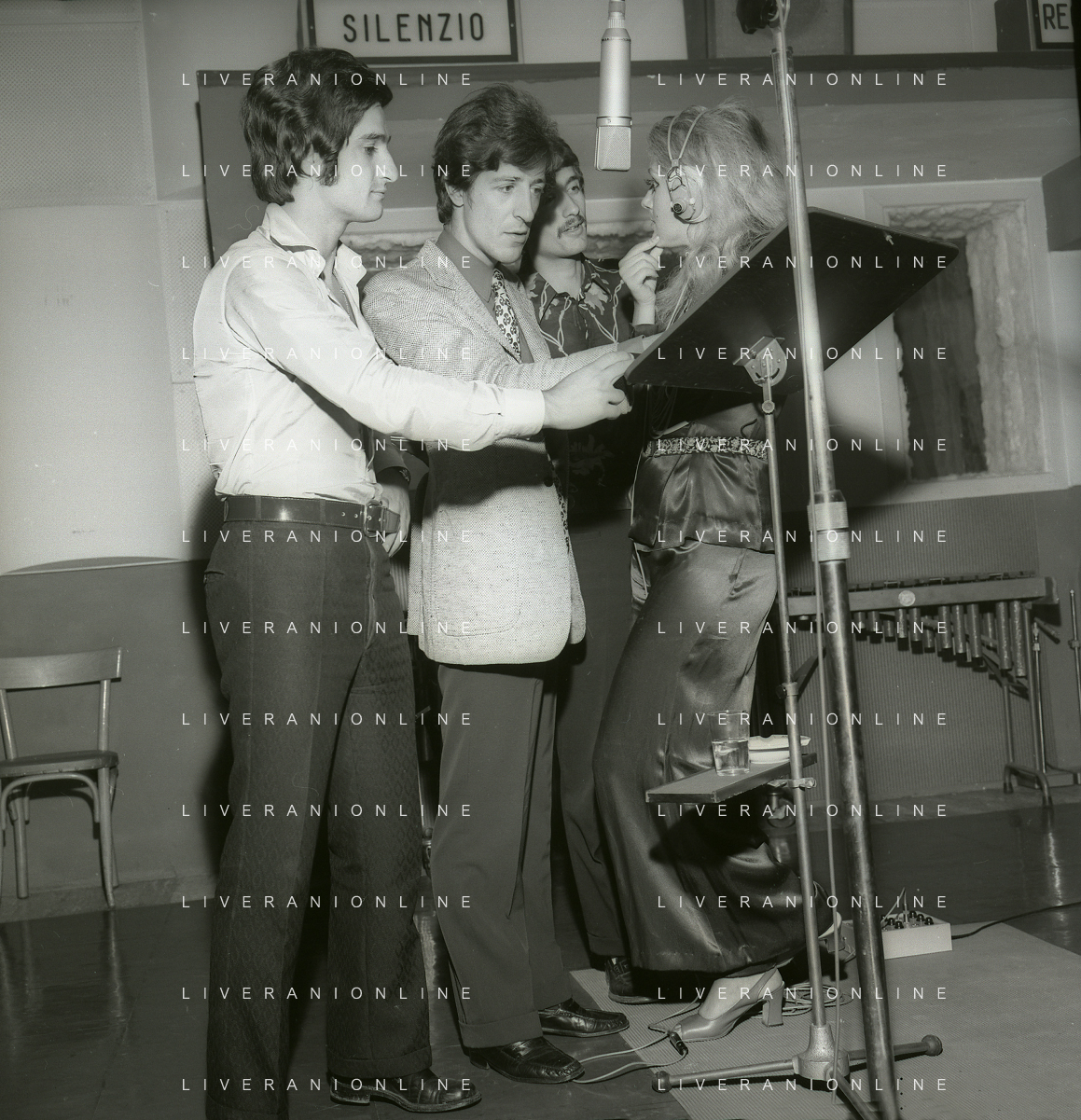 RETROSPETTIVA OMBRETTA COLLI CANTANTE E ATTRICE NELLA FOTO OMBRETTA COLLI NELL'ANNO 1969 A MILANO IN SALA D'INCISIONE CON GIORGIO GABER AG ALDO LIVERANI SAS