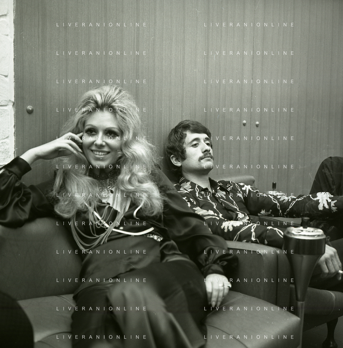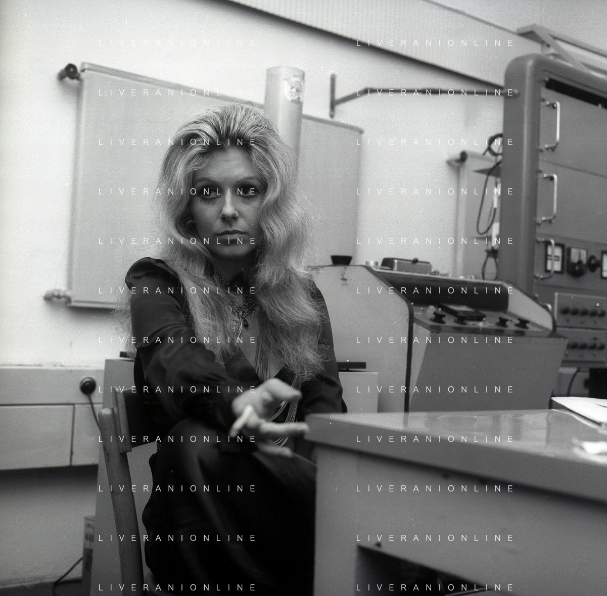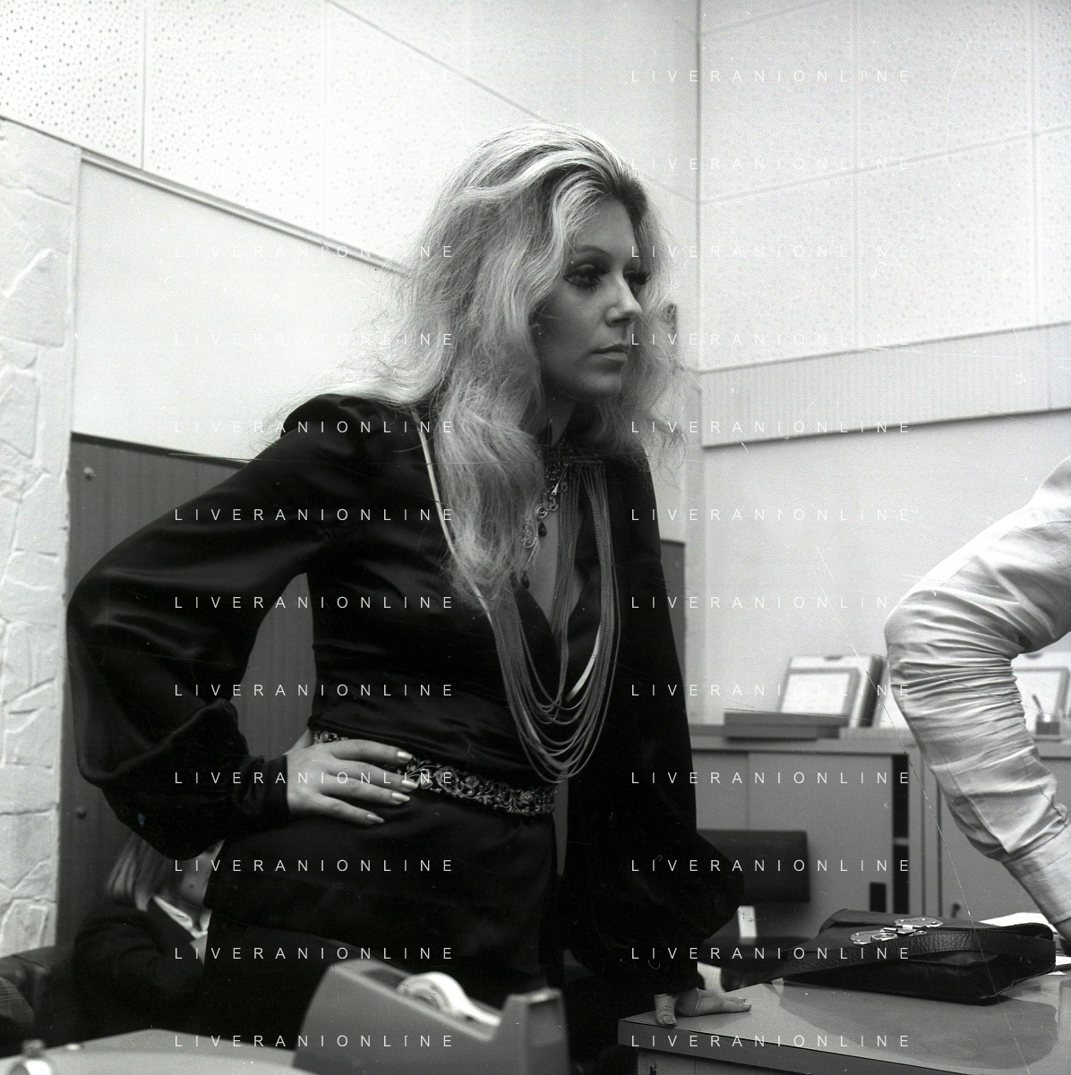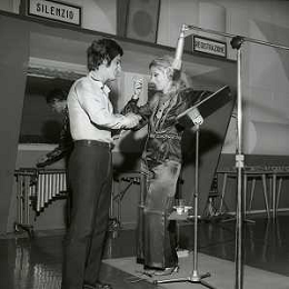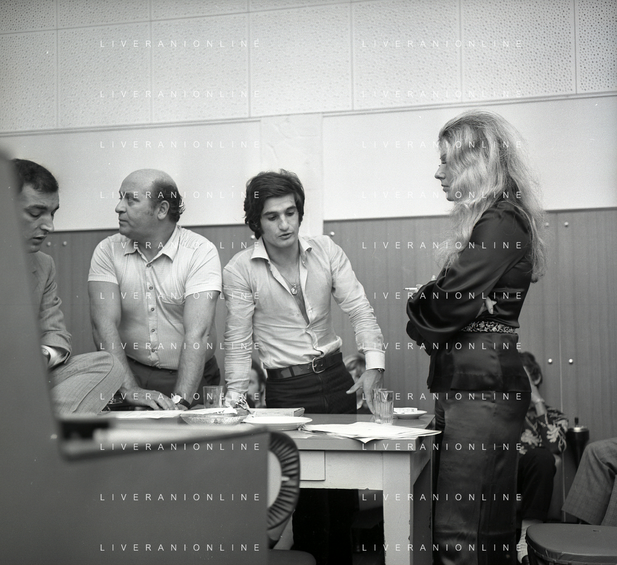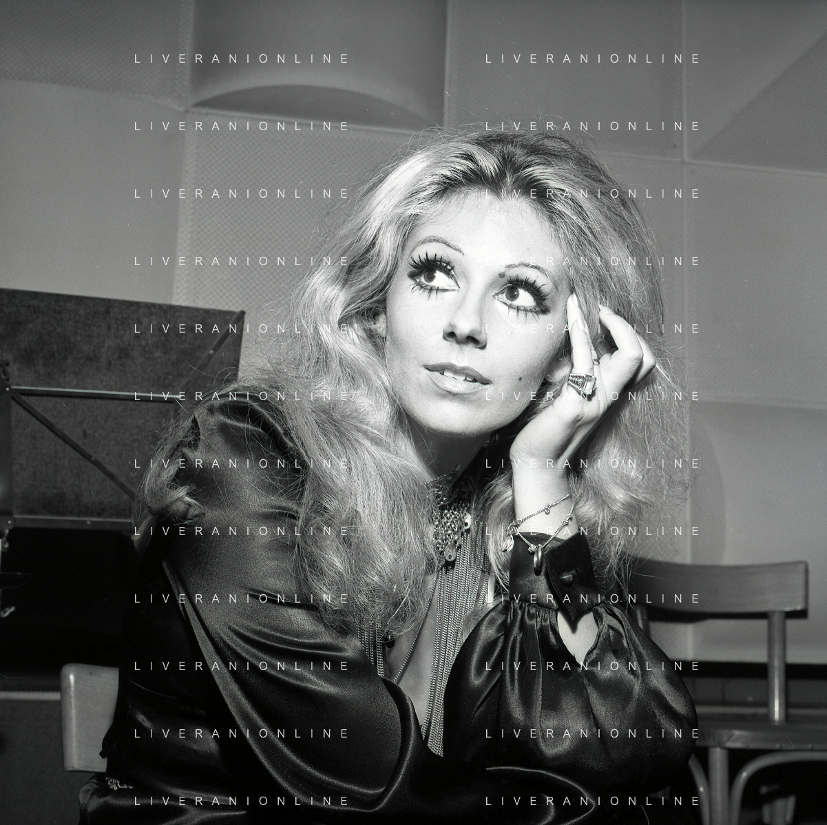 RETROSPETTIVA OMBRETTA COLLI CANTANTE E ATTRICE NELLA FOTO OMBRETTA COLLI NELL'ANNO 1969 A MILANO IN SALA D'INCISIONE CON GIORGIO GABER AG ALDO LIVERANI SAS