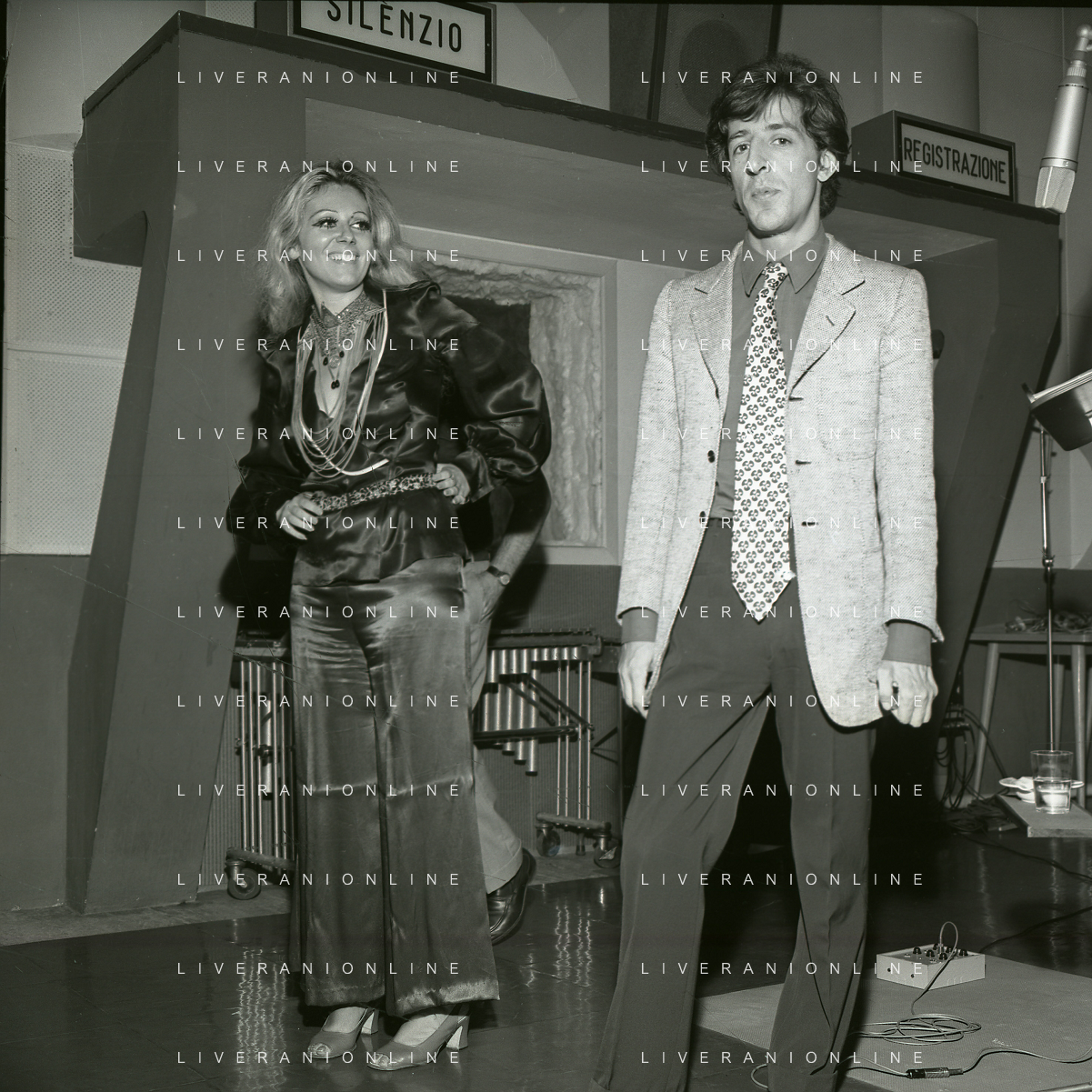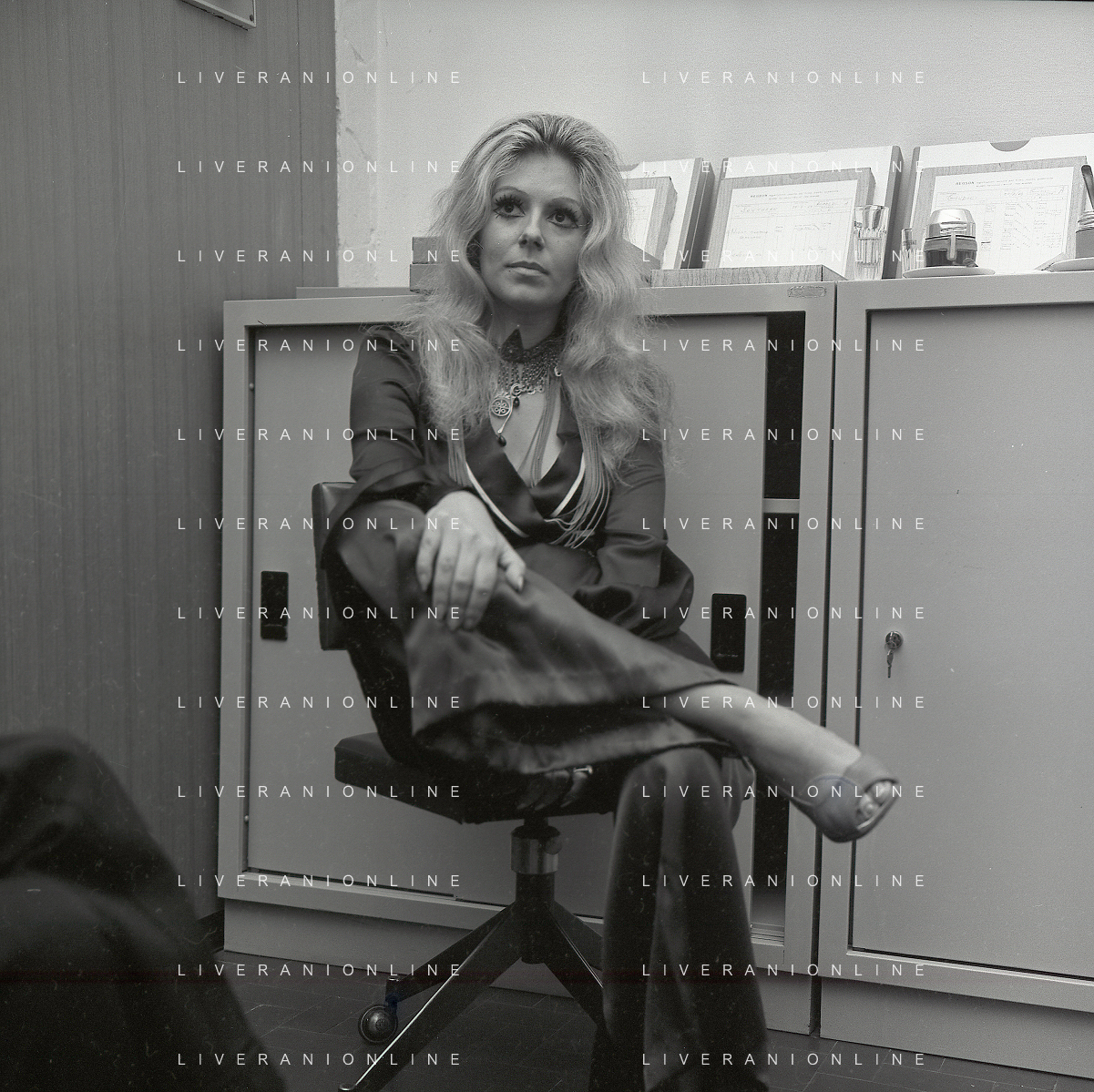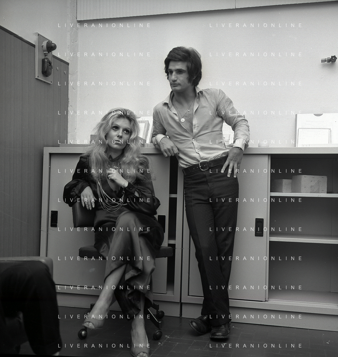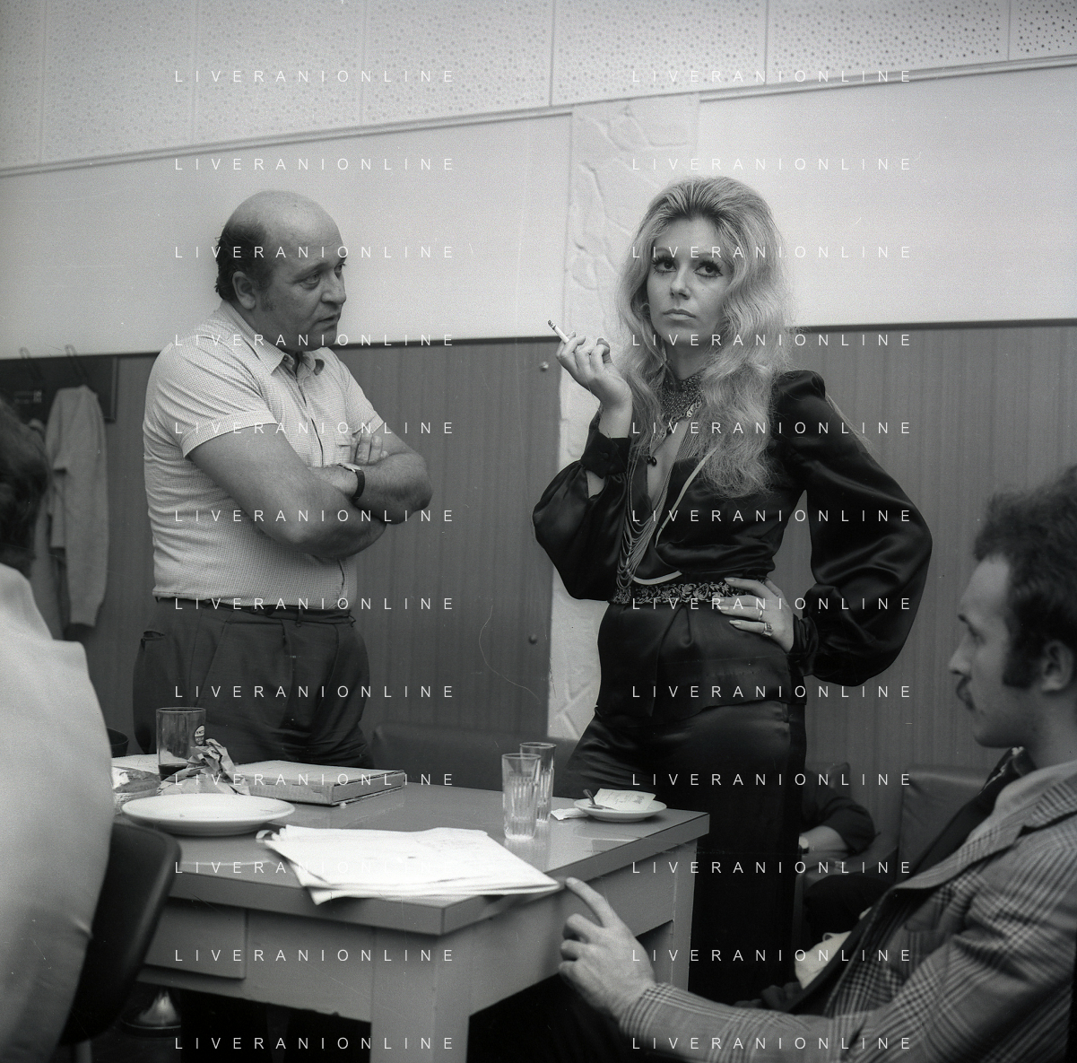 RETROSPETTIVA OMBRETTA COLLI CANTANTE E ATTRICE NELLA FOTO OMBRETTA COLLI NELL'ANNO 1969 A MILANO IN SALA D'INCISIONE CON GIORGIO GABER AG ALDO LIVERANI SAS