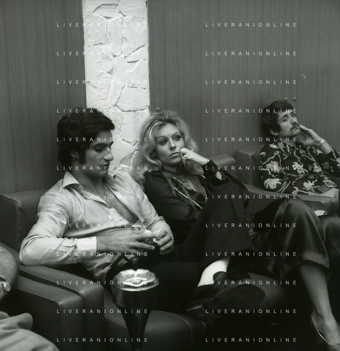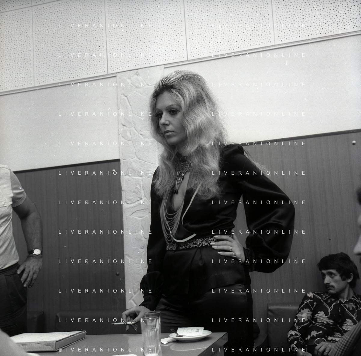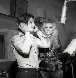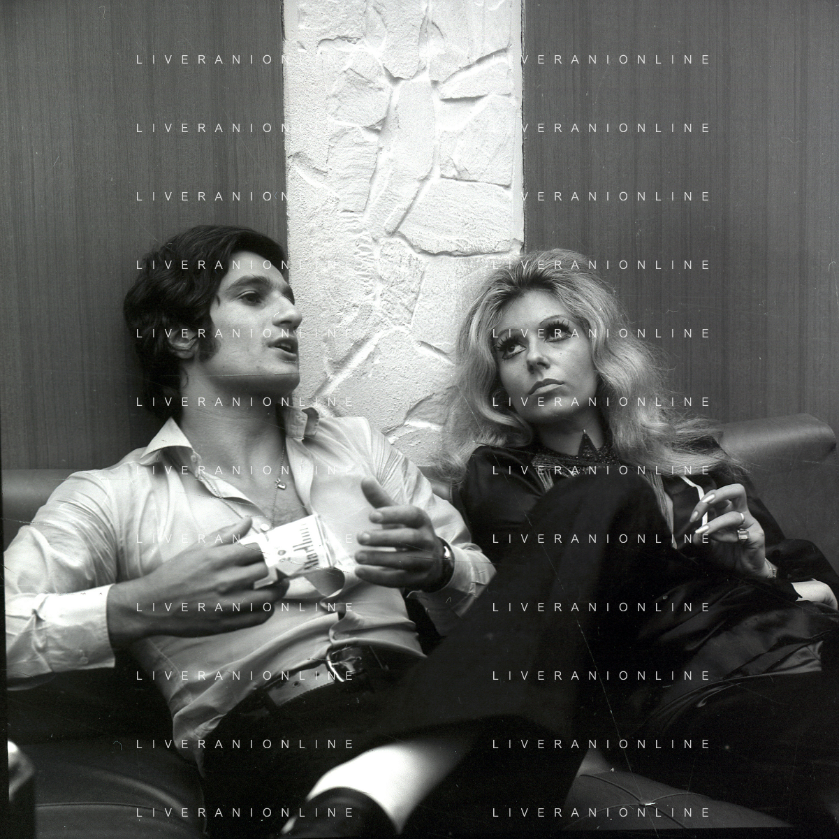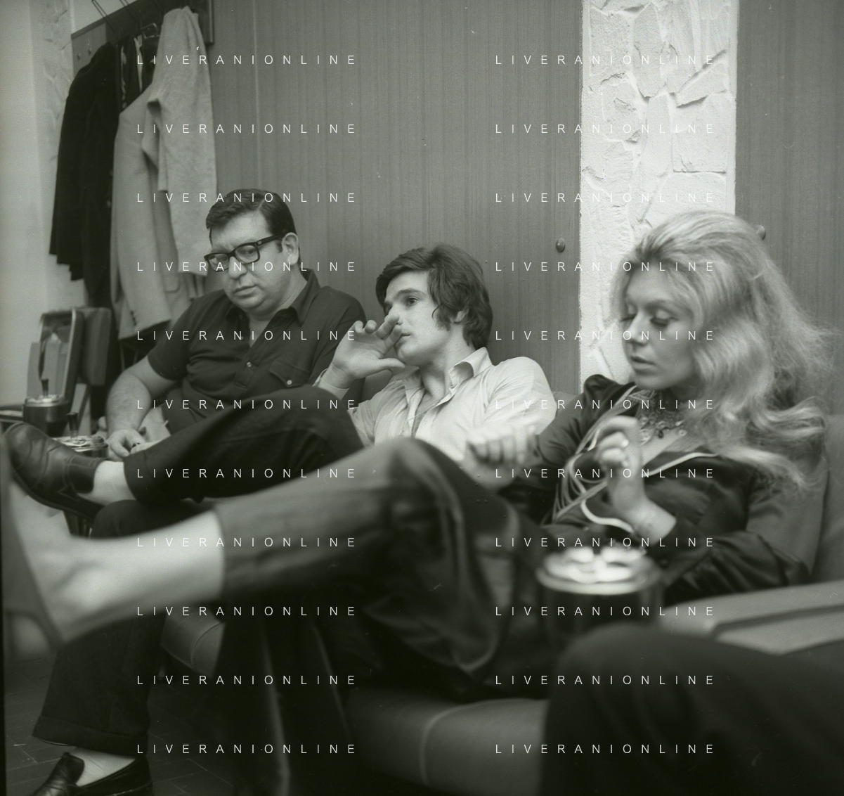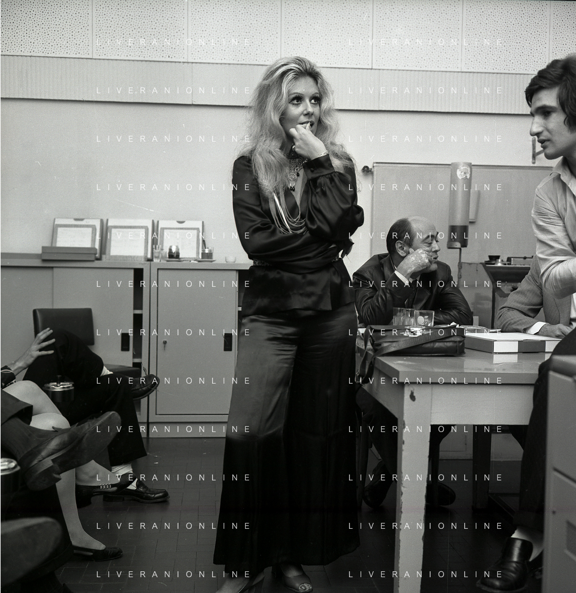 RETROSPETTIVA OMBRETTA COLLI CANTANTE E ATTRICE NELLA FOTO OMBRETTA COLLI NELL'ANNO 1969 A MILANO IN SALA D'INCISIONE CON GIORGIO GABER AG ALDO LIVERANI SAS