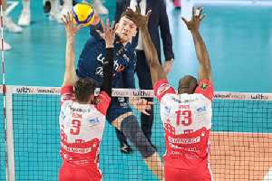 Muro Gas Sales Bluenergy Volley Piacenza durante la partita tra WithU Verona e Gas Sales BlueEnergy Piacenza Volley valida per gli ottavi di finale della DelMonte Coppa Italia di Volley 2023, Verona Italia, 29 Dicembre 2022 presso il pala AGSM-AIM di Verona. ©Roberto Tommasini /Agenzia Aldo Liverani Sas