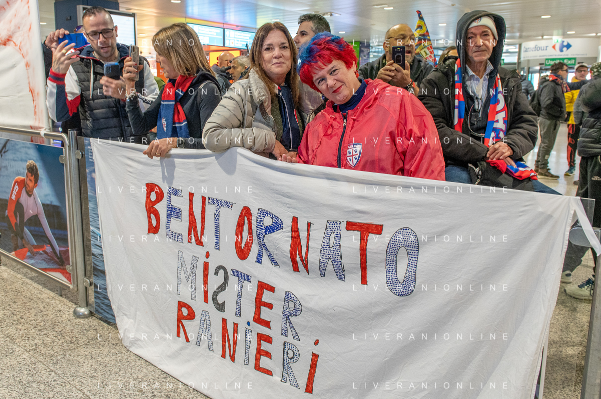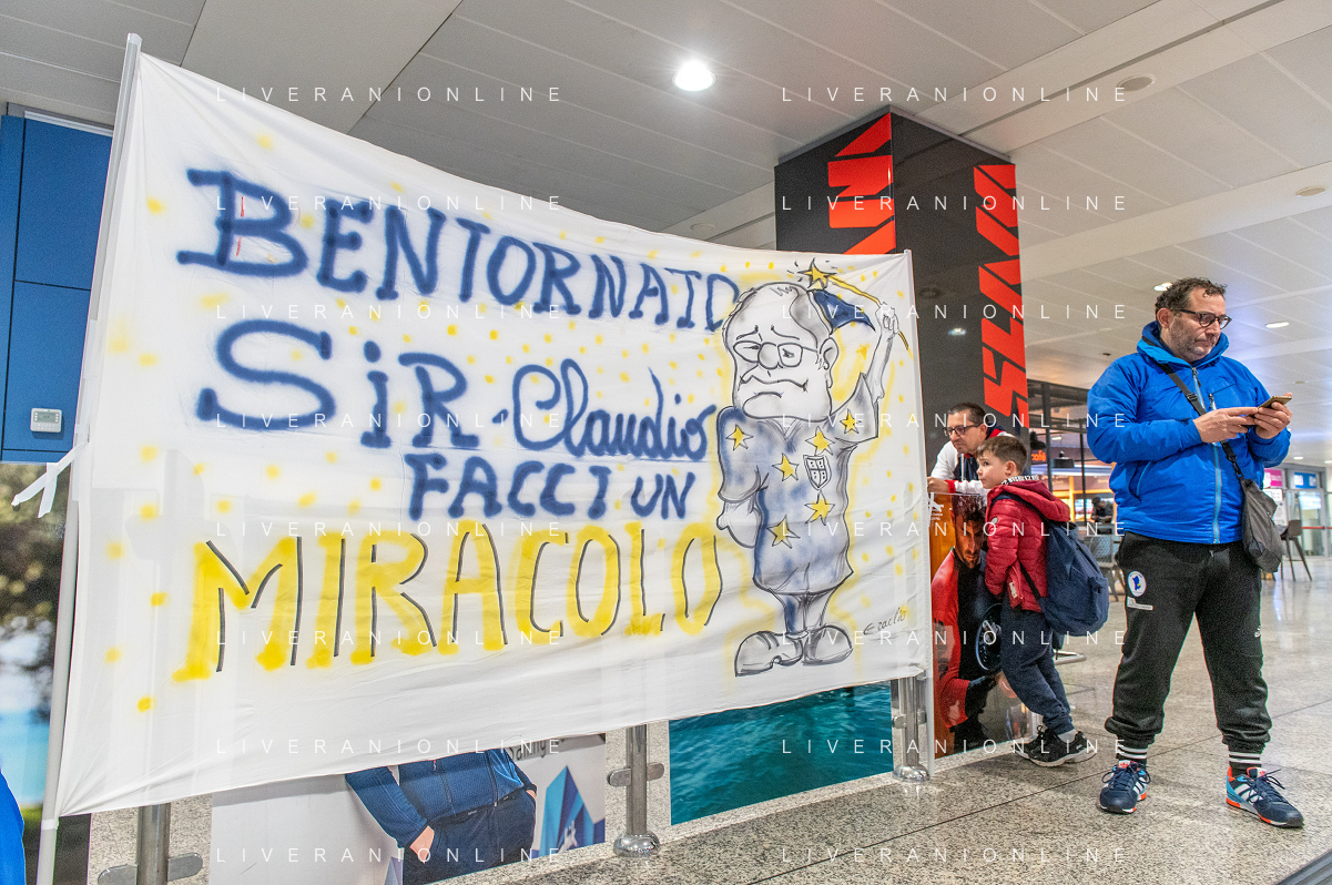 3-1-2023. Arrivo all'aeroporto Mameli di Cagliari/Elmas, del nuovo allenatore del Cagliari Calcio Claudio Ranieri. Foto Salvatore Moi/agenzia Aldo Liverani sas. Nella foto: Striscione realizzato dai tifosi del Cagliari, per salutare arrivo nuovo allenatore Cagliari, Claudio Ranieri