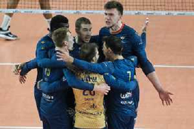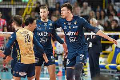 Esultanza WithU Verona durante la partita tra WithU Verona e Sir Safety Susa Perugia valida per la terza giornata del girone di ritorno, campionato italiano di volley maschile serie A Superlega, Verona Italia, 8 Dicembre 2023 presso il pala AGSM-AIM di Verona. FOTO ROBERTO TOMMASINI-AG ALDO LIVERANI SAS