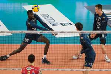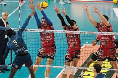 Muro Perugia di Simone Giannelli - Sir Safety Susa Perugia Sebastian Sole - Sir Safety Susa Perugia e Oleh Plotnytskyi - Sir Safety Susa Perugia durante la partita tra WithU Verona e Sir Safety Susa Perugia valida per la terza giornata del girone di ritorno, campionato italiano di volley maschile serie A Superlega, Verona Italia, 8 Dicembre 2023 presso il pala AGSM-AIM di Verona. FOTO ROBERTO TOMMASINI-AG ALDO LIVERANI SAS