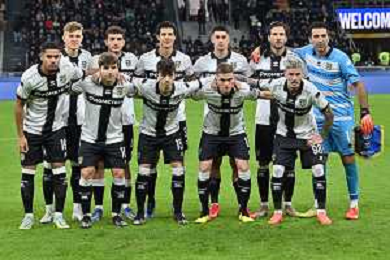 la formazione del Parma, in piedi da SX Adrian Dawid Benedyczak, Botond Balogh, Yordan Hernando Osorio Paredes, Lautaro Rodrigo Valenti, Franco Damian Vazquez e Gianluigi Buffon; in basso da SX Simon Solomon Junior Sohm, Adrian Bernabe', Enrico Delprato, Nahuel Estevez Alvarez e Dennis Man Inter vs Parma Milano 10-01-2023 Stadio Giuseppe Meazza San Siro Coppa Italia Frecciarossa - ottavi di finale foto Roberto Garavaglia/ag. Aldo Liverani sas / AGENZIA ALDO LIVERANI SAS