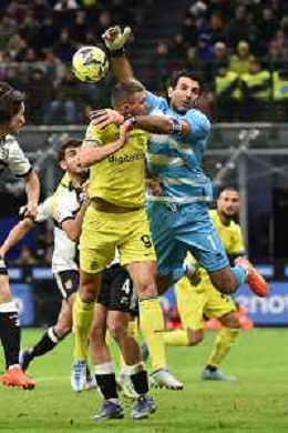 Gianluigi Buffon (Parma) in uscita su Edin Dzeko (Inter) Inter vs Parma Milano 10-01-2023 Stadio Giuseppe Meazza San Siro Coppa Italia Frecciarossa - ottavi di finale foto Roberto Garavaglia/ag. Aldo Liverani sas / AGENZIA ALDO LIVERANI SAS