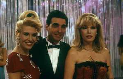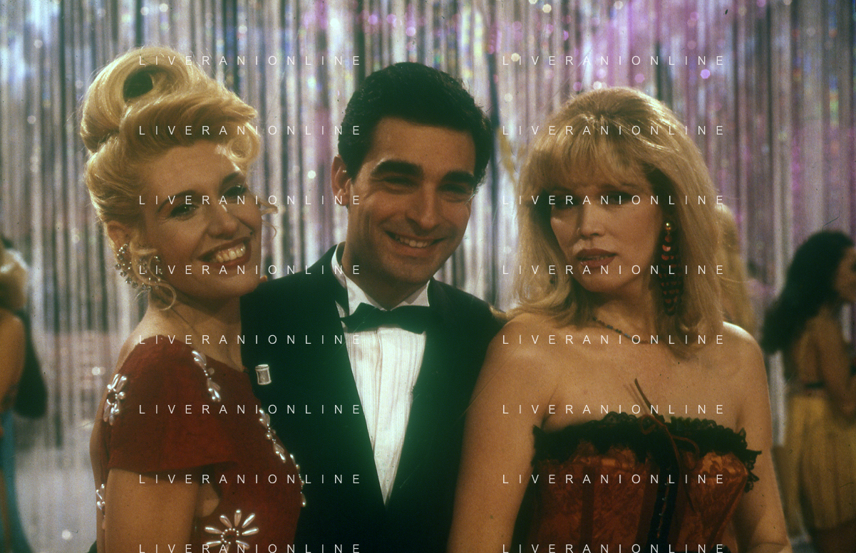 RETROSPETTIVA TIBERIO TIMPERI GIORNALISTA TELEVISIVO NELLA FOTO TIBERIO TIMPERI A MILANO NELLA TRASMISSIONE TELEVISIVA“BUONA SERA“ NELL'ANNO 1992 CON MARIA TERESA RUTA E AMANDA LEAR AG ALDO LIVERANI SAS