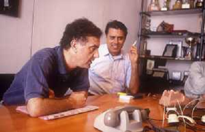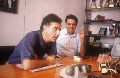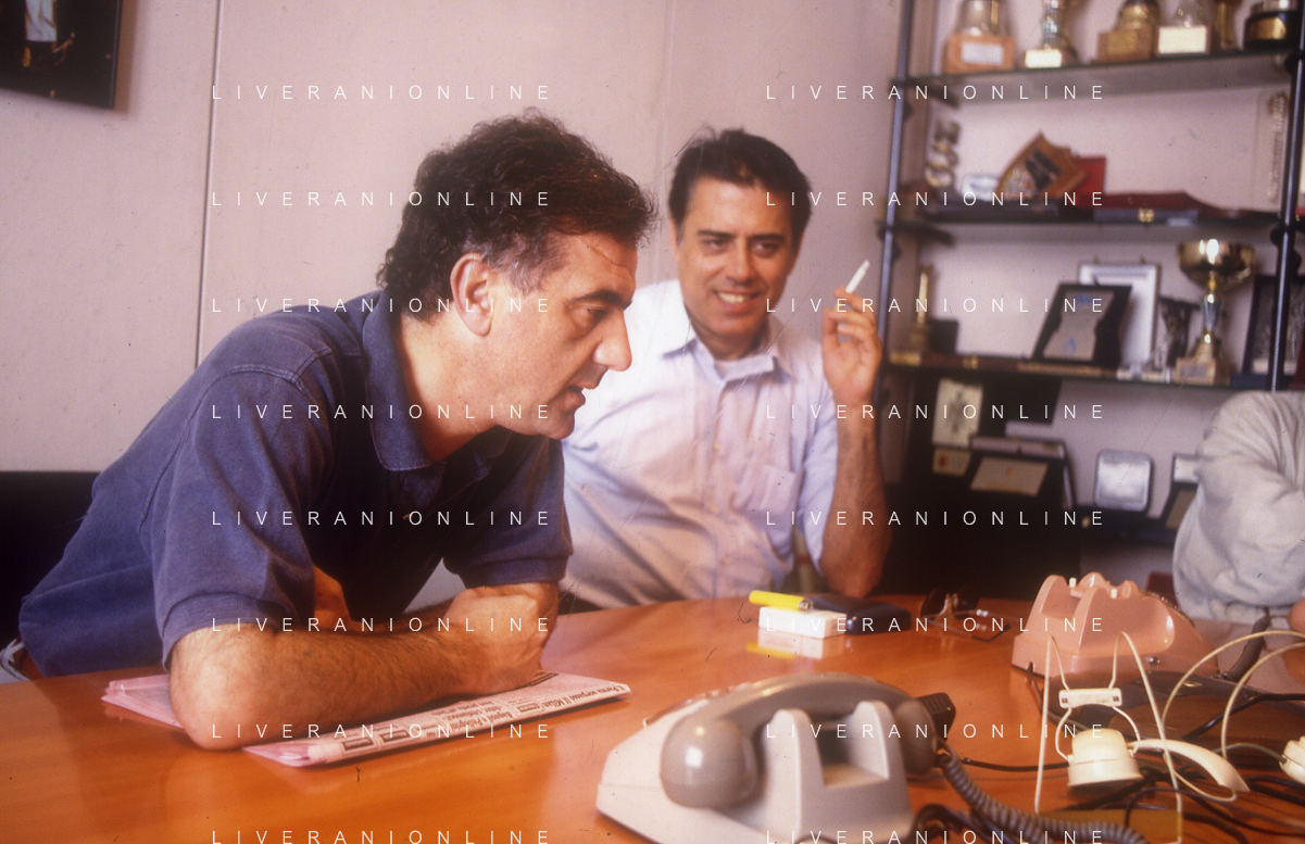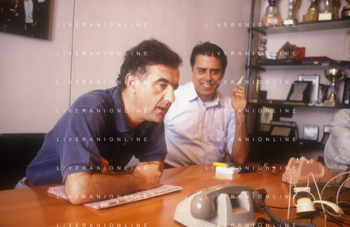 1993 MILANO REDAZIONE DELLA GAZZETTA DELLO SPORT SOPITE PER LE TELEFONATE COI LETTORI GENE GNOCCHI E TEO TEOCOLI NELLA FOTO GENE GNOCCHI CON TEO TEOCOLI AG ALDO LIVERANI SAS