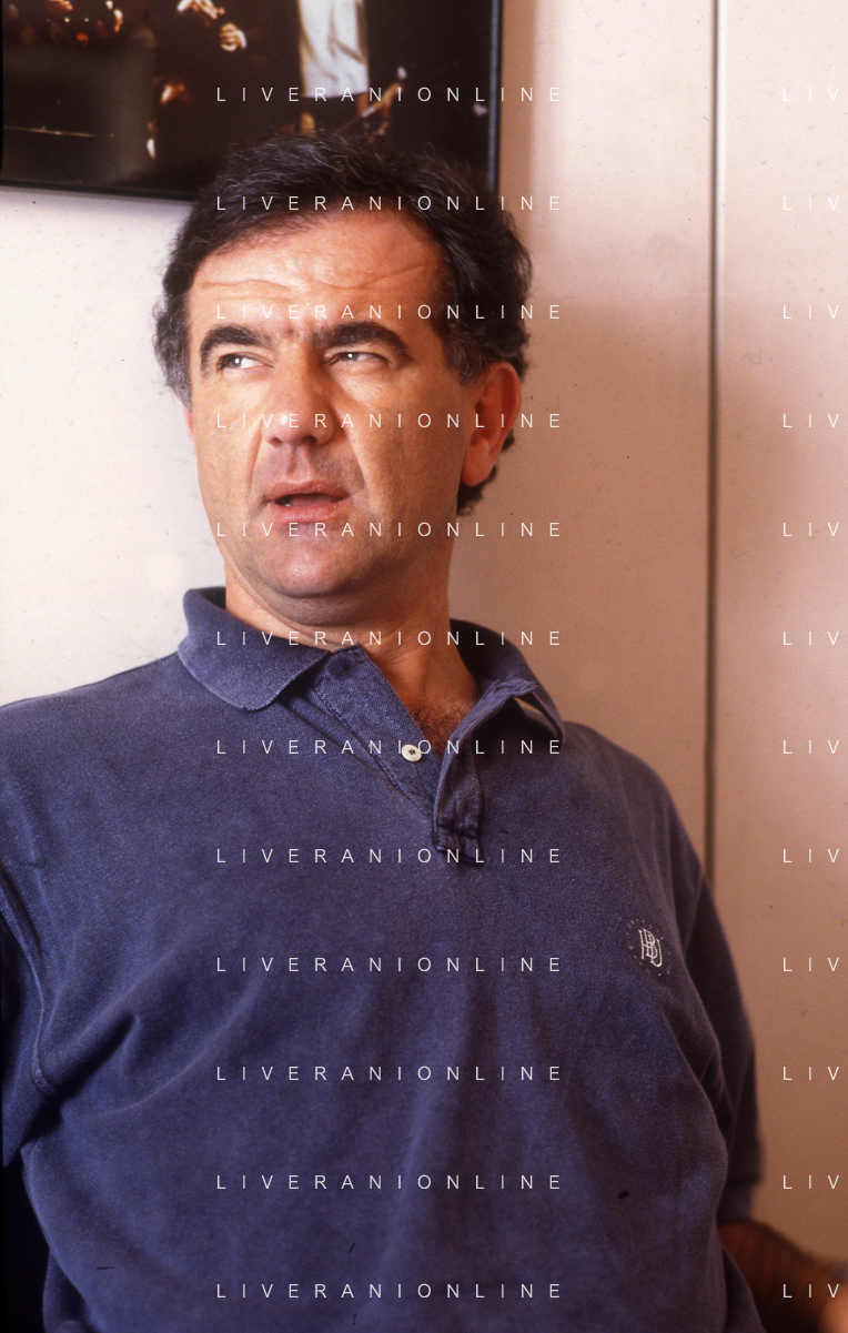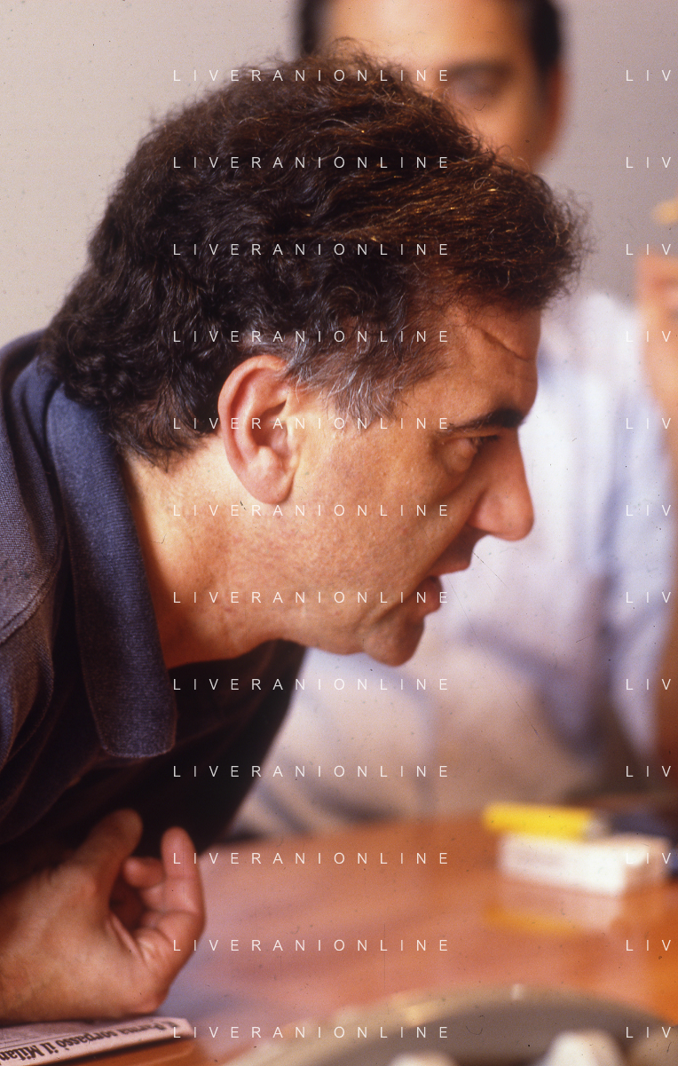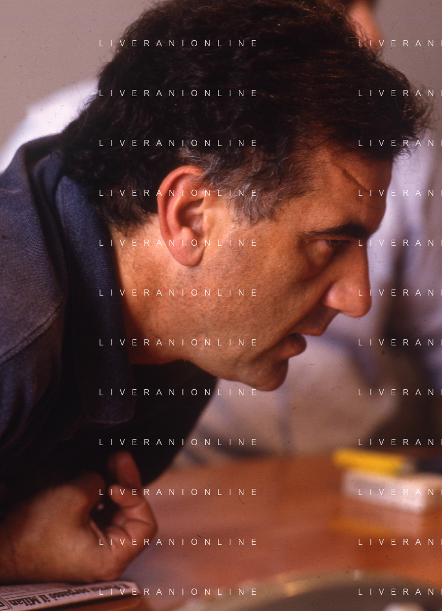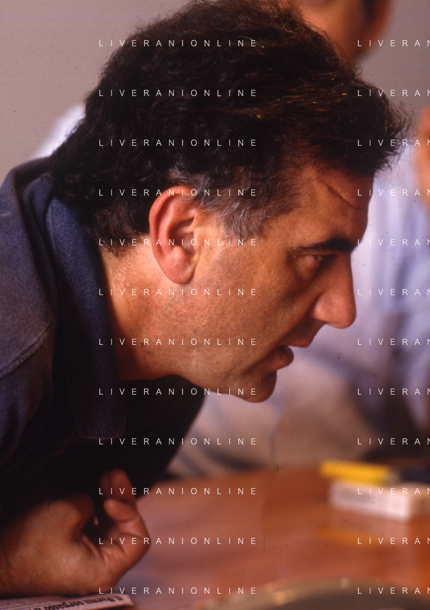1993 MILANO REDAZIONE DELLA GAZZETTA DELLO SPORT OSPITE PER LE TELEFONATE COI LETTORI GENE GNOCCHI E TEO TEOCOLI NELLA FOTO GENE GNOCCHI AG ALDO LIVERANI SAS