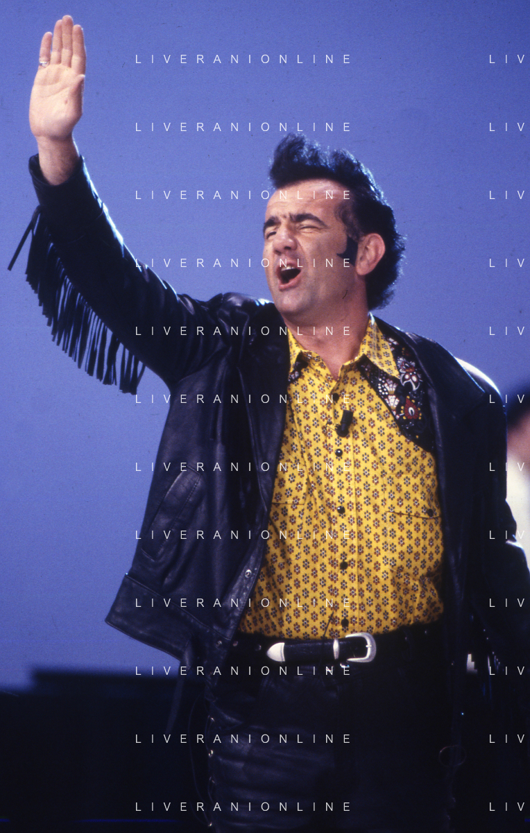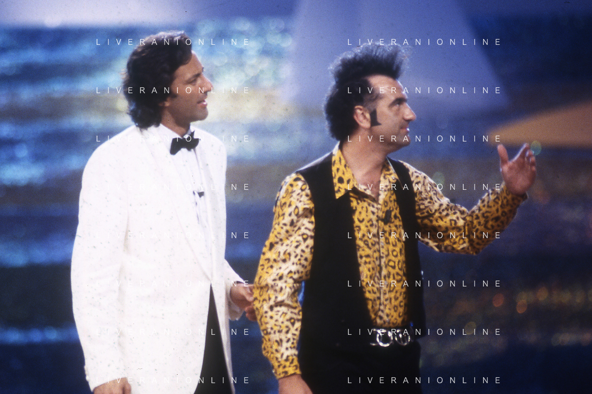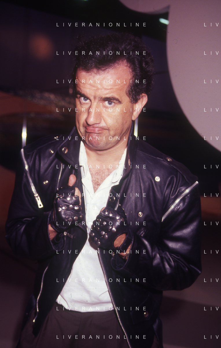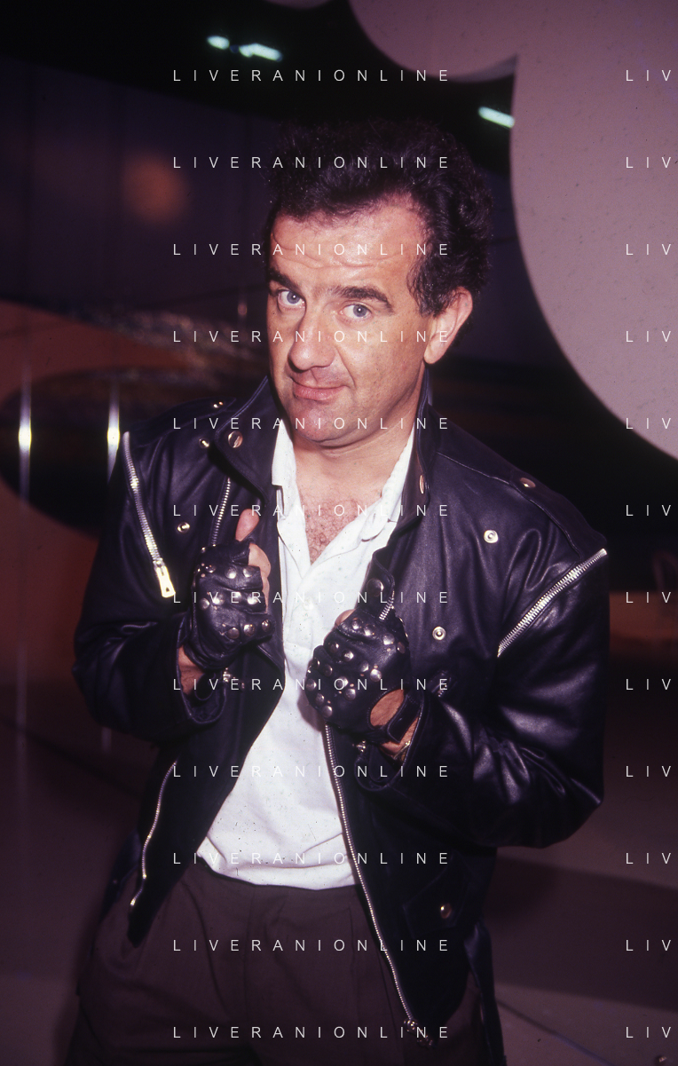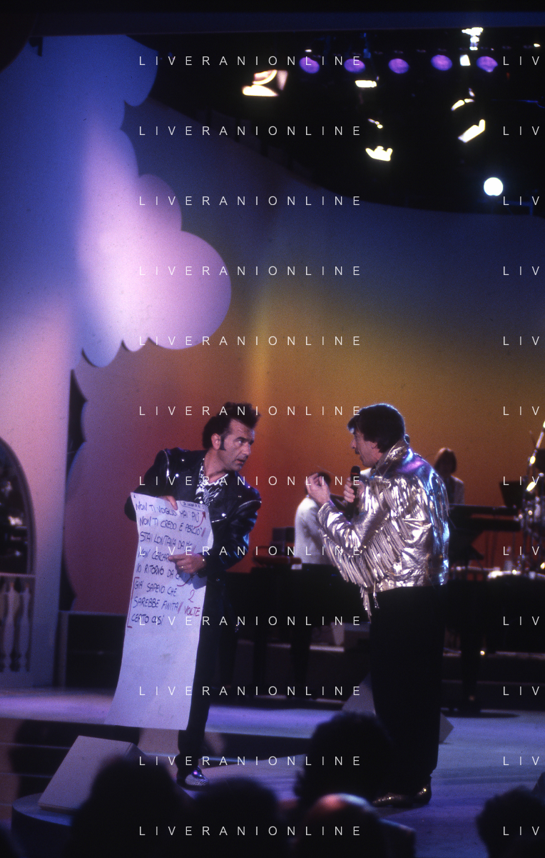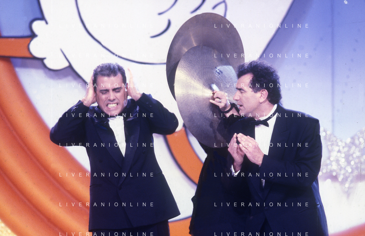 RETROSPETTIVA GENE GNOCCHI ATTORE E COMICO NELLA FOTO GENE GNOCCHI NELL'ANNO 1991 NELLA TRASMISSIONE TELEVISIVA “SAPORE DI SALE“ CON TEO TEOCOLI AG ALDO LIVERANI SAS