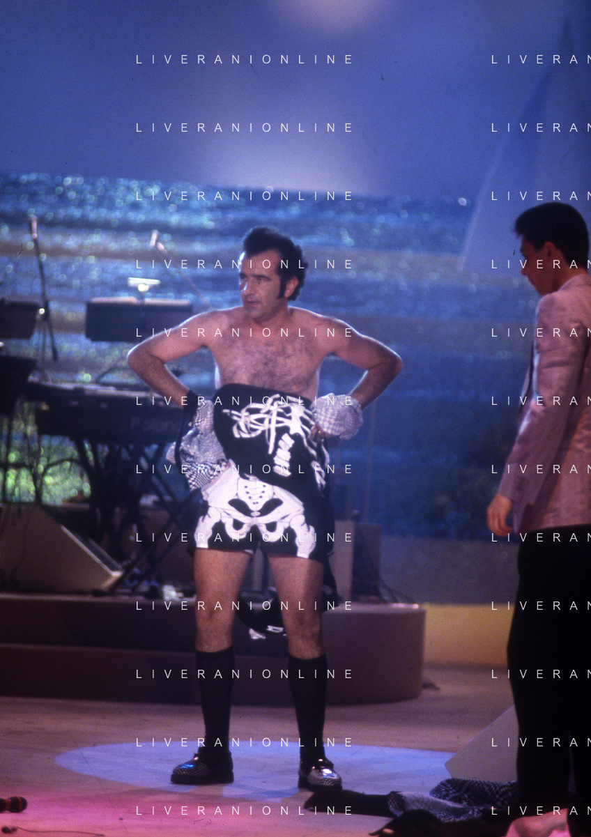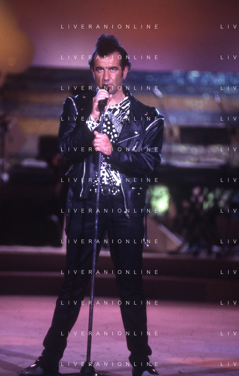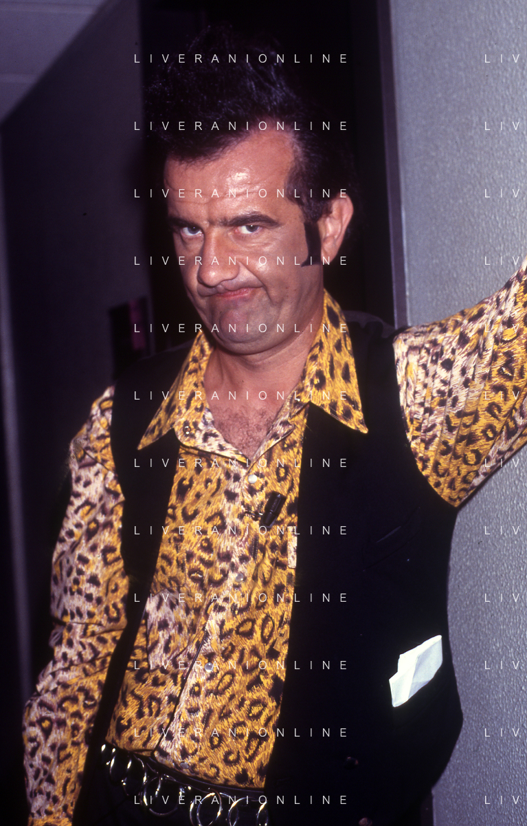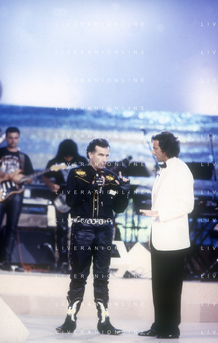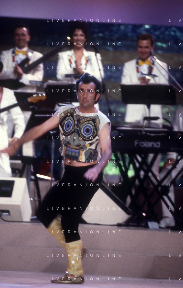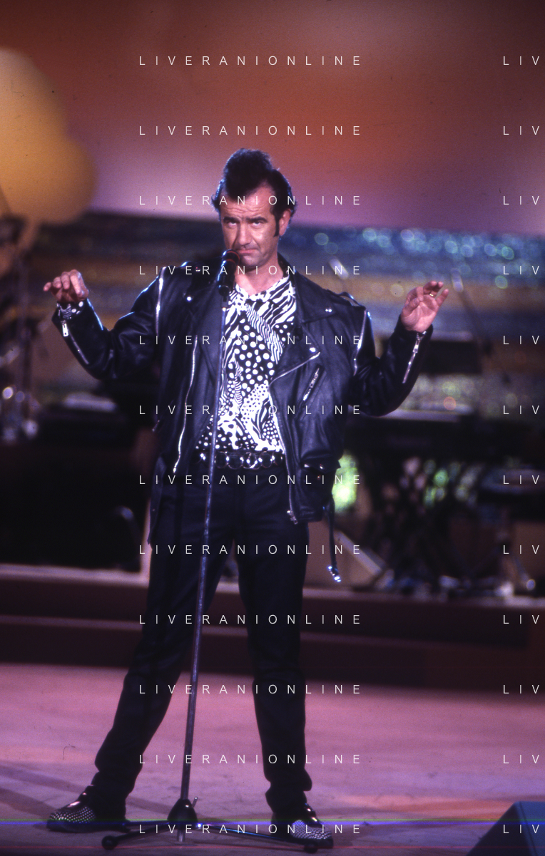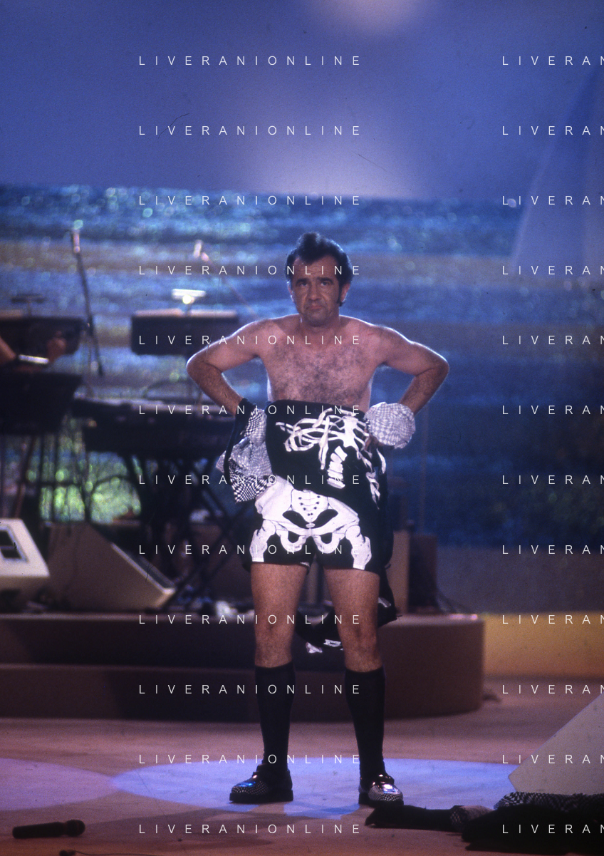 RETROSPETTIVA GENE GNOCCHI ATTORE E COMICO NELLA FOTO GENE GNOCCHI NELL'ANNO 1991 NELLA TRASMISSIONE TELEVISIVA “SAPORE DI SALE“ CON TEO TEOCOLI AG ALDO LIVERANI SAS