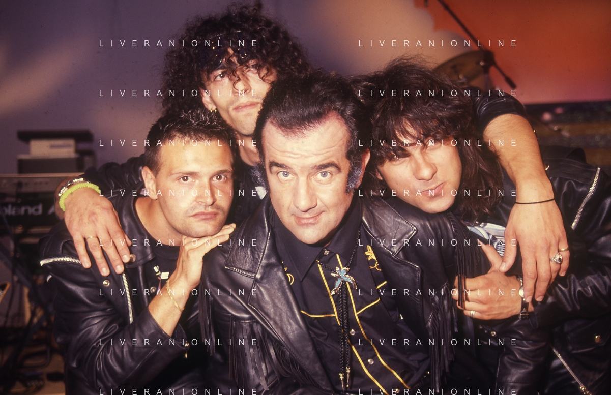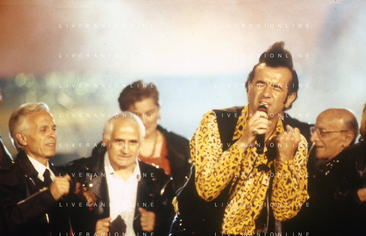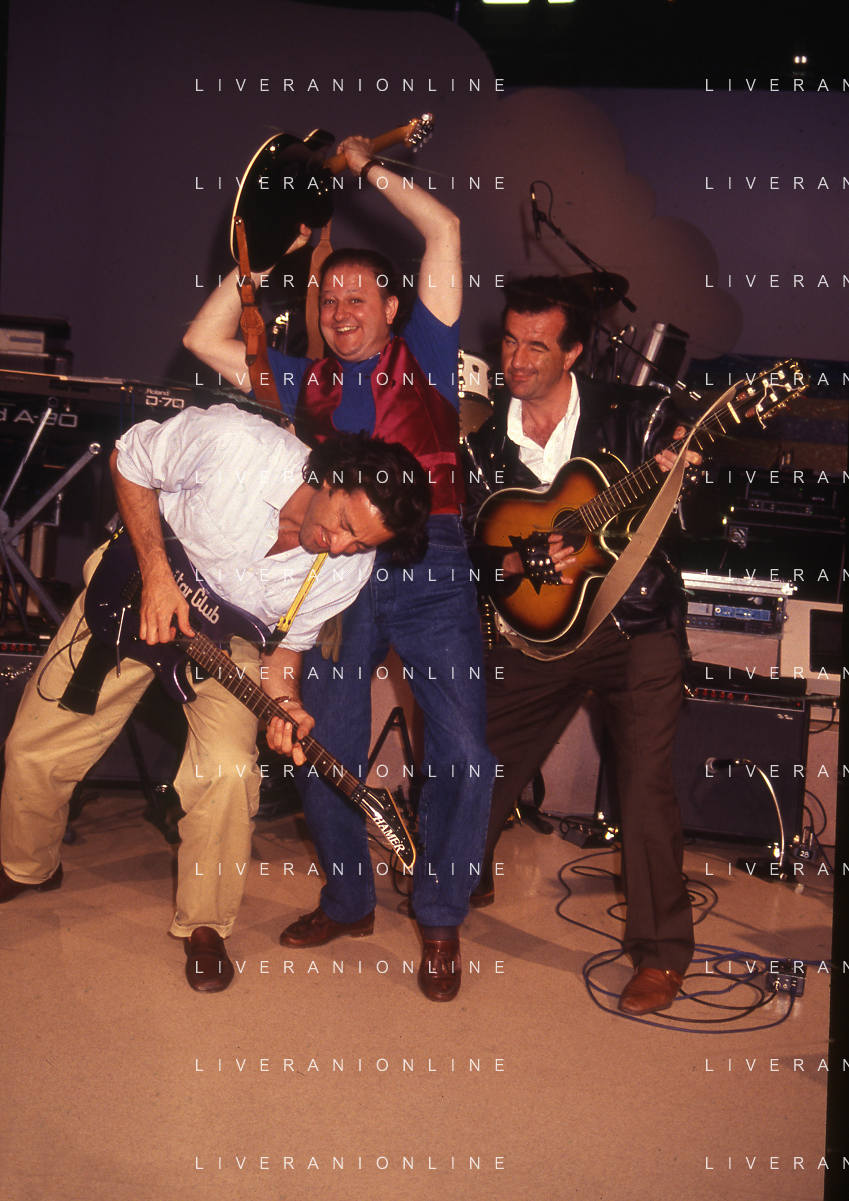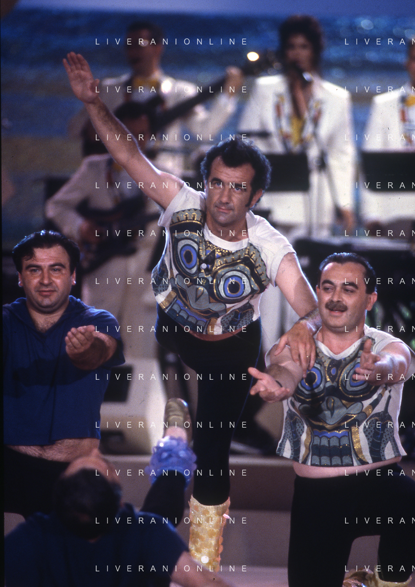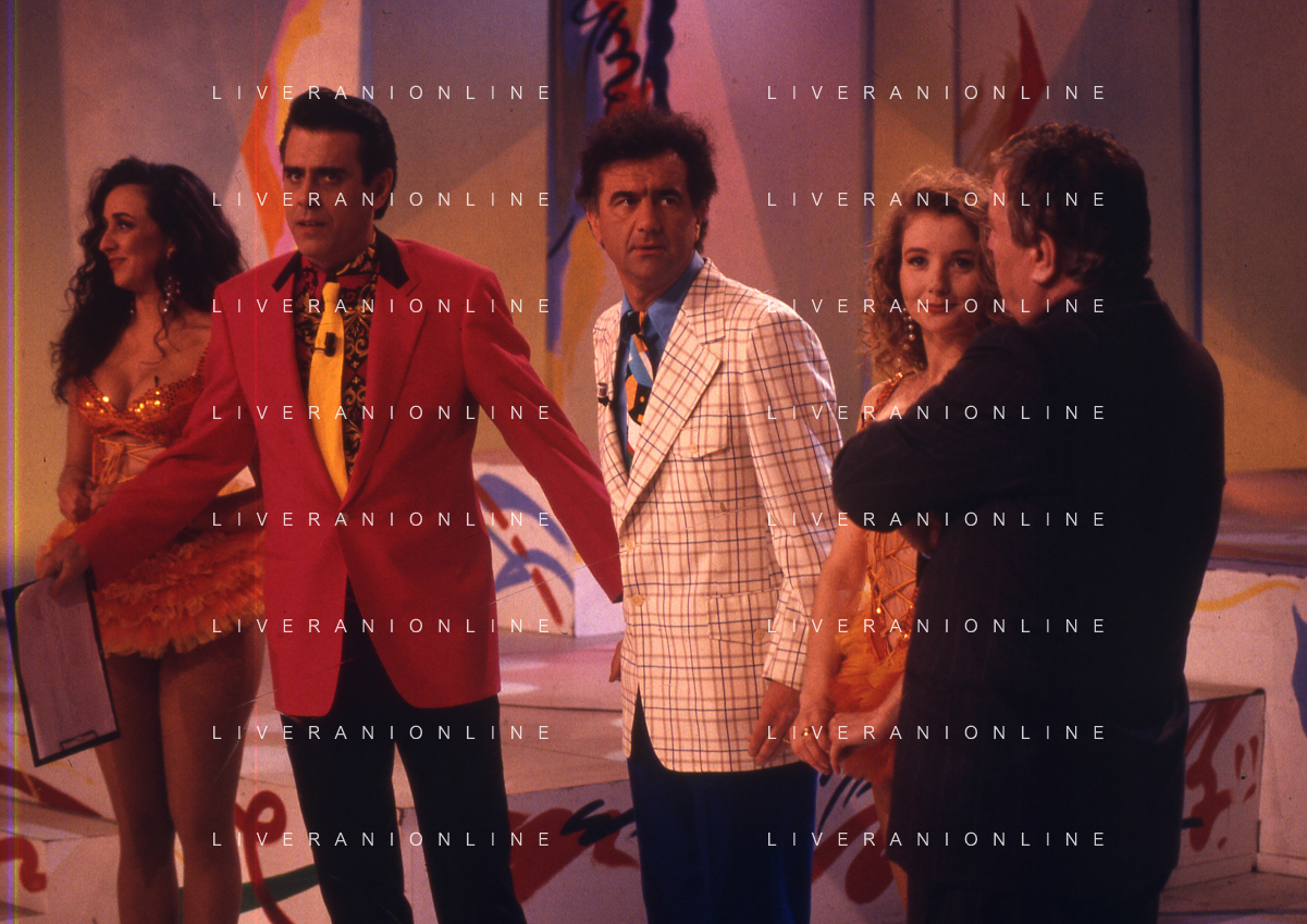 RETROSPETTIVA GENE GNOCCHI ATTORE E COMICO NELLA FOTO GENE GNOCCHI NELL'ANNO 1991 NELLA TRASMISSIONE TELEVISIVA “SAPORE DI SALE“ CON MASSIMO BOLDI LUCA BARBARESCHI E DEBORA CAPRIOGLIO AG ALDO LIVERANI SAS