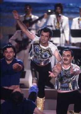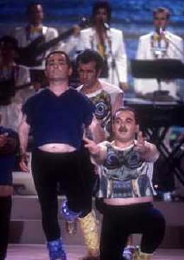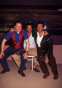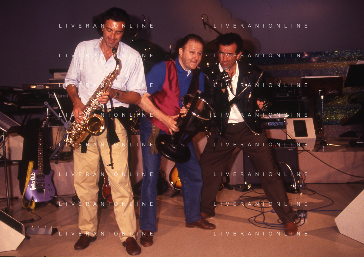 RETROSPETTIVA GENE GNOCCHI ATTORE E COMICO NELLA FOTO GENE GNOCCHI NELL'ANNO 1991 NELLA TRASMISSIONE TELEVISIVA “SAPORE DI SALE“ CON MASSIMO BOLDI LUCA BARBARESCHI AG ALDO LIVERANI SAS