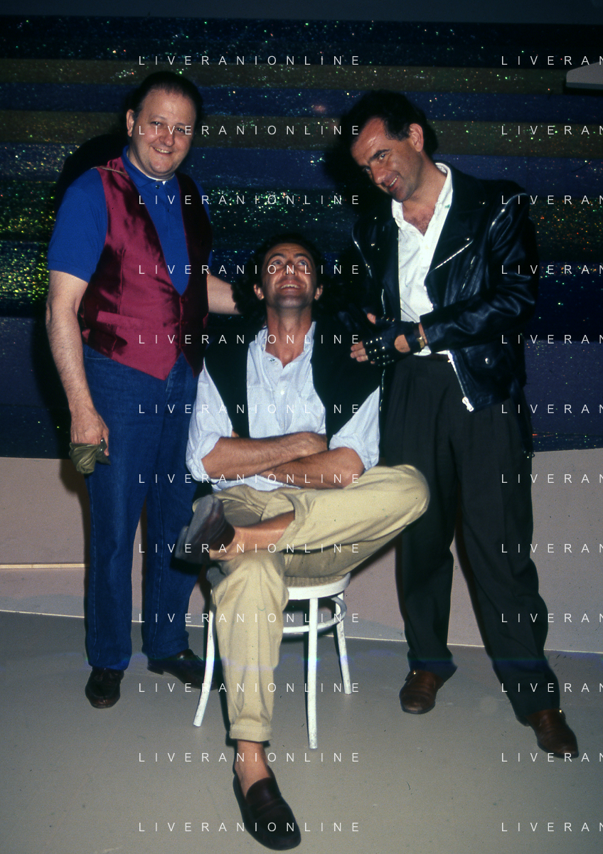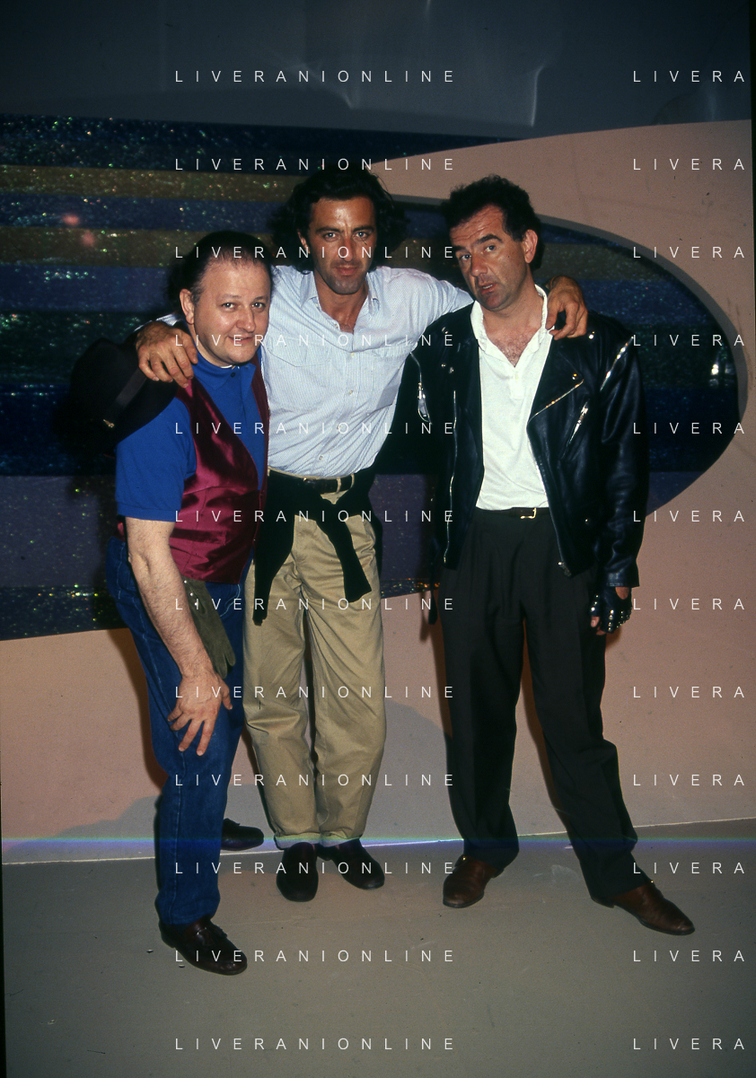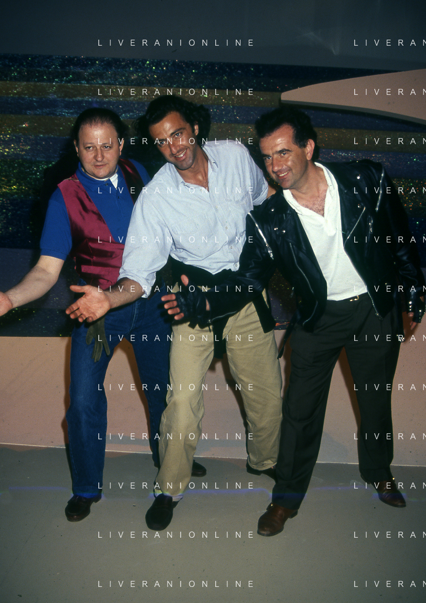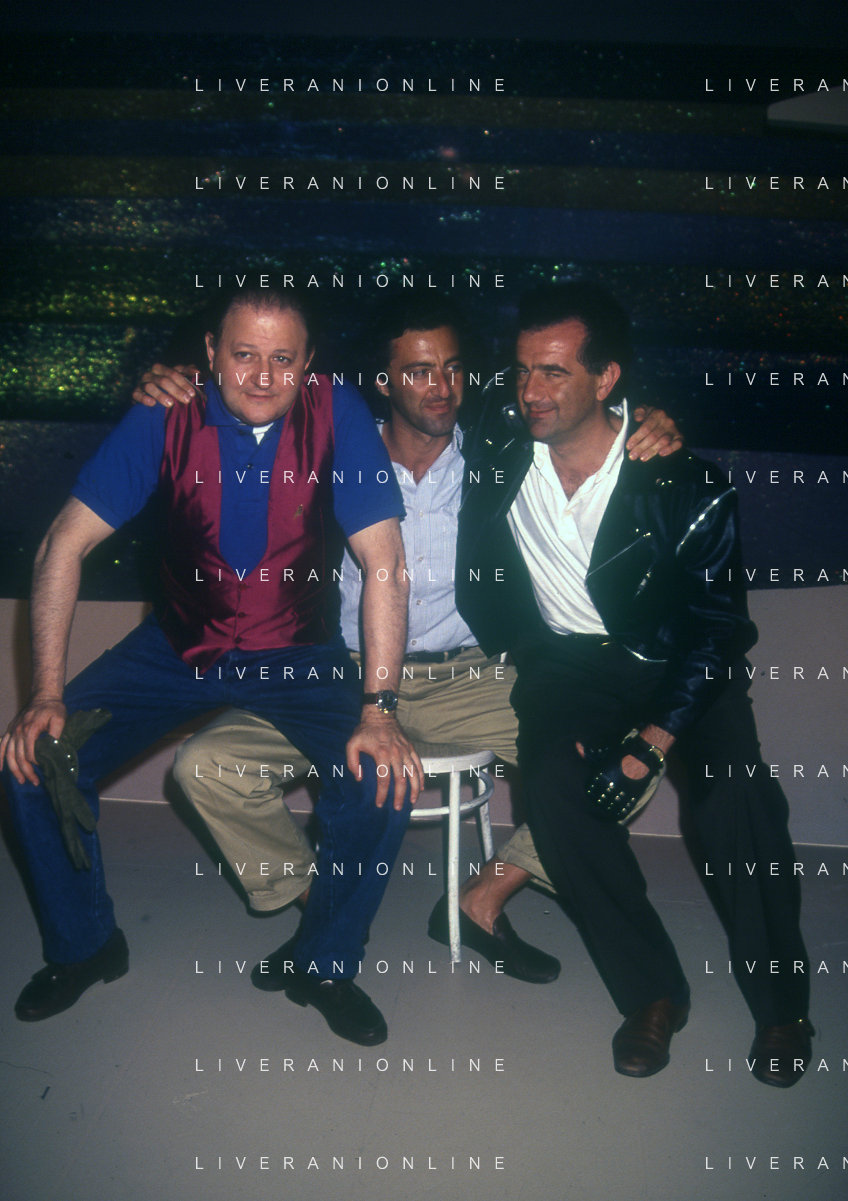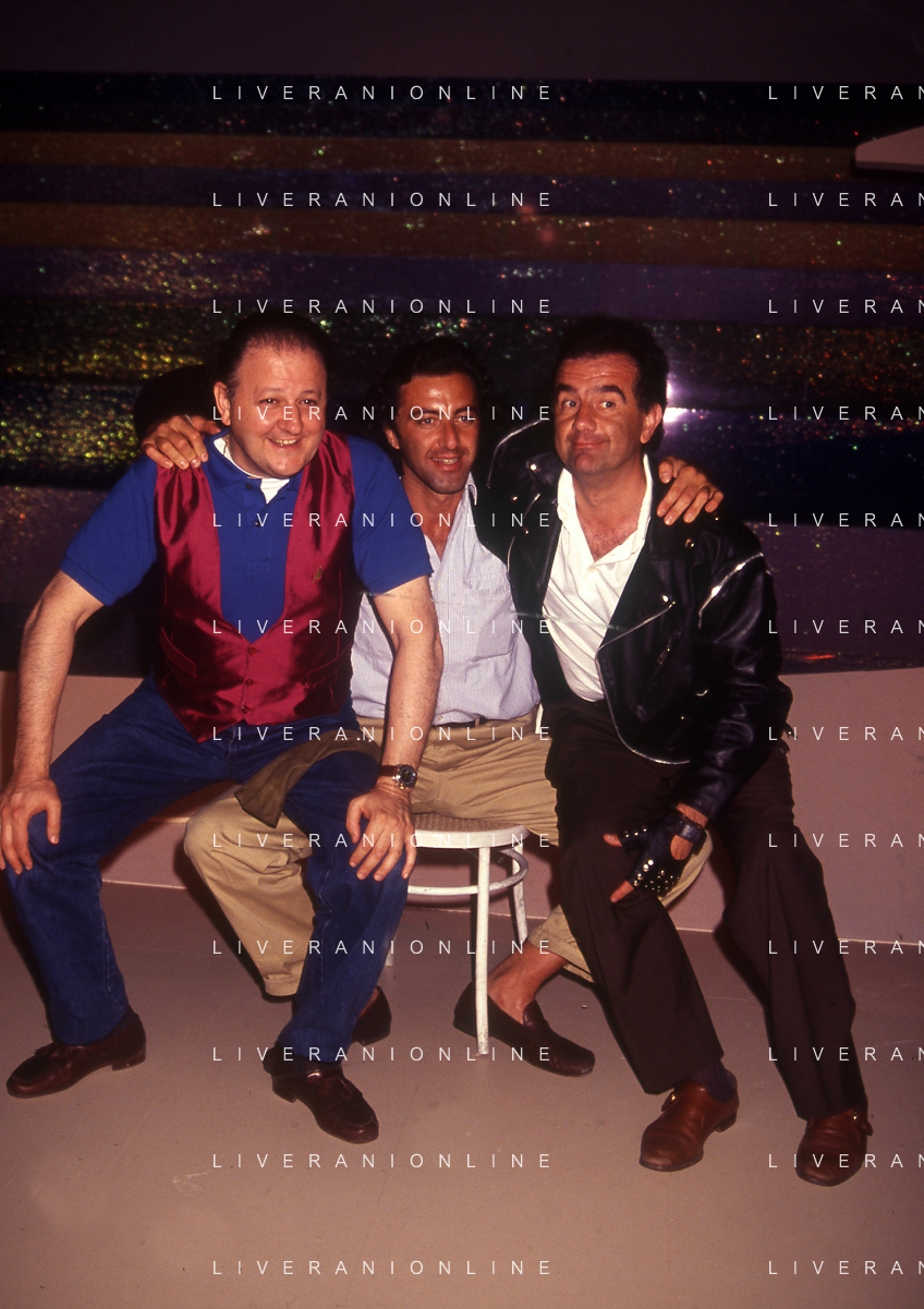RETROSPETTIVA GENE GNOCCHI ATTORE E COMICO NELLA FOTO GENE GNOCCHI NELL'ANNO 1991 NELLA TRASMISSIONE TELEVISIVA “SAPORE DI SALE“ CON MASSIMO BOLDI E LUCA BARBARESCHI AG ALDO LIVERANI SAS