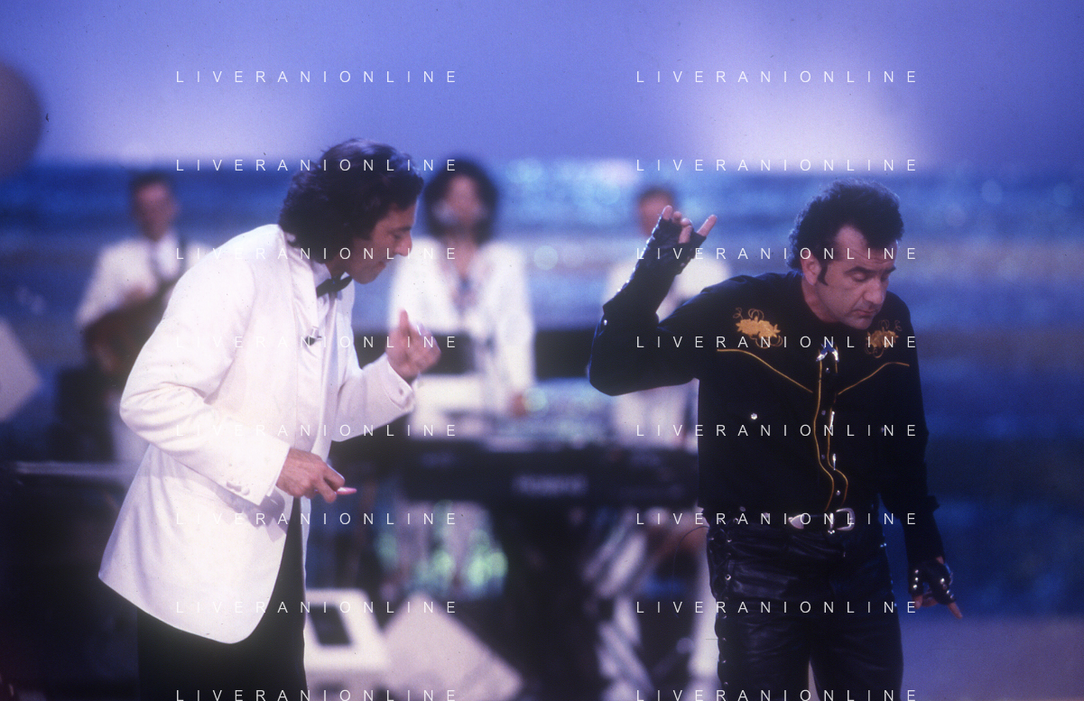 RETROSPETTIVA GENE GNOCCHI ATTORE E COMICO NELLA FOTO GENE GNOCCHI NELL'ANNO 1991 NELLA TRASMISSIONE TELEVISIVA “SAPORE DI SALE“ CON MARCO COLUMBRO AG ALDO LIVERANI SAS