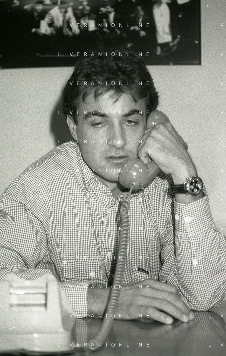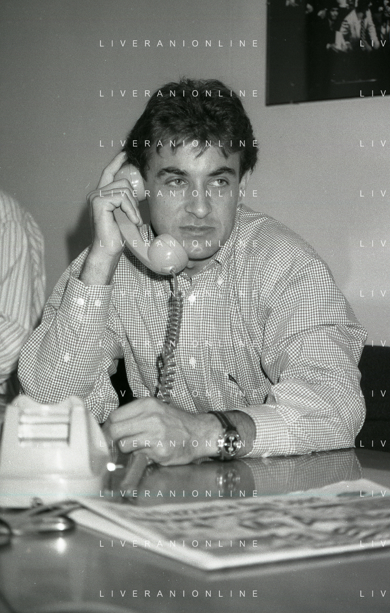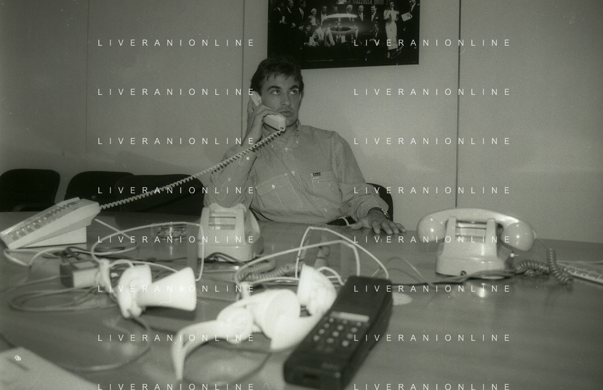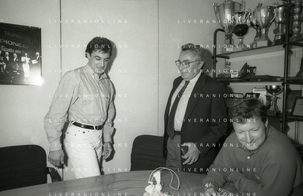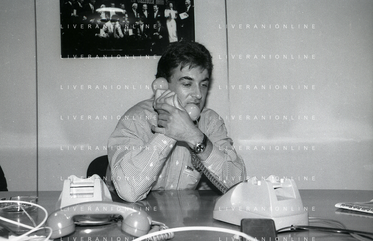 1993 MILANO REDAZIONE DELLA GAZZETTA DELLO SPORT OSPITE PER LE TELEFONATE COI LETTORI JEAN ALESI NELLA FOTO JEAN ALESI CON IL GIORNALISTA PINO ALLIEVI ED ENRICO MINAZZI AG ALDO LIVERANI SAS
