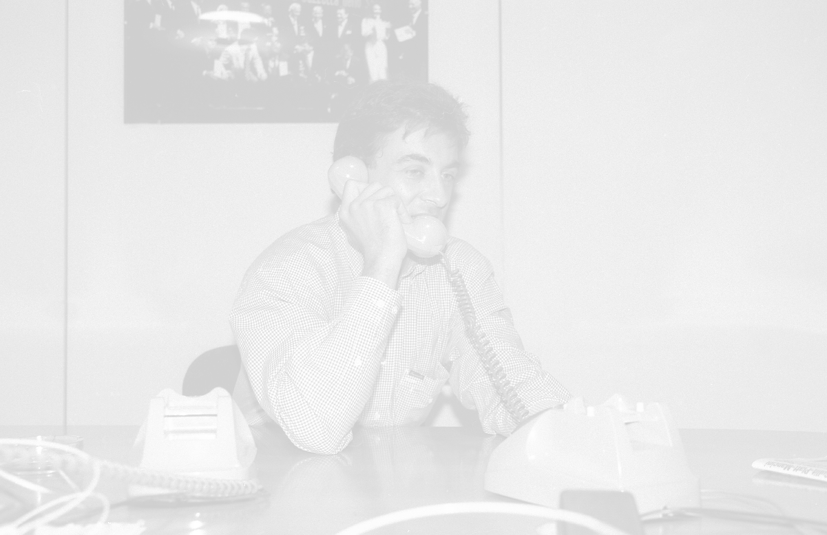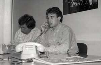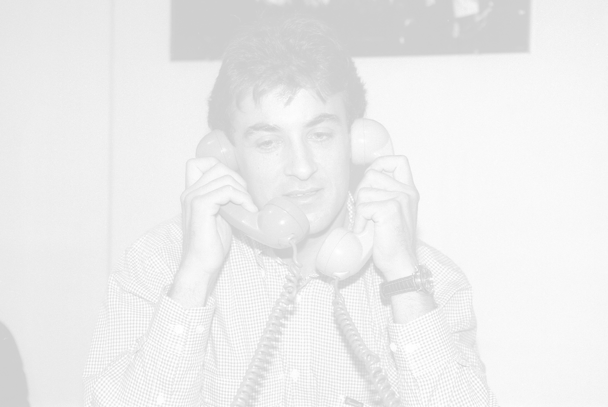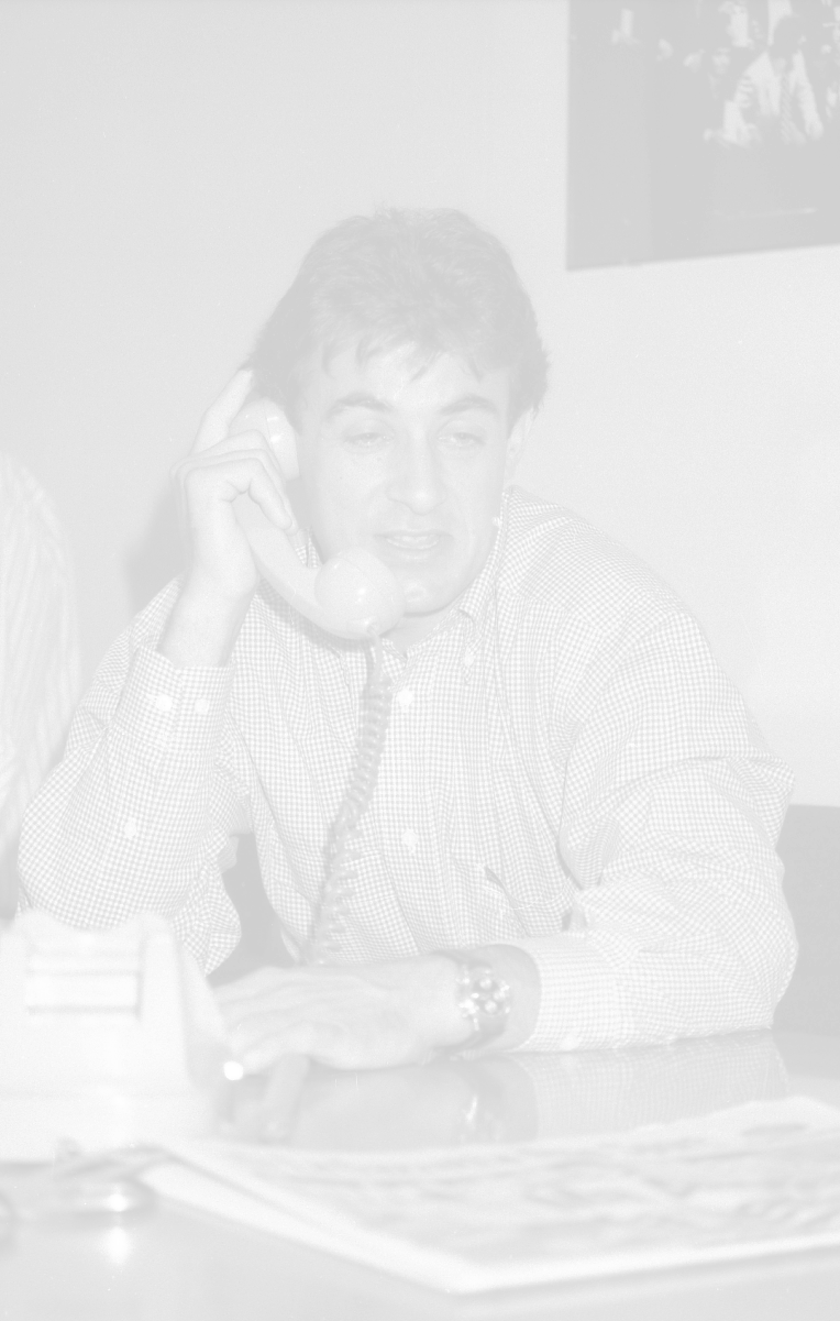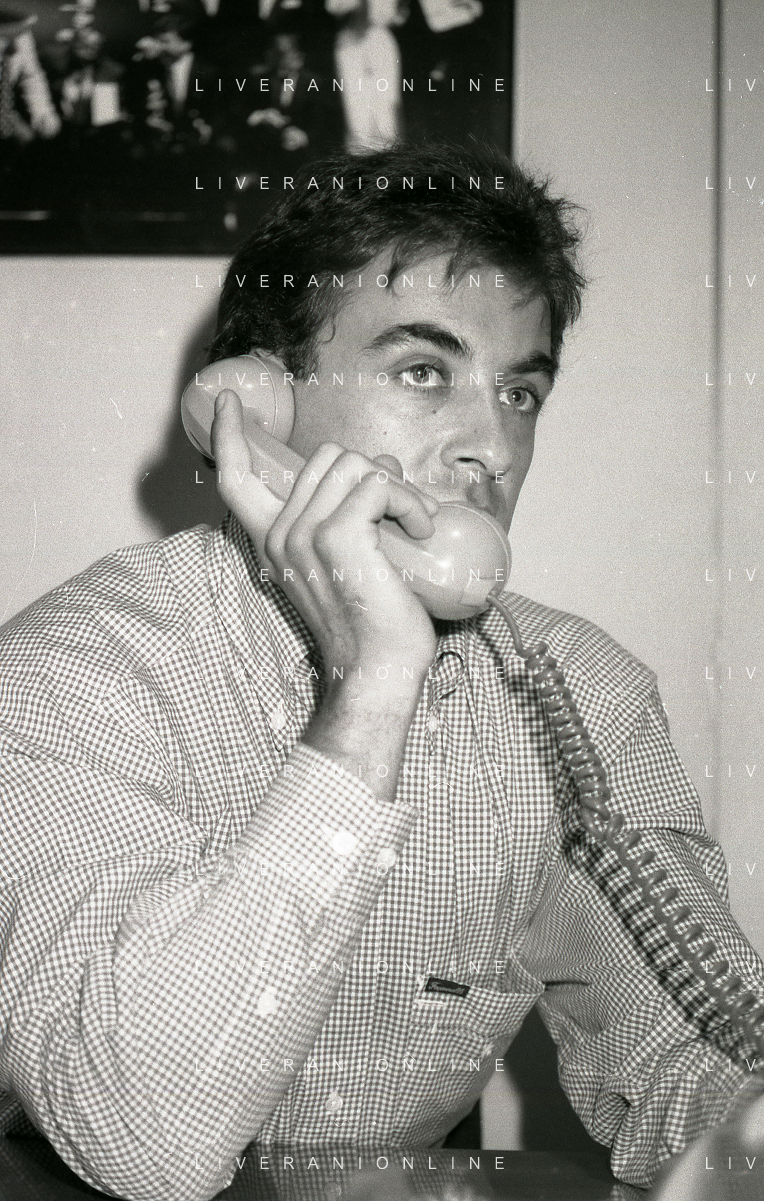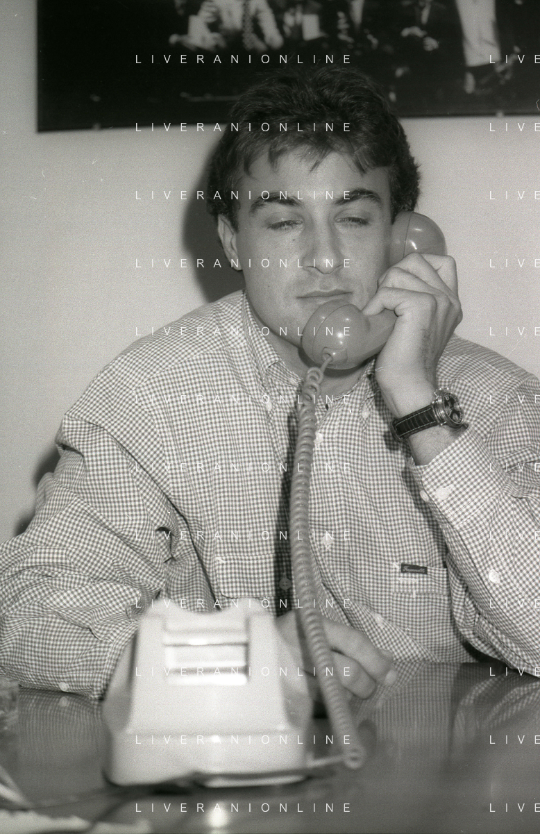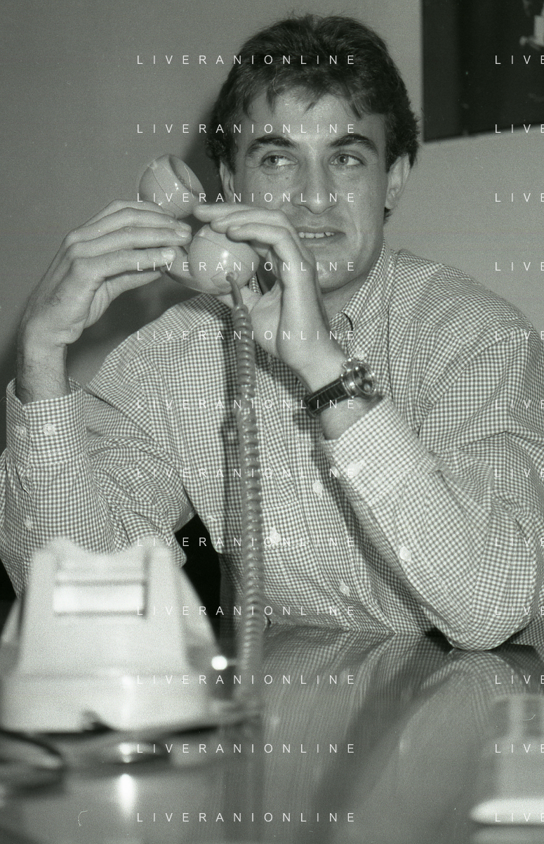 1993 MILANO REDAZIONE DELLA GAZZETTA DELLO SPORT OSPITE PER LE TELEFONATE COI LETTORI JEAN ALESI NELLA FOTO JEAN ALESI CON IL GIORNALISTA PINO ALLIEVI ED ENRICO MINAZZI AG ALDO LIVERANI SAS
