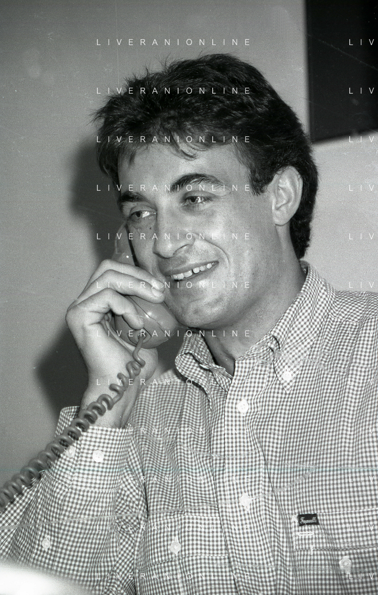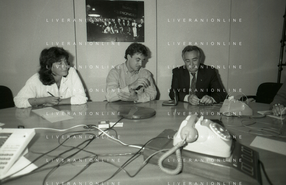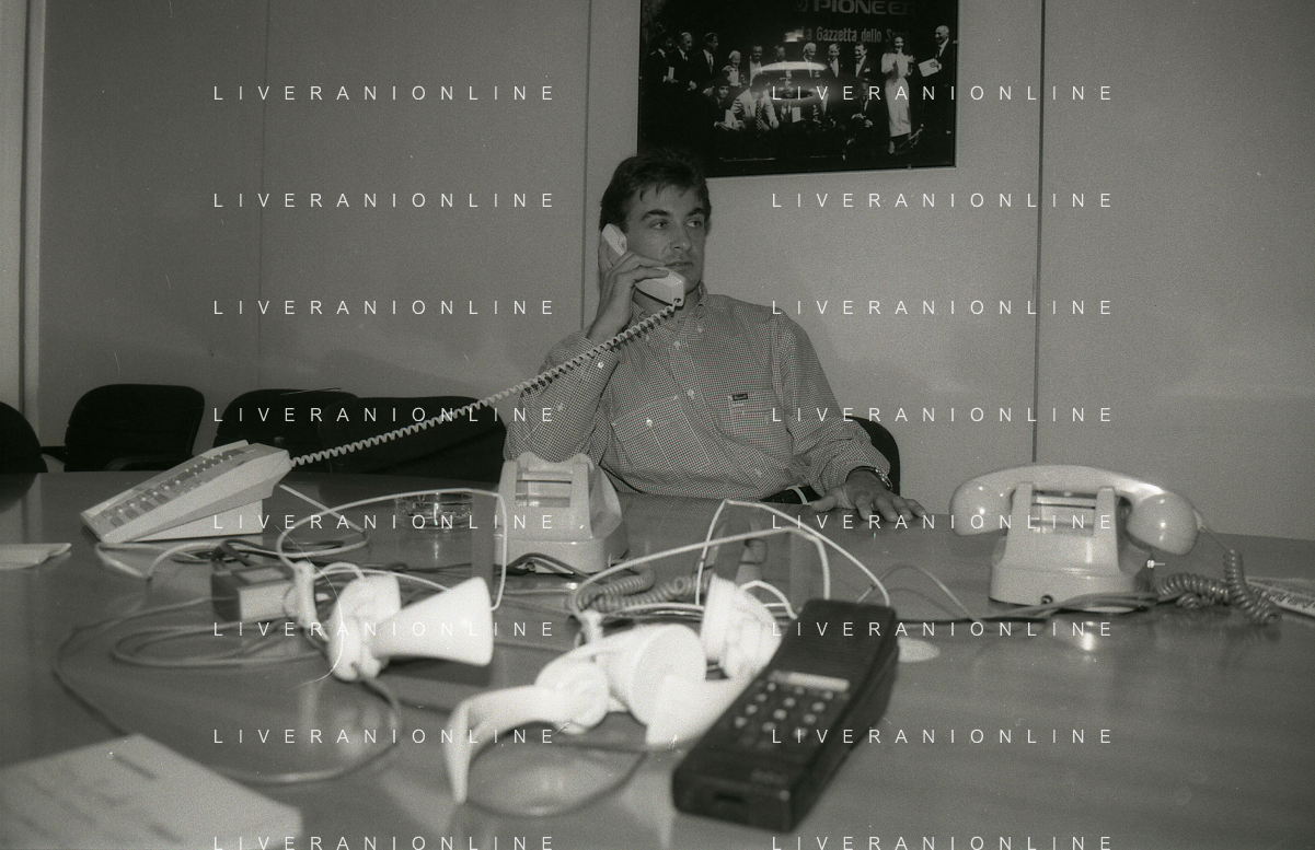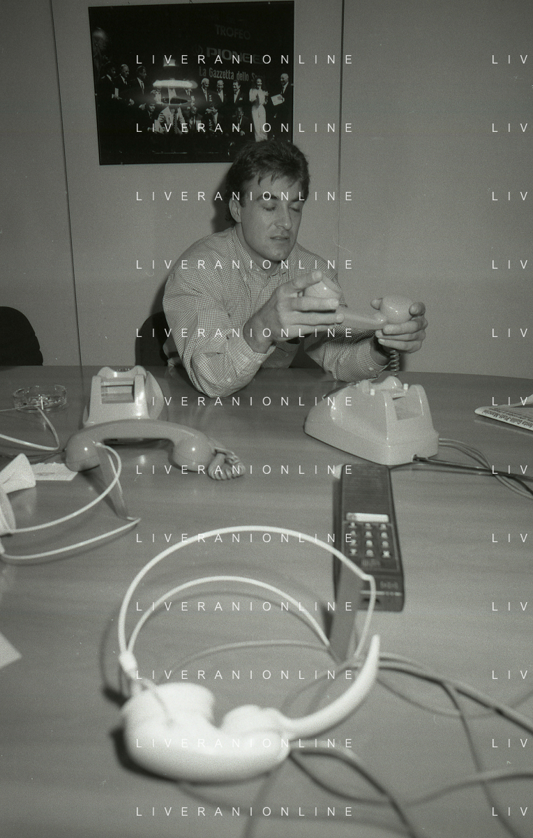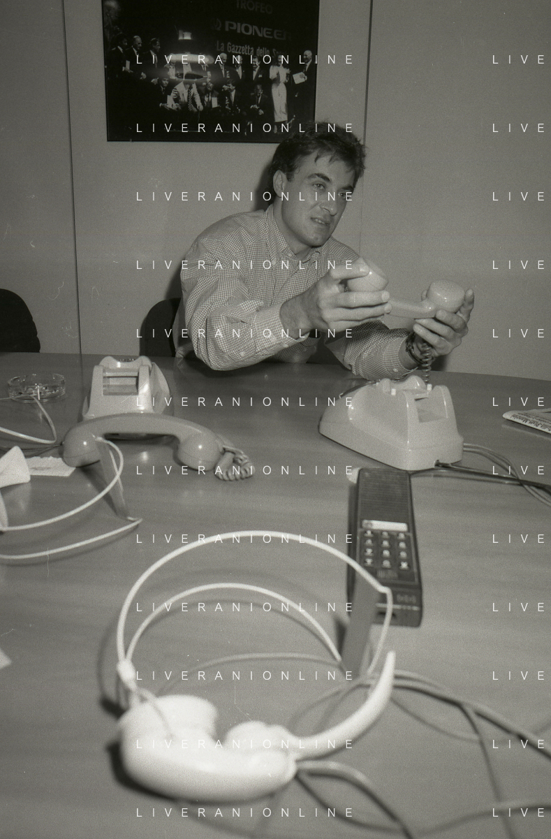 1993 MILANO REDAZIONE DELLA GAZZETTA DELLO SPORT OSPITE PER LE TELEFONATE COI LETTORI JEAN ALESI NELLA FOTO JEAN ALESI CON IL GIORNALISTA PINO ALLIEVI ED ENRICOMINAZZI AG ALDO LIVERANI SAS