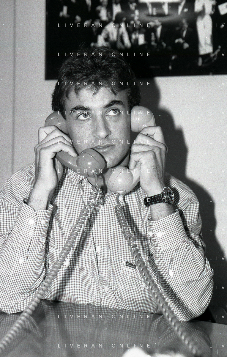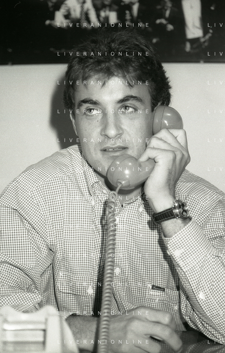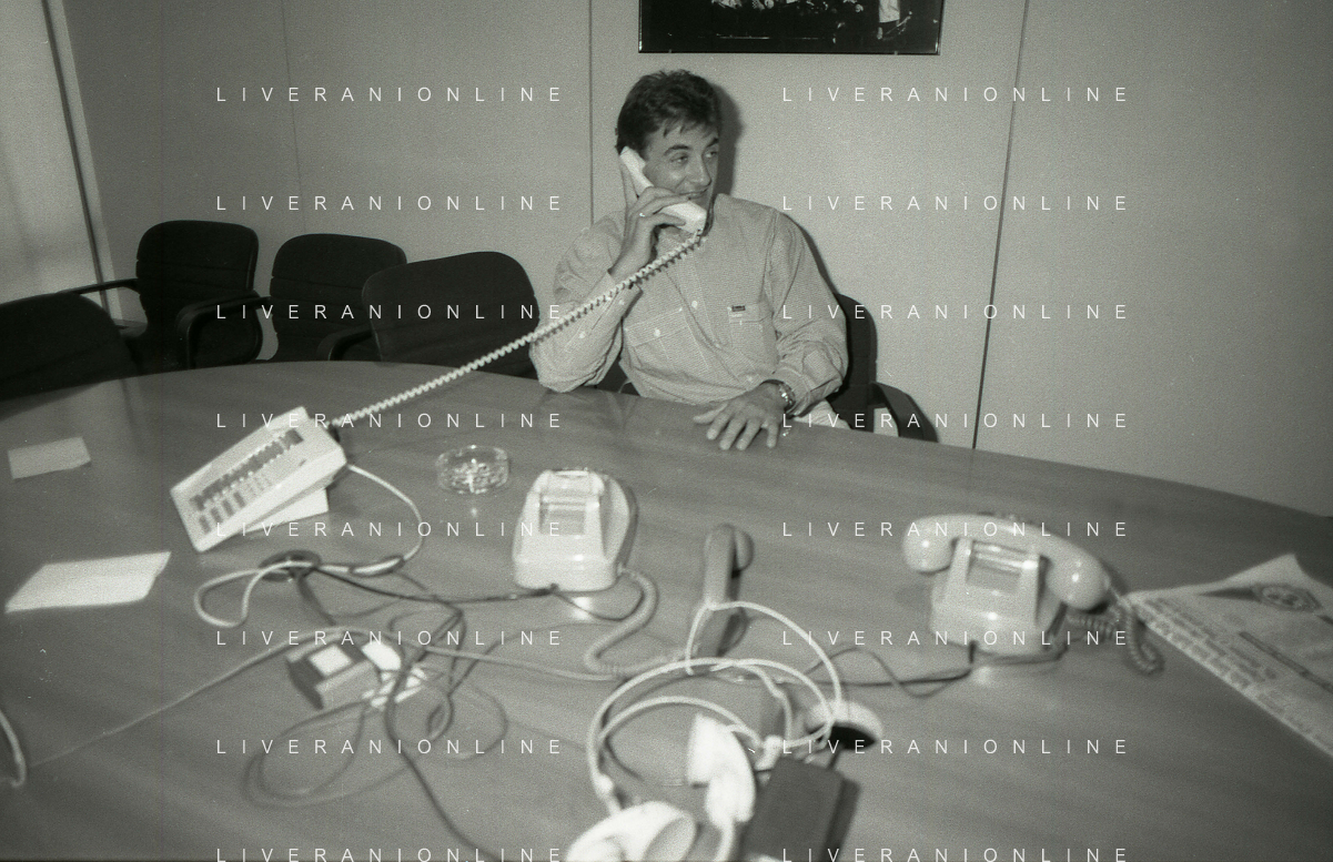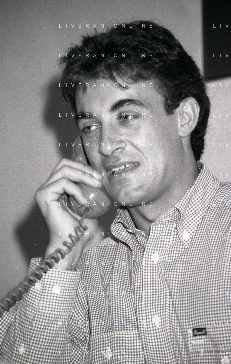 1993 MILANO REDAZIONE DELLA GAZZETTA DELLO SPORT OSPITE PER LE TELEFONATE COI LETTORI JEAN ALESI NELLA FOTO JEAN ALESI CON IL GIORNALISTA PINO ALLIEVI ED ENRICOMINAZZI AG ALDO LIVERANI SAS