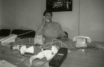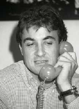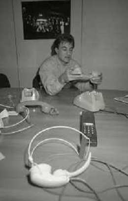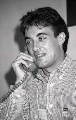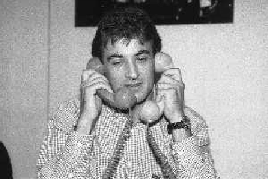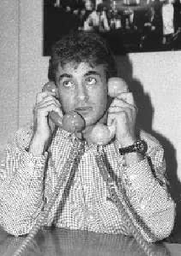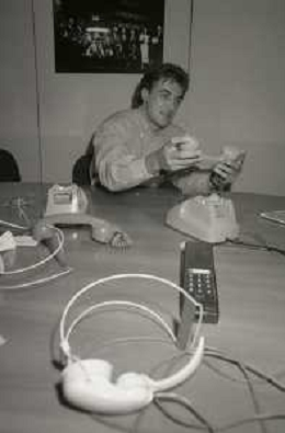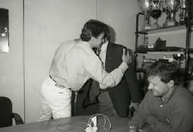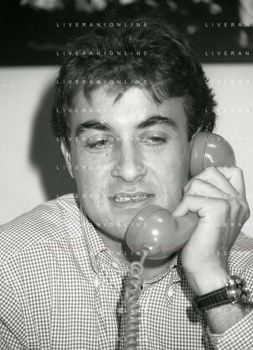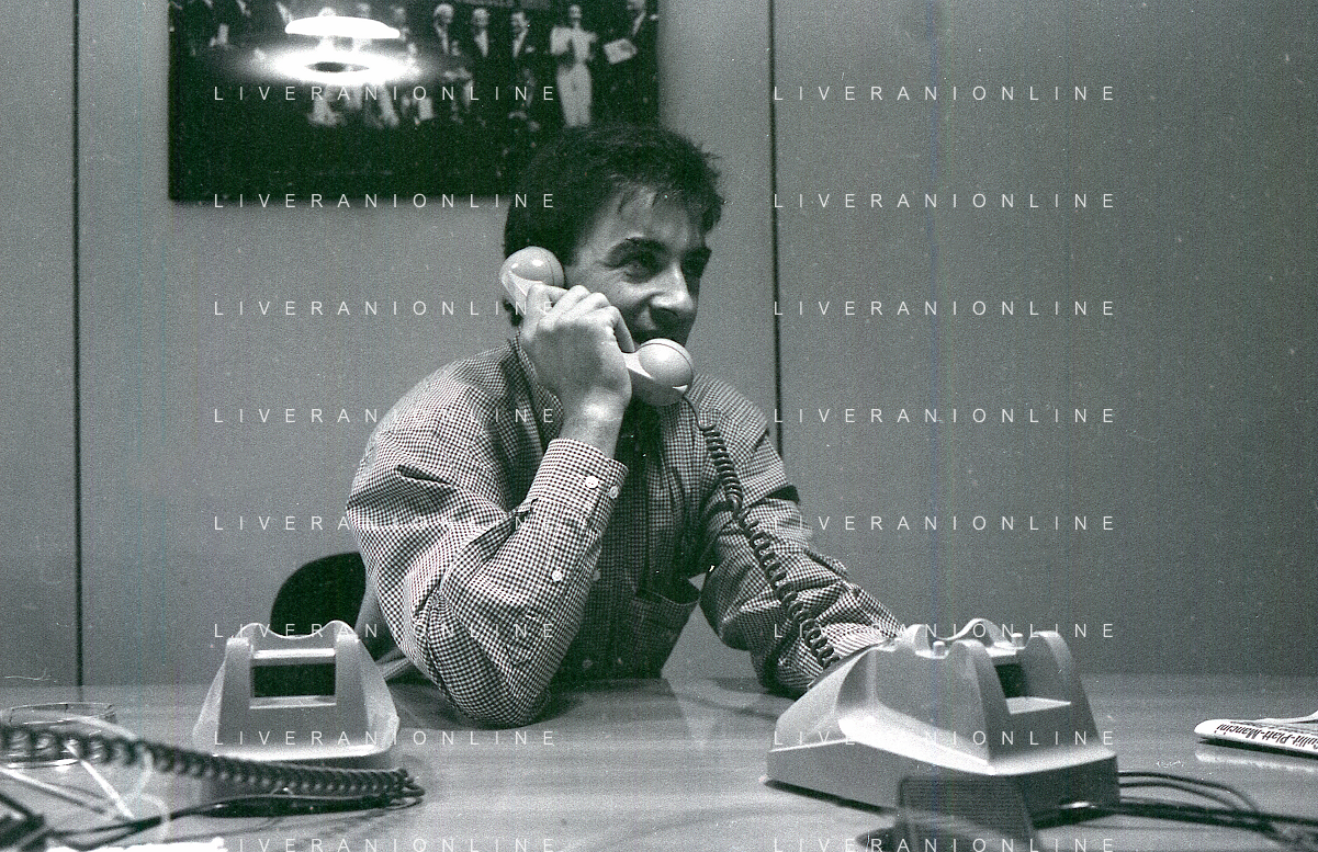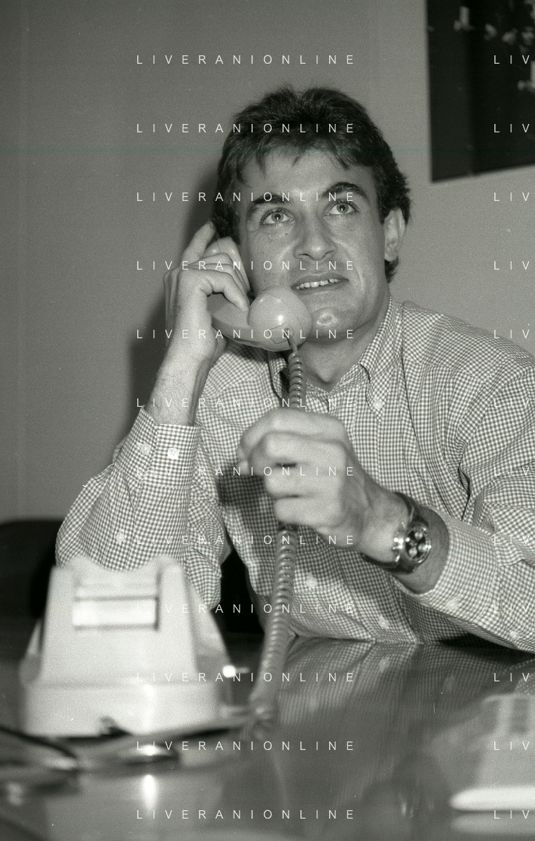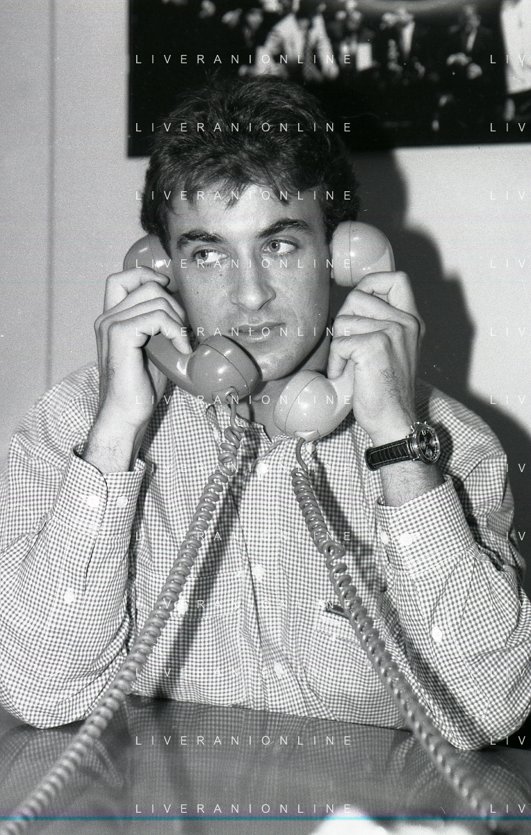 1993 MILANO REDAZIONE DELLA GAZZETTA DELLO SPORT OSPITE PER LE TELEFONATE COI LETTORI JEAN ALESI NELLA FOTO JEAN ALESI CON IL GIORNALISTA PINO ALLIEVI ED ENRICOMINAZZI AG ALDO LIVERANI SAS