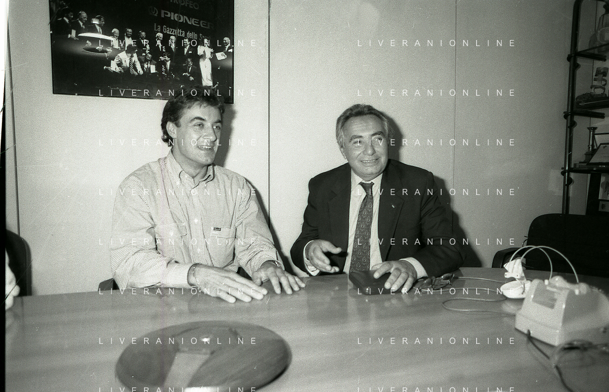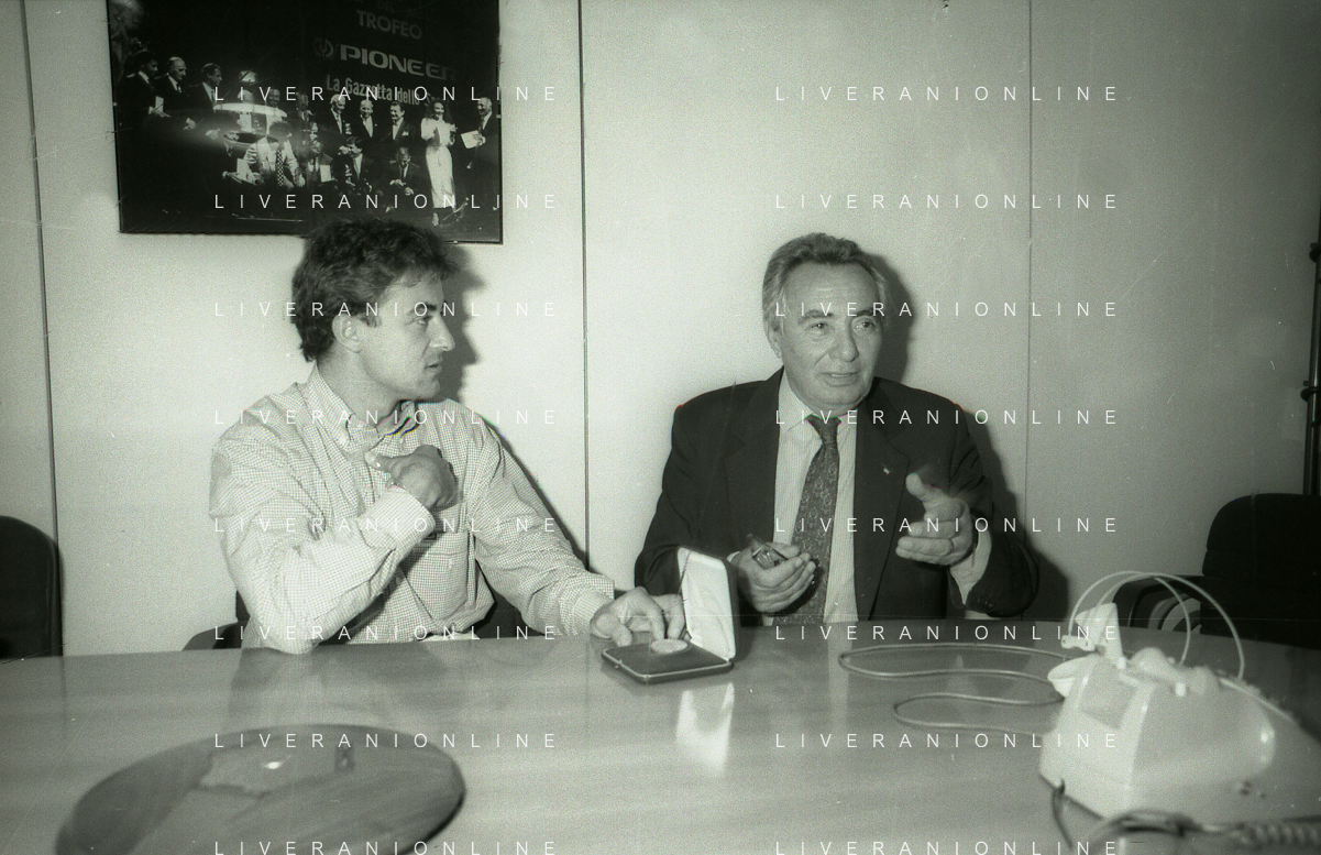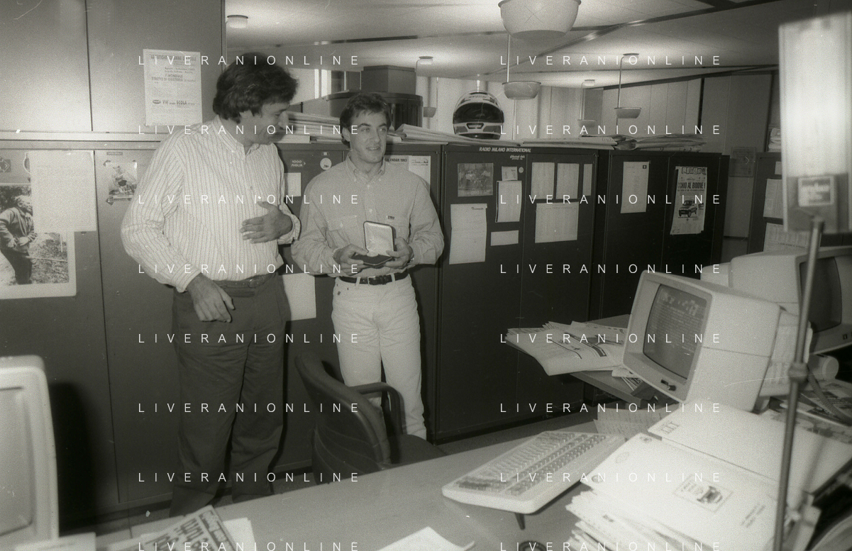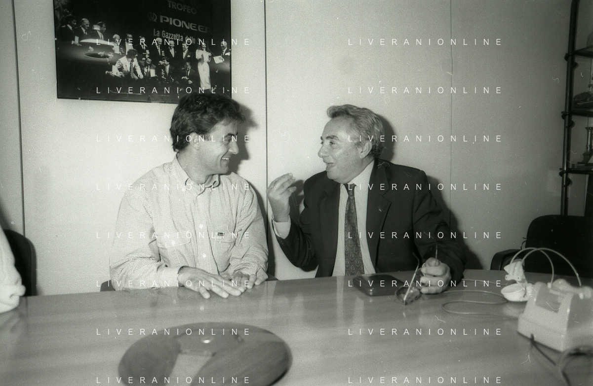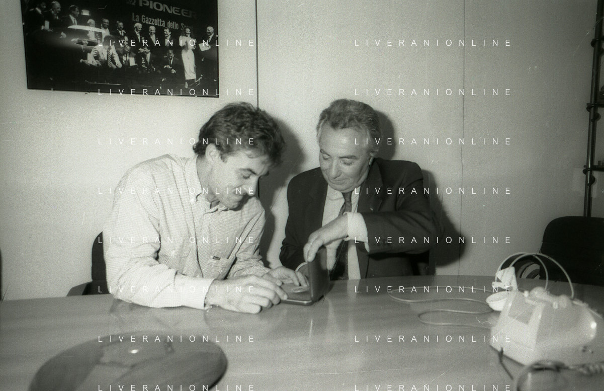 1993 MILANO REDAZIONE DELLA GAZZETTA DELLO SPORT OSPITE PER LE TELEFONATE COI LETTORI JEAN ALESI NELLA FOTO JEAN ALESI CON IL GIORNALISTA PINO ALLIEVI AG ALDO LIVERANI SAS