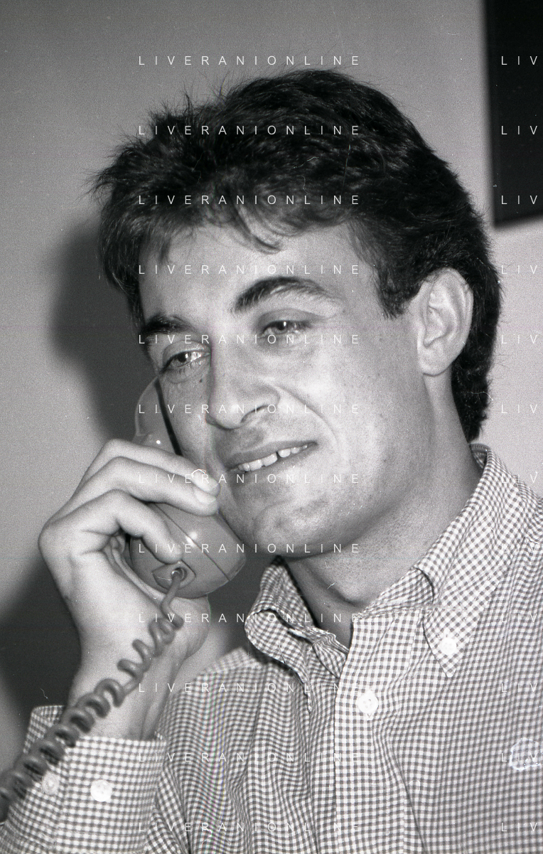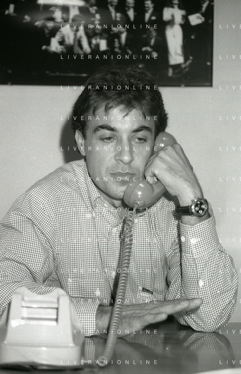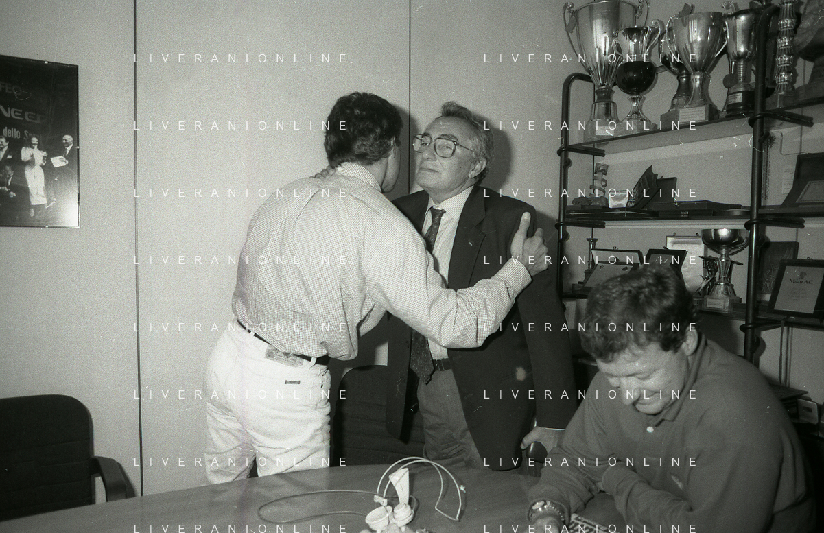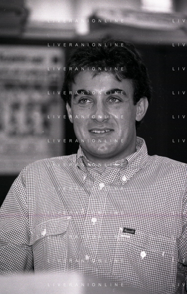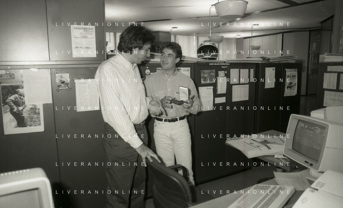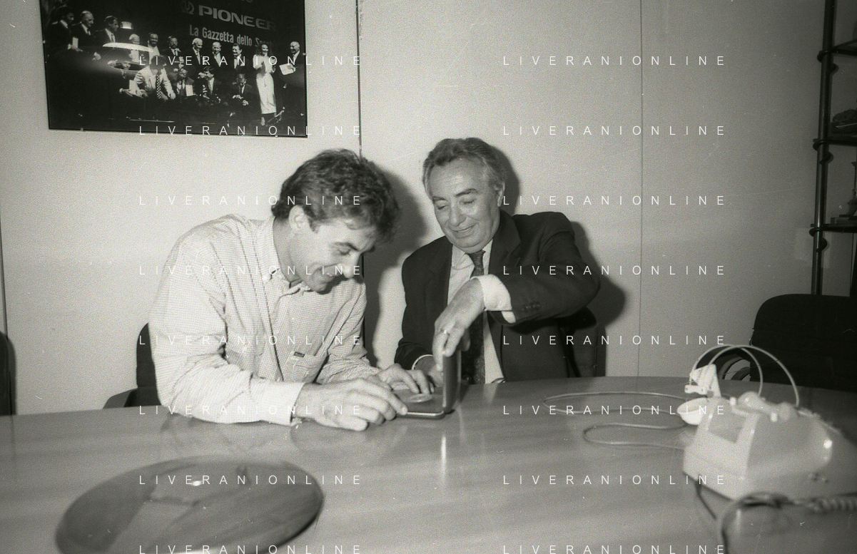 1993 MILANO REDAZIONE DELLA GAZZETTA DELLO SPORT OSPITE PER LE TELEFONATE COI LETTORI JEAN ALESI NELLA FOTO JEAN ALESI CON IL GIORNALISTA PINO ALLIEVI AG ALDO LIVERANI SAS