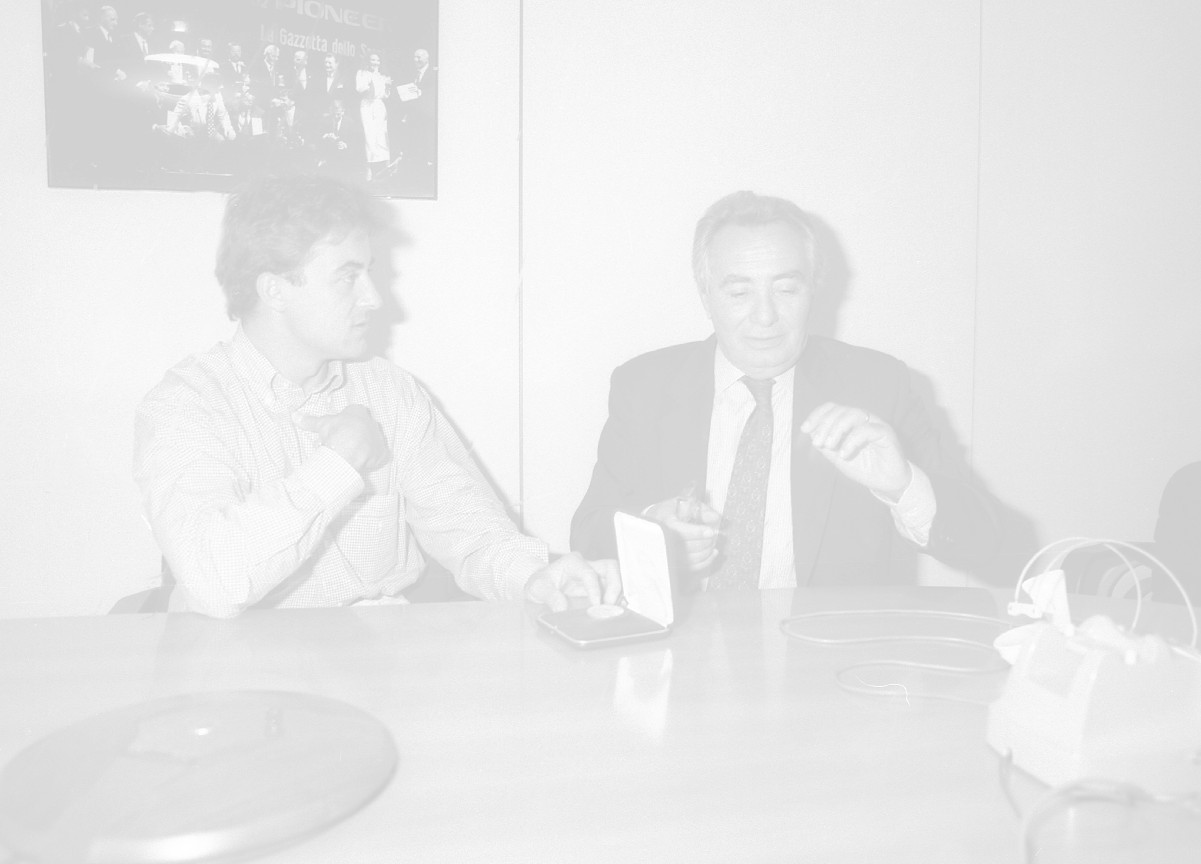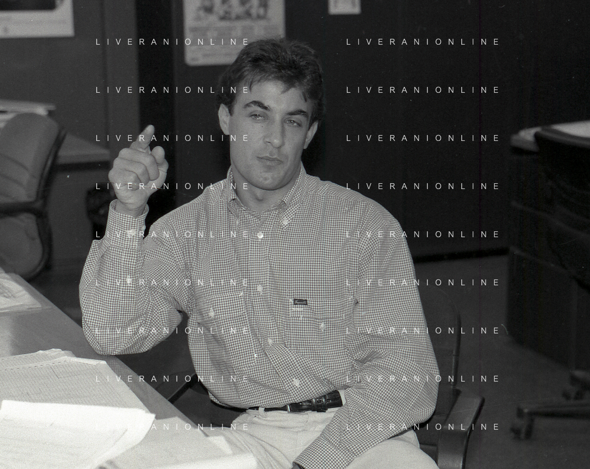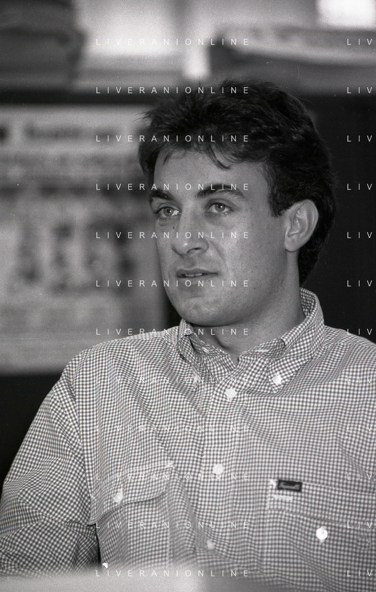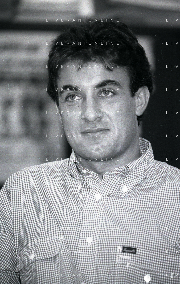 1993 MILANO REDAZIONE DELLA GAZZETTA DELLO SPORT OSPITE PER LE TELEFONATE COI LETTORI JEAN ALESI NELLA FOTO JEAN ALESI CON IL GIORNALISTA PINO ALLIEVI AG ALDO LIVERANI SAS