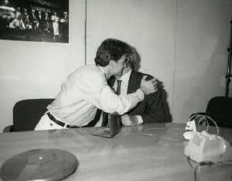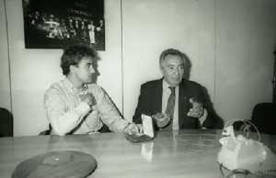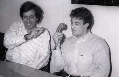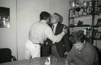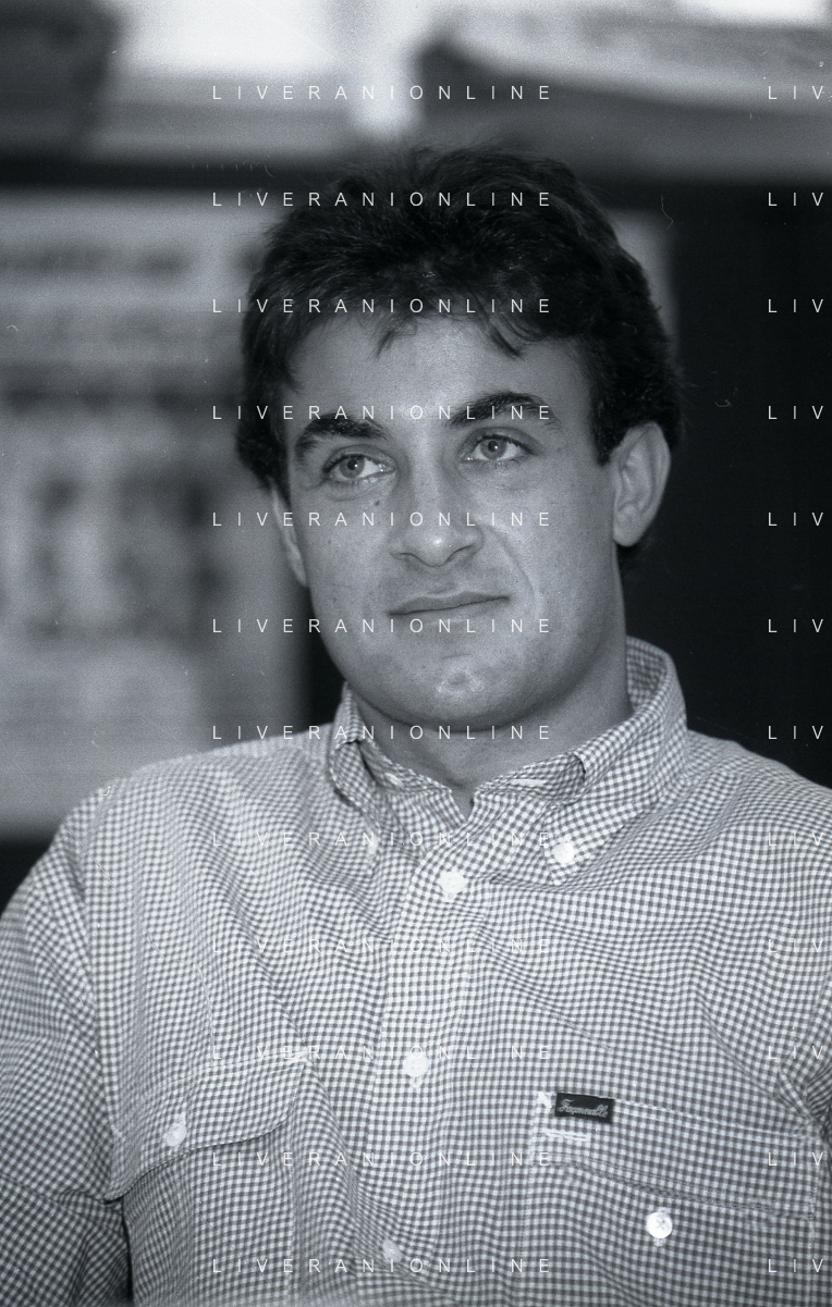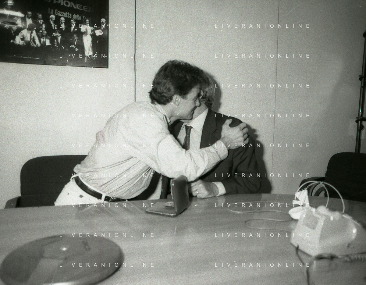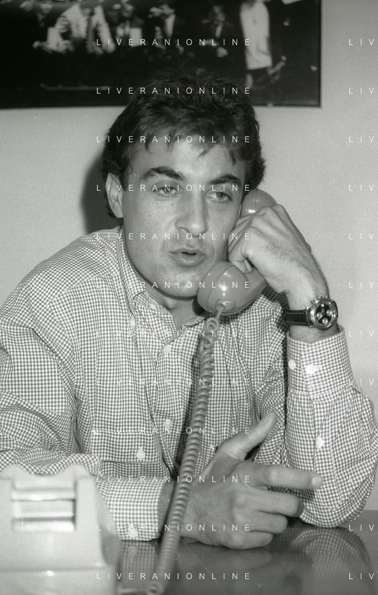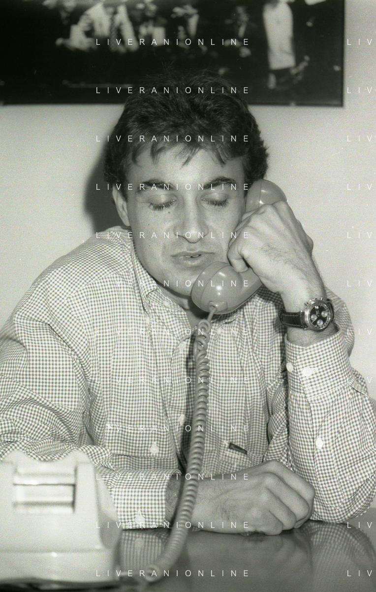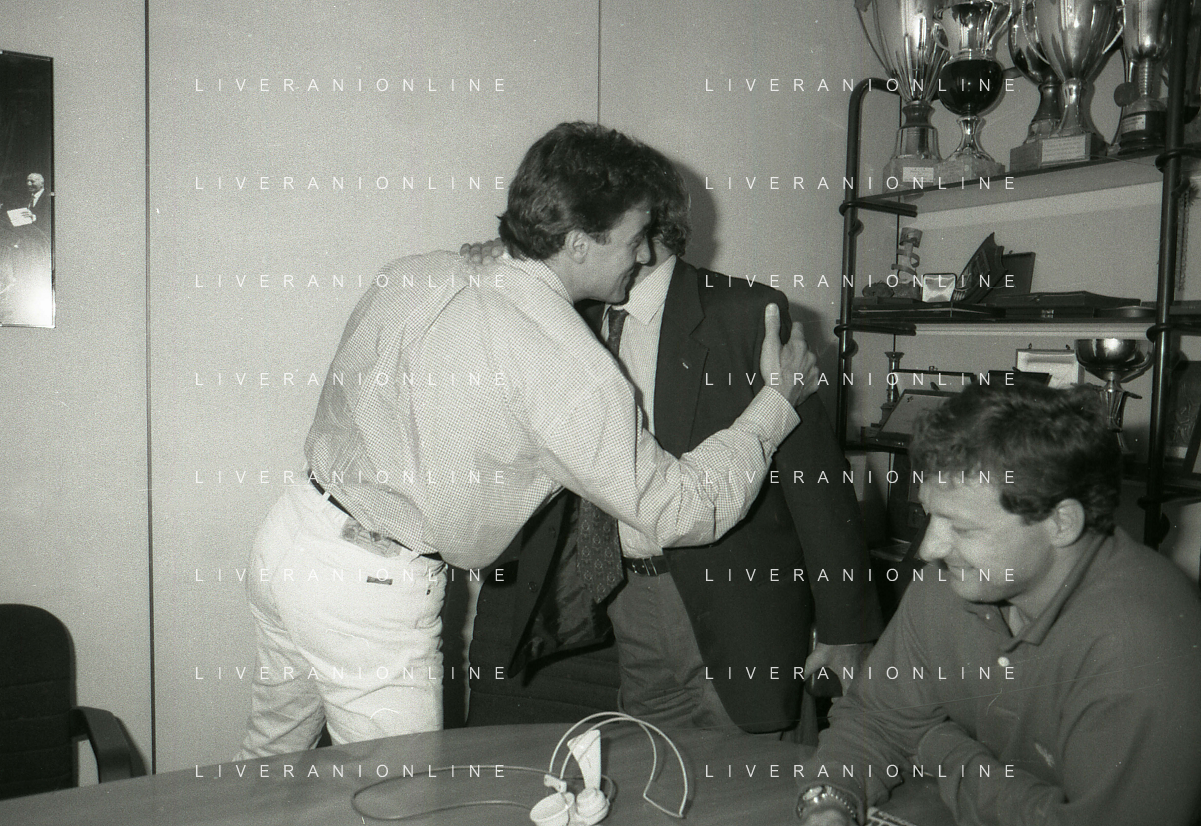 1993 MILANO REDAZIONE DELLA GAZZETTA DELLO SPORT OSPITE PER LE TELEFONATE COI LETTORI JEAN ALESI NELLA FOTO JEAN ALESI CON IL GIORNALISTA PINO ALLIEVI AG ALDO LIVERANI SAS