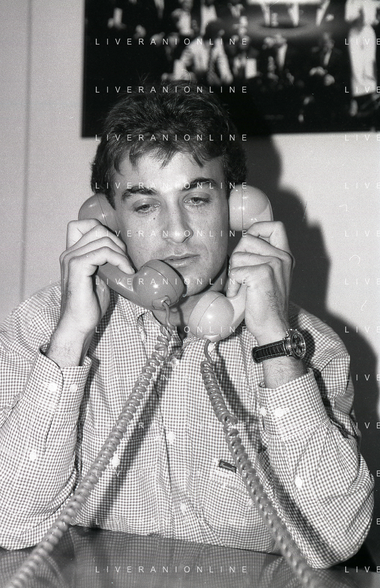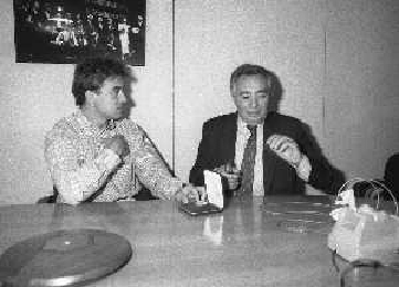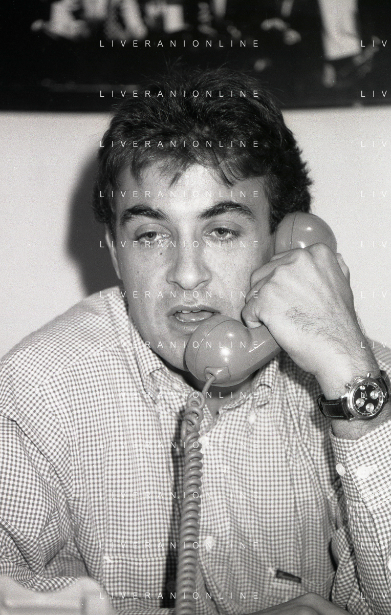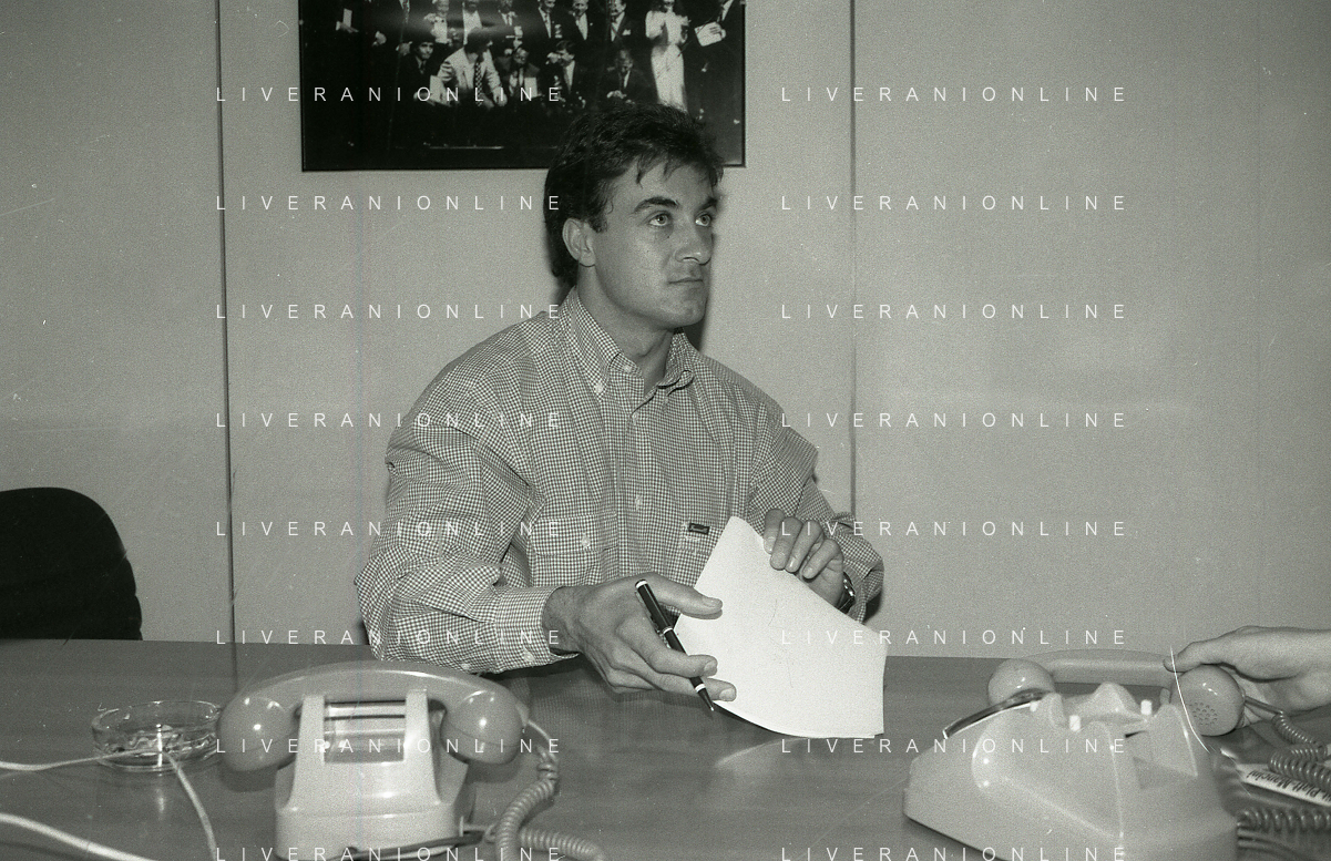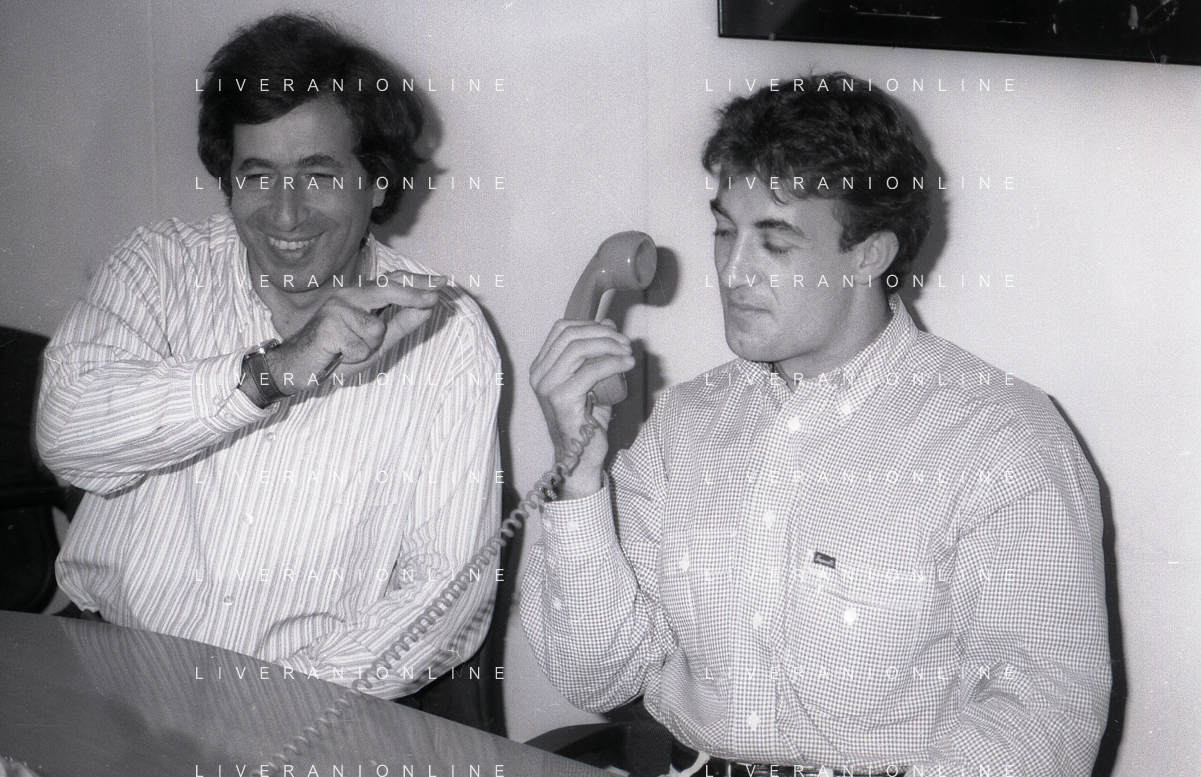 1993 MILANO REDAZIONE DELLA GAZZETTA DELLO SPORT OSPITE PER LE TELEFONATE COI LETTORI JEAN ALESI NELLA FOTO JEAN ALESI CONIL DIRETTORE DELLA GAZZETTA DELLO SPORT CANDIDO CANNAVO' AG ALDO LIVERANI SAS