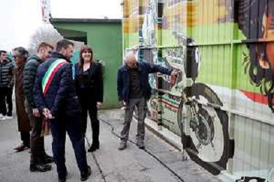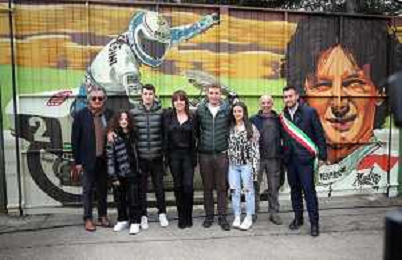 IMOLA 23 02 2023 AUTODROMO ENZO E DINO FERRARI VARIANTE ALTA "CIAO FAUSTO" PER RICORDARE UN GRANDE CAMPIONE IMOLESE E INAUGURAZIONE DEL MURALES DEDICATO A FAUSTO GRESINI L'AUTORE FUNGO NELLA FOTO SINDACO MARCO PANIERI NADIA GRESINI GIANCARLO MINARDI E L'AUTORE DEL MURALES FUNGO FOTO GIANNI SANNA-AG ALDO LIVERANI SAS