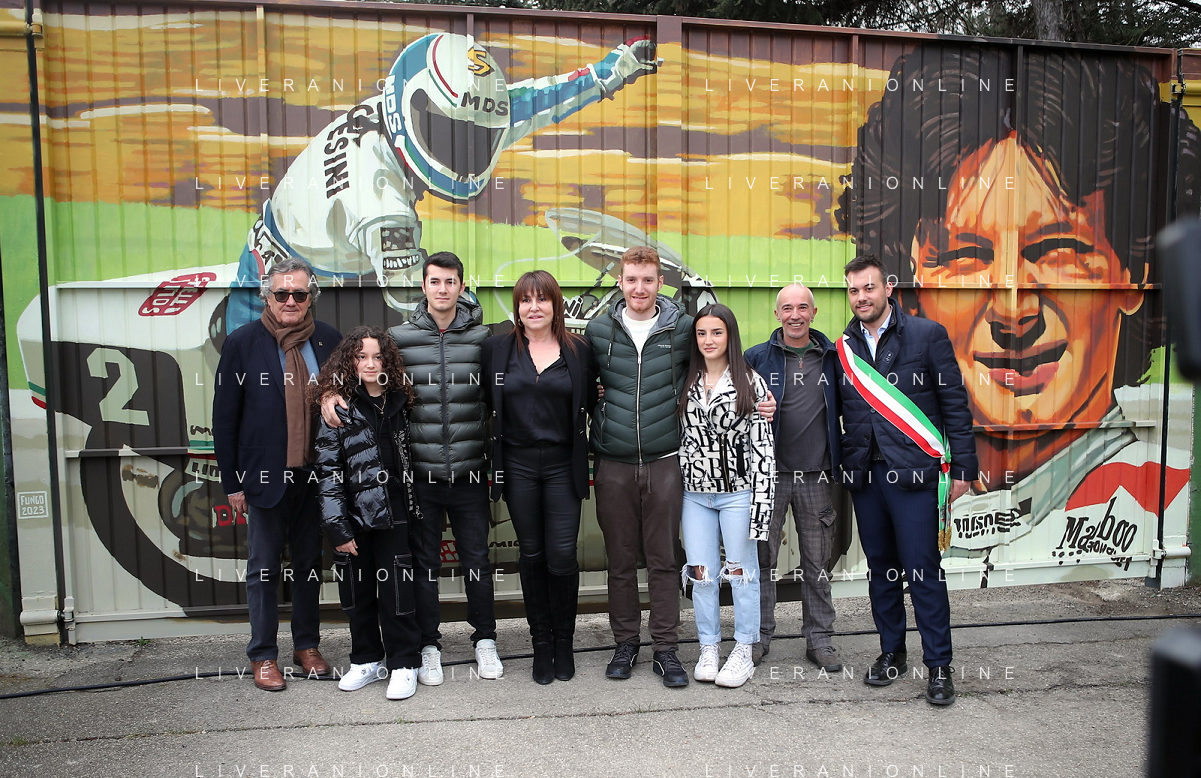 IMOLA 23 02 2023 AUTODROMO ENZO E DINO FERRARI VARIANTE ALTA "CIAO FAUSTO" PER RICORDARE UN GRANDE CAMPIONE IMOLESE E INAUGURAZIONE DEL MURALES DEDICATO A FAUSTO GRESINI L'AUTORE FUNGO NELLA FOTO GIANCARLO MINARDI MARCO PANIERI FUNGO CON NADIA GRESINI E I FIGLI DI FAUSO E NADIA FOTO GIANNI SANNA-AG ALDO LIVERANI SAS
