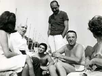 RETROSPETTIVA ANGELO RIZZOLI EDITORE E PRODUTTORE CINEMATOGRAFICO NELLA FOTO ANGELO RIZZOLI PAT BROWN E TONINO CERVI A ISCHIA AG ALDO LIVERANI SAS