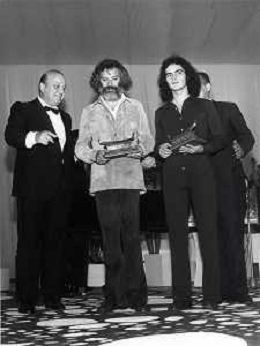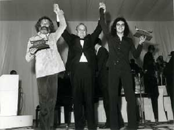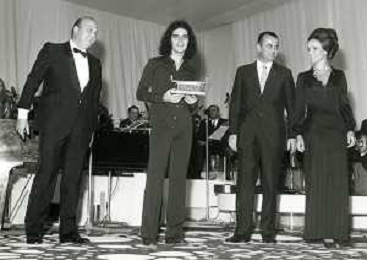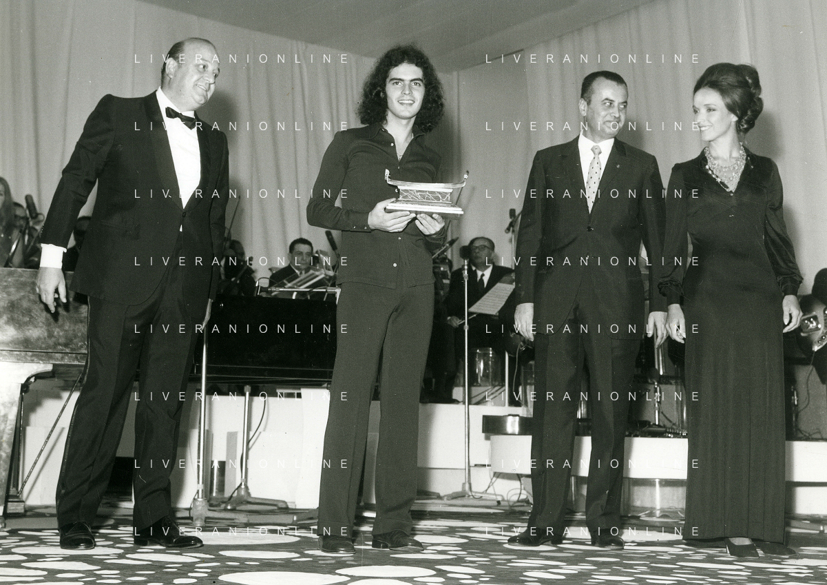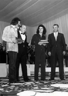 RETROSPETTIVA GIULIANO ILLIANI PSEUDONIMO DONATELLO CANTANTE NELLA FOTO GIULIANO ILLIANI -Georges Moustaki- GIANNI RAVERA A VENEZIA GONDOLA D'ORO FOTO GINO BALDAN-AG ALDO LIVERANI SAS
