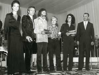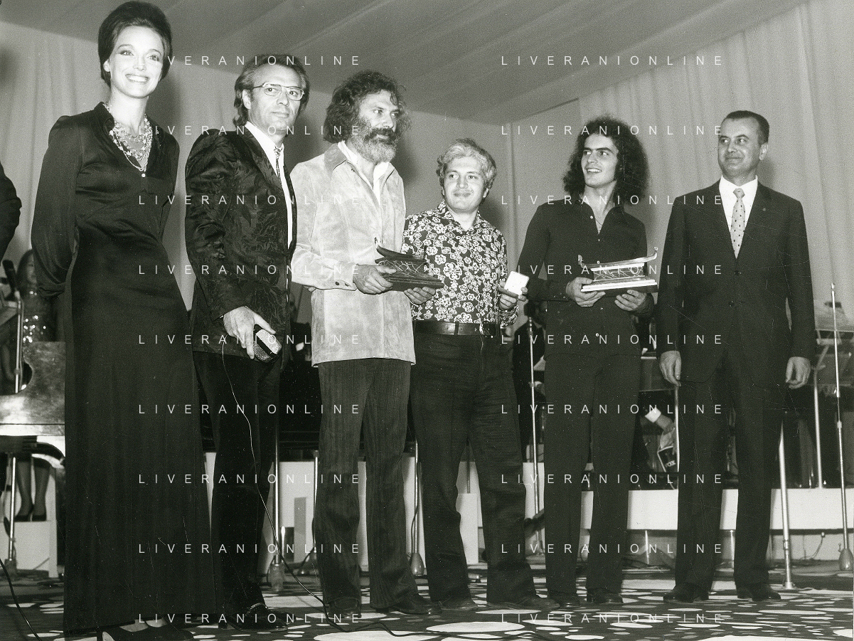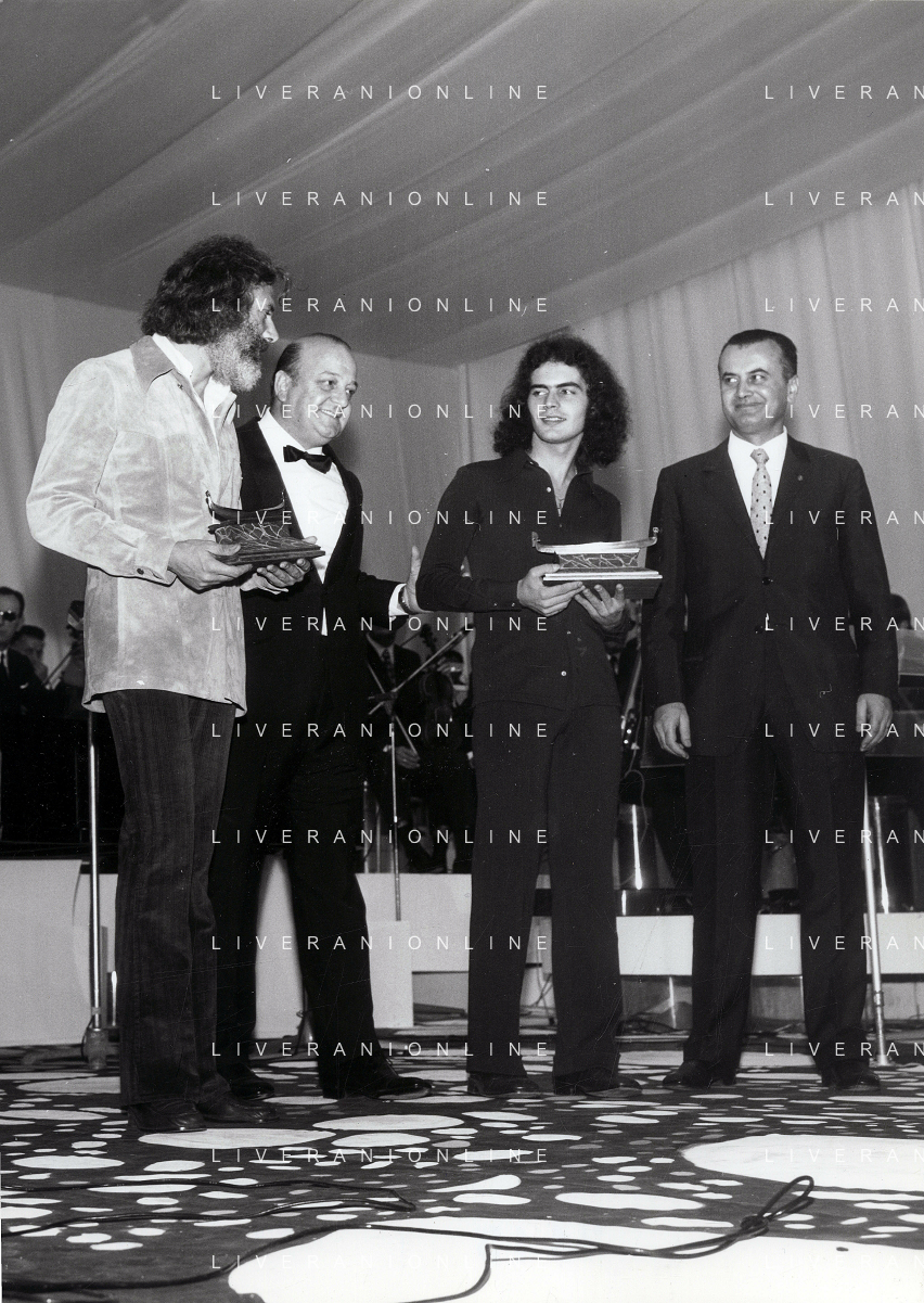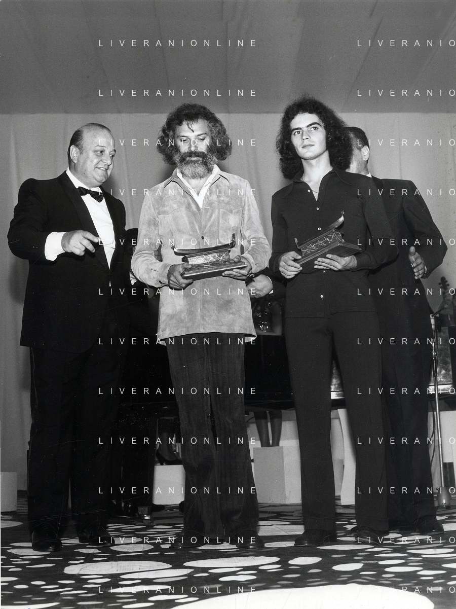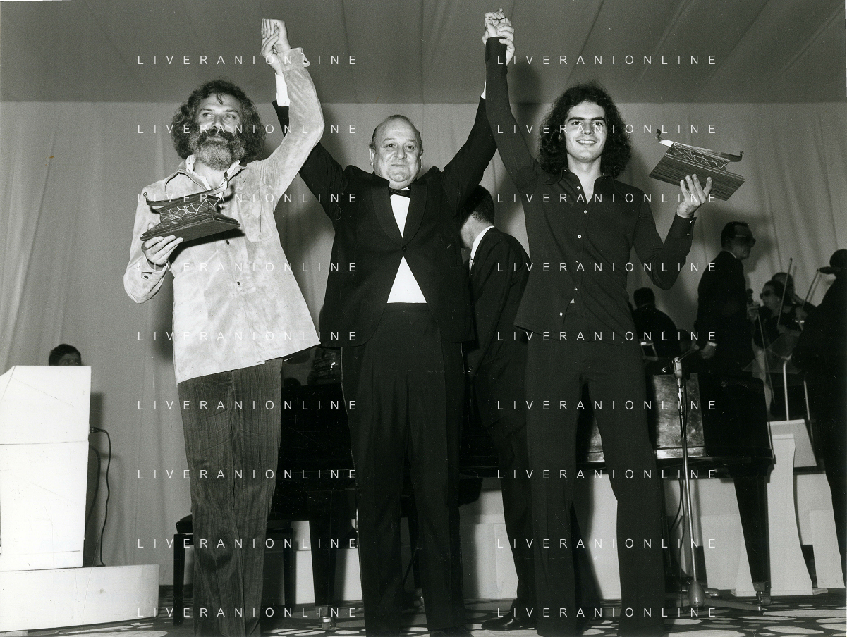 RETROSPETTIVA GIULIANO ILLIANI PSEUDONIMO DONATELLO CANTANTE NELLA FOTO GIULIANO ILLIANI -Georges Moustaki- GIANNI RAVERA A VENEZIA GONODLA D'ORO FOTO GINO BALDAN-AG ALDO LIVERANI SAS