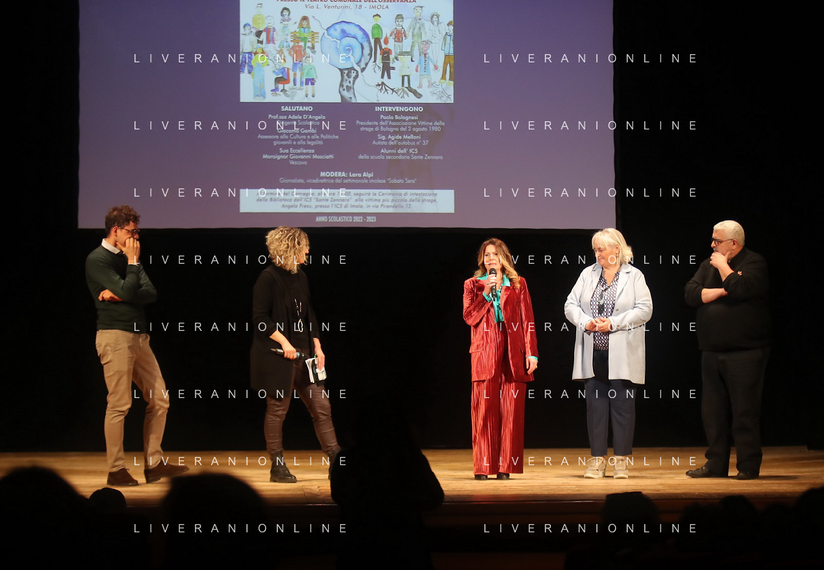 IMOLA 23 03 2023 TEATRO OSSERVANZA INCONTRO SUL 2 AGOSTO 1980 STRAGE STAZIONE DI BOLOGNA NELLA FOTO ASSESSORE GIACOMO GAMBI LARA ALPI ADELE D'ANGELO E VESCOVO DI IMOLA GIOVANNI MOSCIATTI FOTO GIANNI SANNA-AG ALDO LIVERANI SAS