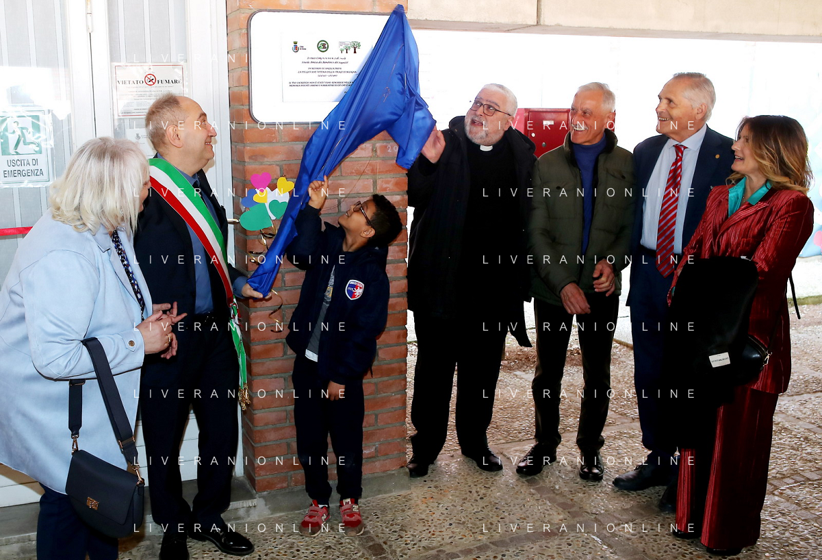IMOLA 23 03 2023 INAUGURAZIONE DELLA BIBLIOTECA DELL'IC5 SANTE ZENNARO E ALLA VITTIMA PIU' PICCOLA DELLA STRAGE 2 AGOSTO ANGELA FRESU NELLA FOTO SCOPRIMENTO DELLA TARGA CON VISE SINDACO FABRIZIO CASTELLARI VESCOVO GIOVANNI MOSCIATTI ADELE D'ANGELO PRESIDE SCUOLA SANTE ZENNARO FOTO GIANNI SANNA-AG ALDO LIVERANI SAS