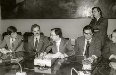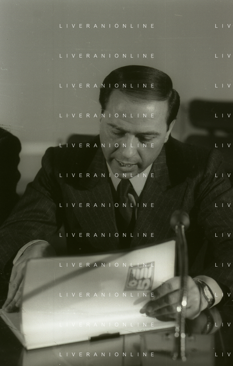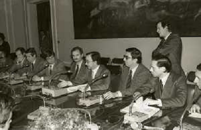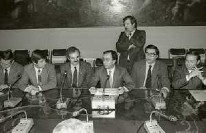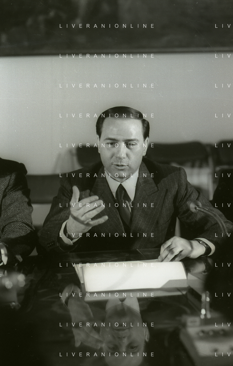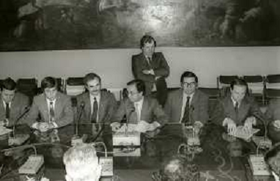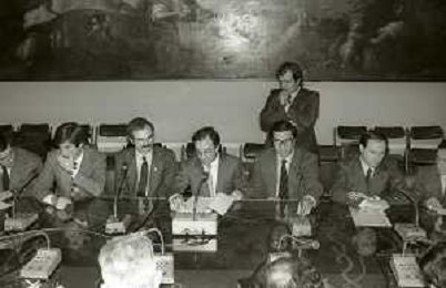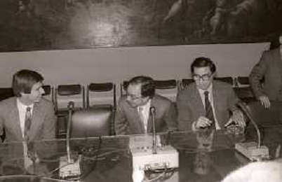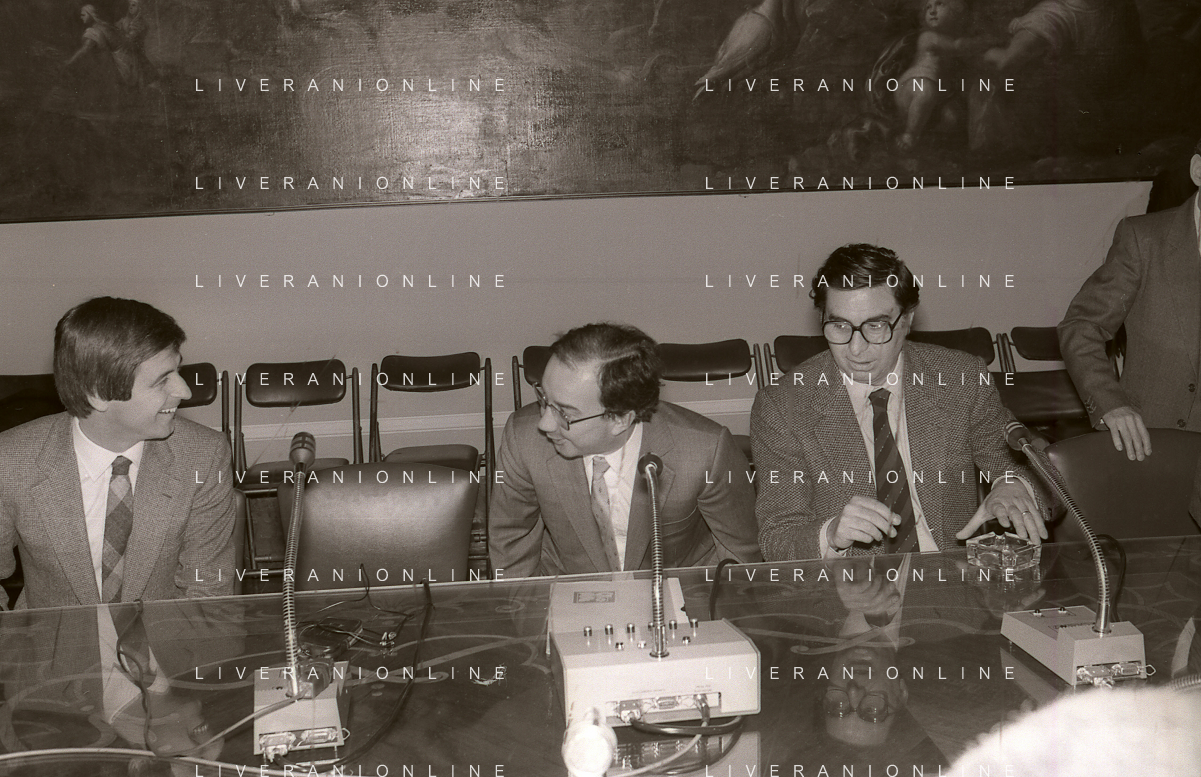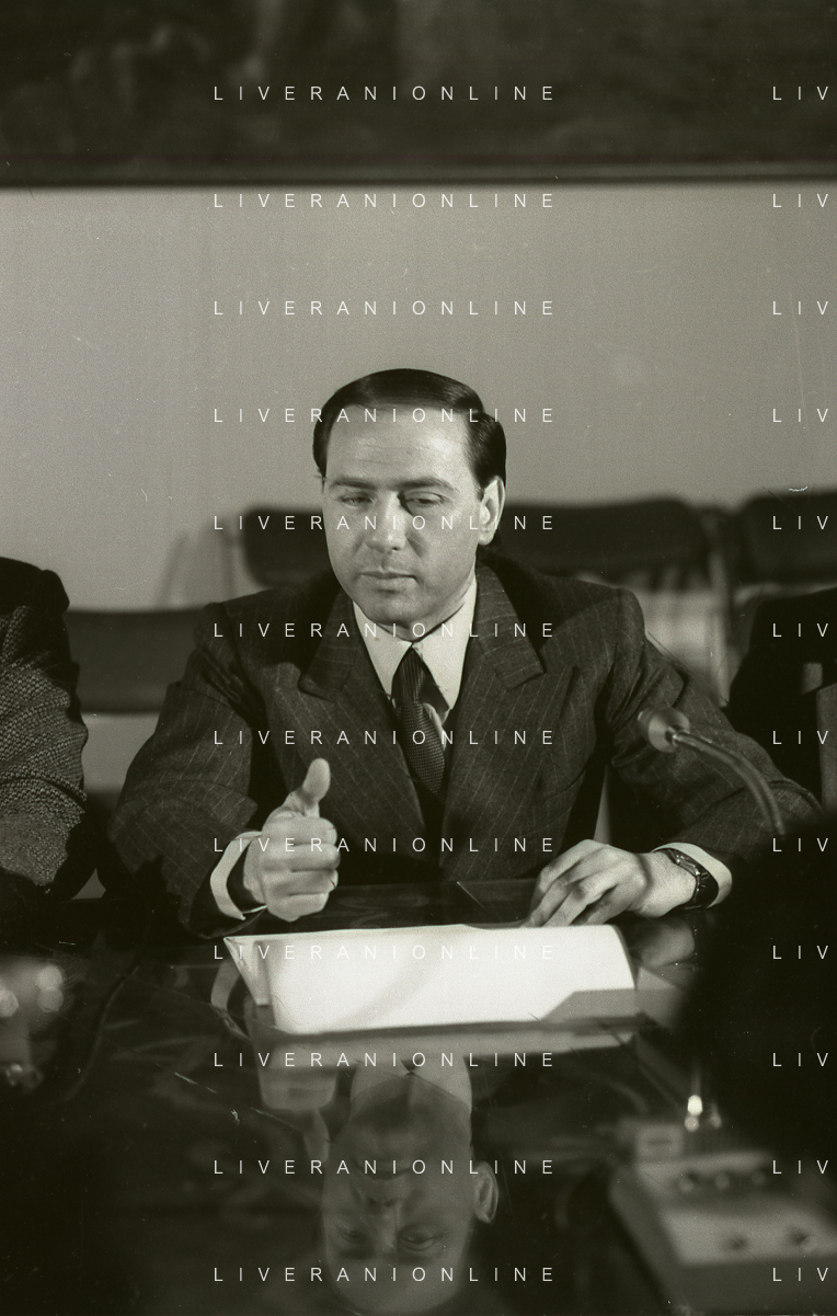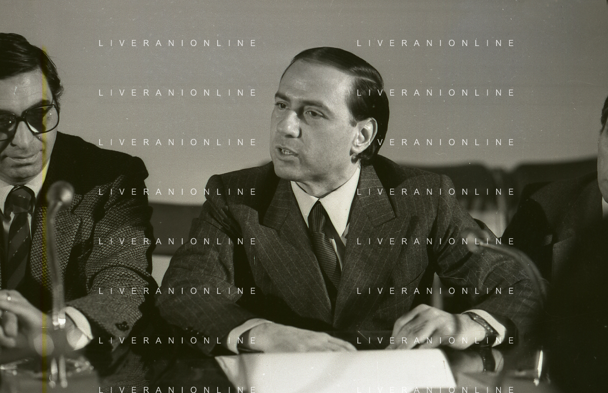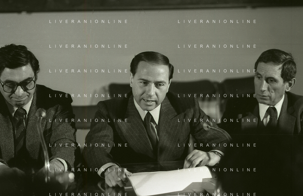 RETROSPETTIVA SILVIO BERLUSCONI IMPRENDITORE NELLA FOTO IL SINDACO CARLO TOGNOLI E GAETANO MORAZZONI A PALAZZO MARINO A MILANO NELL'ANNO 1980-1981 AG ALDO LIVERANI SAS
