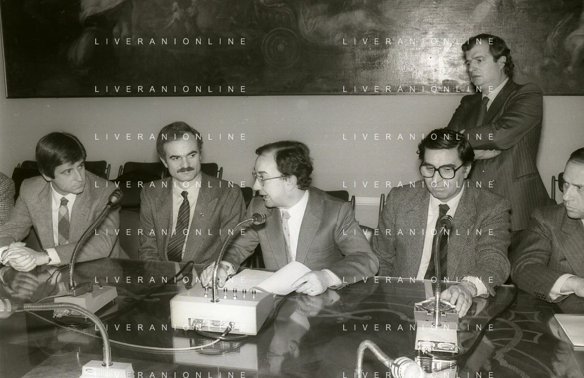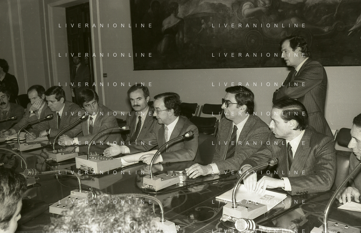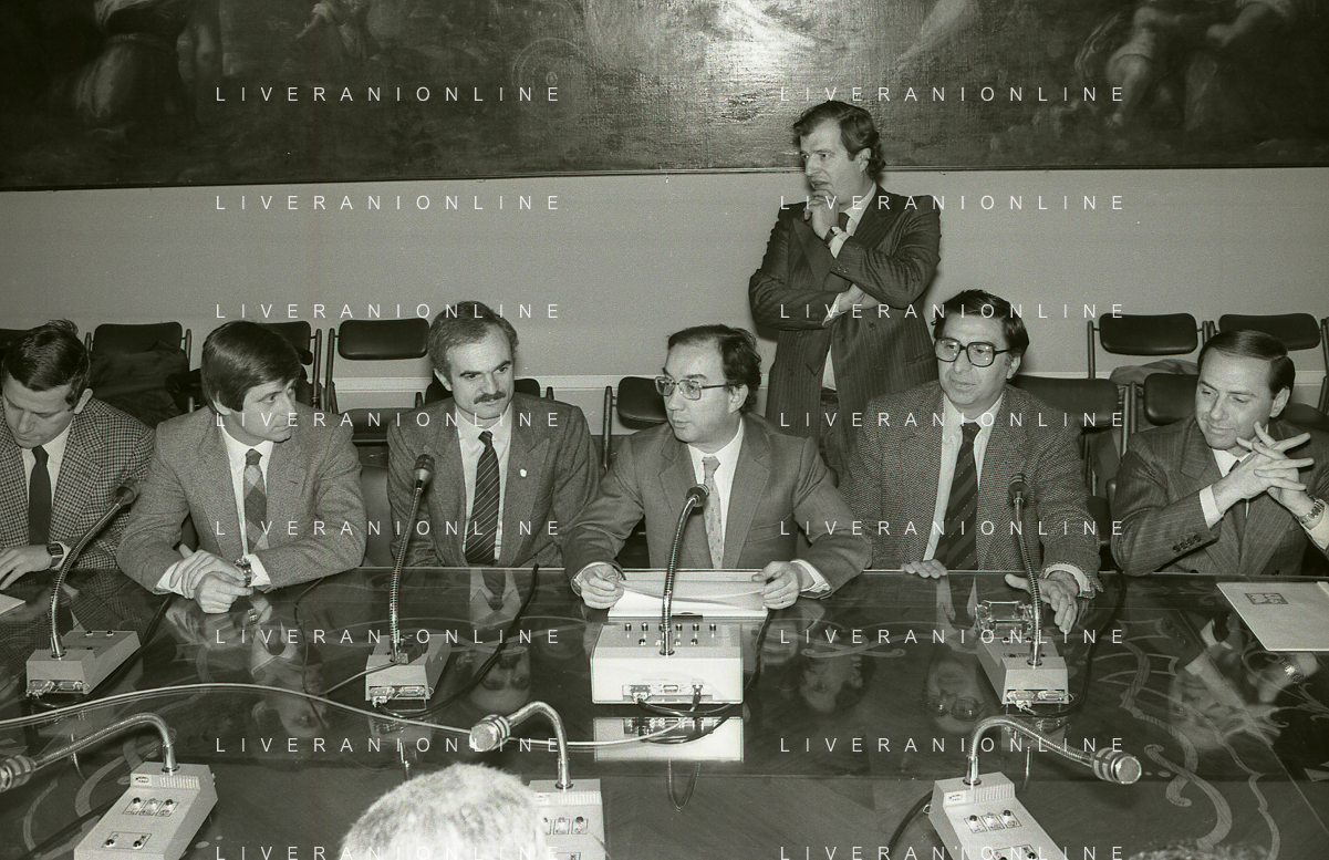 RETROSPETTIVA SILVIO BERLUSCONI IMPRENDITORE NELLA FOTO GIANNI RIVERA-SANDRO MAZZOLA-IL SINDACO CARLO TOGNOLI-GAETANO MORAZZONI E SILVIO BERLUSCONI A PALAZZO MARINO A MILANO NELL'ANNO 1980-1981 AG ALDO LIVERANI SAS